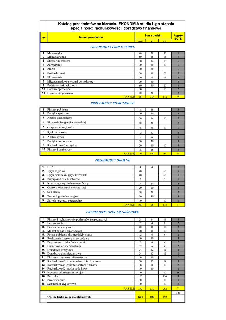 Katalog przedmiotów na kierunku EKONOMIA studia I -go stopnia specjalność: rachunkowość i doradztwo finansowe Lp. Suma godzin Nazwa przedmiotu Punkty ECTS razem w. ćw. 60 60 30 46 30 14 8 8 30 30 14 20 16 10 5 6 30 30 30 10 20 7 20 6 14 3 30 60 10 30 390 30 40 30 256 18 16 18 16 3 Finanse publiczne Polityka społeczna Analiza ekonomiczna 30 14 4 Ekonomia integracji europejskiej 30 30 5 Gospodarka regionalna 46 30 6 Rynki finansowe 12 12 2 18 30 18 30 4 3 20 10 10 5 18 238 18 196 42 3 38 4 60 60 4 60 60 1 8 8 2 1 PRZEDMIOTY PODSTAWOWE Matematyka Mikroekonomia Statystyka opisowa 4 Zarządzanie 5 Prawo 6 Rachunkowość 7 Ekonometria 8 Międzynarodowe stosunki gospodarcze 9 Podstawy makroekonomii 10 Badania operacyjne 11 Historia Gospodarcza 1 2 3 RAZEM: 6 20 10 134 5 6 2 3 59 PRZEDMIOTY KIERUNKOWE 1 2 Analiza rynku 8 Polityka gospodarcza 9 Rachunkowość zarządcza 10 Finanse i bankowość 7 RAZEM: 3 3 16 5 5 16 5 PRZEDMIOTY OGÓLNE 1. 2. 3. 4. 5. 6. 7. BHP Język angielski Język niemiecki / język hiszpański Przysposobienie bilioteczne Klastering - wykład monograficzny Ochrona własności intelektualnej Socjologia 2 8. Technologie informacyjne 9. Zajęcia terenowo-rekreacyjne 14 14 3 20 20 3 30 30 3 30 30 3 10 RAZEM: 10 1 98 132 31 28 12 20 20 12 10 12 12 24 24 10 30 18 10 10 120 10 10 14 4 10 10 6 10 6 6 12 12 10 12 8 10 14 8 10 10 6 10 120 10 10 3 2 3 3 2 3 2 2 2 2 2 3 2 2 10 5 1 3 392 130 262 52 230 PRZEDMIOTY SPECJALNOŚCIOWE 1. 2. 3. 4. 5. 6. 7. 8. 9. 10. 11. 12. 13. 14. 15. 16. 17. 18. Finanse i rachunkowość podmiotów gospodarczych Finanse osobiste Finanse samorządowe Marketing usług finansowych Pomoc publiczna dla przedsiębiorstwa Rozliczenia finasowe w gospodarce Zagraniczne źródła finansowania Budżetowanie w controllingu Doradztwo kredytowe Doradztwo ubezpieczeniowe Finansowe systemy informatyczne Rachunkowość i sprawozdawczość finansowa Rachunkowość jednostek sektora finansów Rachunkowość i audyt podatkowy Kowersatorium egzaminacyjne Praktyka Proseminarium Seminarium dyplomowe RAZEM: 6 6 12 12 18 10 180 Ogólna liczba zajęć dydaktycznych 1250 680 570