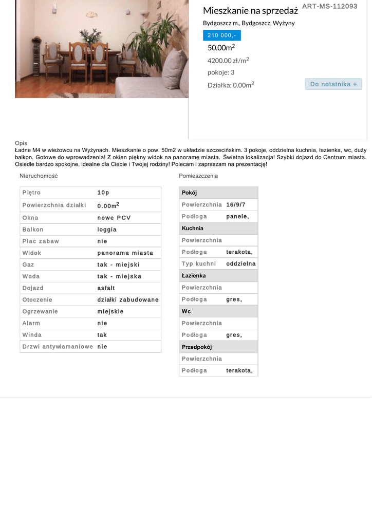 Mieszkanie na sprzedaż ART-MS-112093 Bydgoszcz m., Bydgoszcz, Wyżyny 210 000,- 50.00m2 4200.00 zł/m2 pokoje: 3 Działka: 0.00m2 Do notatnika + Opis Ładne M4 w wieżowcu na Wyżynach. Mieszkanie o pow. 50m2 w układzie szczecińskim. 3 pokoje, oddzielna kuchnia, łazienka, wc, duży balkon. Gotowe do wprowadzenia! Z okien piękny widok na panoramę miasta. Świetna lokalizacja! Szybki dojazd do Centrum miasta. Osiedle bardzo spokojne, idealne dla Ciebie i Twojej rodziny! Polecam i zapraszam na prezentację! Nieruchomość Pomieszczenia P ię t r o 10p Pokój P o w i e r z c h n i a d z i ał k i 0 . 0 0 m2 Powierzchnia 16/9/7 Okna nowe PCV P o dł o g a Balkon loggia Kuchnia Plac zabaw nie Powierzchnia Widok panorama miasta P o dł o g a terakota, Gaz tak - miejski Typ kuchni oddzielna Woda tak - miejska Łazienka Dojazd asfalt Powierzchnia Otoczenie d z i ał k i z a b u d o w a n e P o dł o g a Ogrzewanie miejskie Wc Alarm nie Powierzchnia Winda tak P o dł o g a D r z w i a n t y wł a m a n i o w e n i e panele, gres, gres, Przedpokój Powierzchnia P o dł o g a terakota,