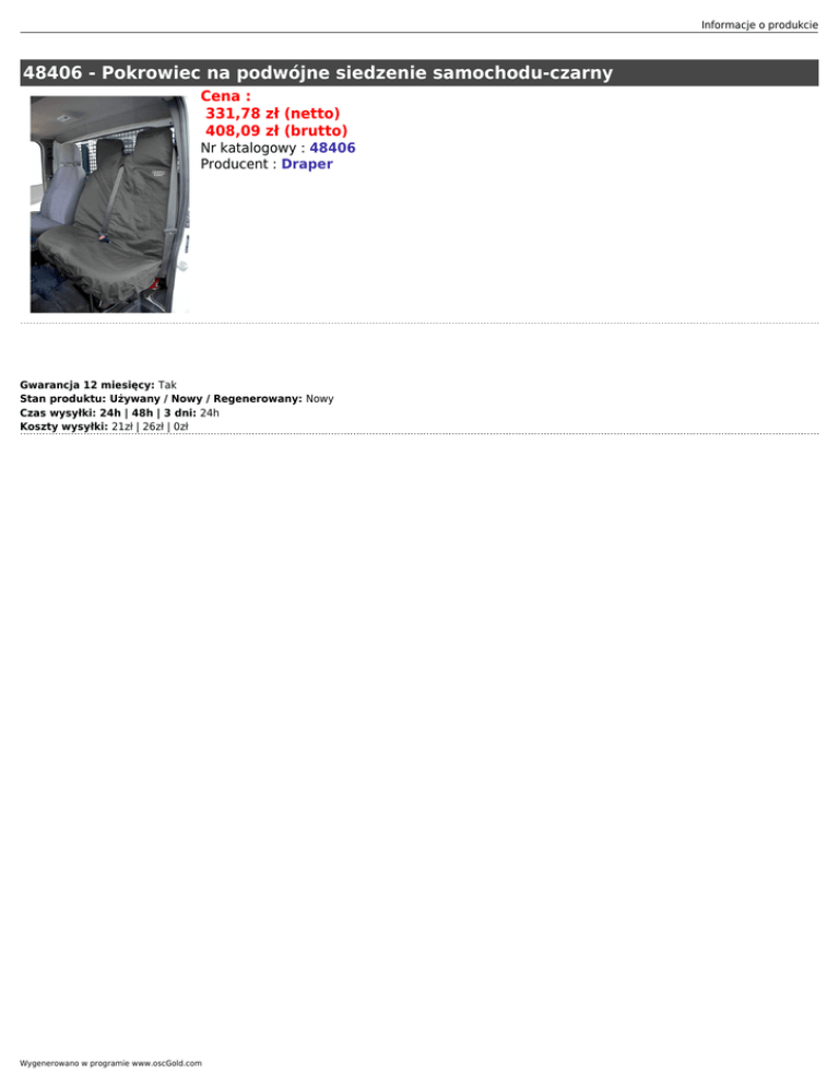 Informacje o produkcie 48406 - Pokrowiec na podwójne siedzenie samochodu-czarny Cena : 331,78 zł (netto) 408,09 zł (brutto) Nr katalogowy : 48406 Producent : Draper Gwarancja 12 miesięcy: Tak Stan produktu: Używany / Nowy / Regenerowany: Nowy Czas wysyłki: 24h | 48h | 3 dni: 24h Koszty wysyłki: 21zł | 26zł | 0zł Wygenerowano w programie www.oscGold.com