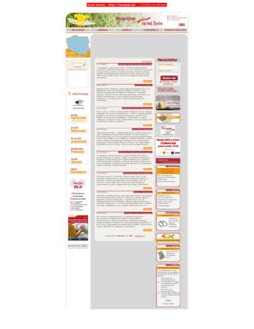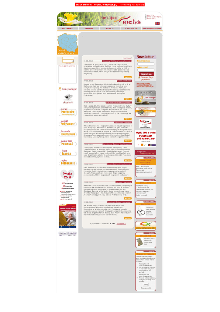 Zrzut strony: http://hospicja.pl/ <--kliknij na adresie PO CZTA STRO NA DO MO WA ULUBIO NE [archiwum] 31.10.2012 SZUKA J Fundacja Hospicyjna Kołobrzeg. Zbiórka na budowę hospicjum 1 listopada w godzinach 9.00 - 17.00 na kołobrzeskim cmenatrzu będą zbierane datki na rzecz budowy hospicjum stacjonarnego. Wraz z wolontariuszami, udział w zbiórce wezmą przewdstawiciele lokalnych władz, posłowie oraz wiele innych osób, które chcą w ten sposób wesprzeć tę inicjatywę. 30.10.2012 Kielce. Pola Nadziei Rabata przed Zespołem Szkół Ogólnokształcących nr 8 w Białogonie stała się miejscem sadzenia żonkili, a tym samym inauguracji Pól Nadziei w Kielcach. Pieniądze zebrane wiosną C aritas Diecezji Kieleckiej przeznaczu na budowę pierwszego w tym mieście stacjonarnego hospicjum, przy parafii p.w. Miłosierdzia Bożego na C zarnowie. 26.10.2012 Newsletter Imię i nazwisko: Adres e-mail: Zapisz się! Dbamy o Twoją prywatność Newsletter wydają Fundacja Hospicyjna i Fundacja Lubię Pomagać Czechowice. Koncert niespodzianka Dziś o godz. 17.00 w czechowickim Miejskim Domu Kultury odbędzie się koncert charytatywny. Jest on częścią działań, podjetych w ramach kampanii Hospicjum to też Życie. Wstęp na koncert jest bezpłatny. Kogo będzie można zobaczyć i usłyszeć? Tego organizatorzy nie ujawniają, ale z pewnością warto sprawdzić. 26.10.2012 Piła. Mozart kameralnie "Mozart kameralnie - najpiękniejsze arie i duety operowe z oper Wolfganga Amadeusza Mozarta" to tytuł koncertu charytatywnego na rzecz budowy hospicjum stacjonarnego w Pile, który odbył się w sobotę w Teatrze Miejskim. Goście mogli obejrzeć wizualizację hospicjum oraz prezentację dotyczącą Towarzystwa Pomocy C horym im. Sługi Bożej Stanisławy Leszczyńskiej, które koncert zorganizowało. 25.10.2012 Szczekociny. Światowy Dzień Hospicjów Z inicjatywy Stowarzyszenia Opieki Paliatywnej Ziemi Zawierciańskiej w miniony piątek uroczyście obchodzono Światowy Dzień Hospicjów i Opieki Paliatywnej. Zebrani mogli wysłuchać wykładu na temat idei opieki paliatywnej oraz działalności szkolnych wolontariackich kół. Posadzono również żonkile, symbol nadziei. 23.10.2012 Poznań. Będzie większe hospicjum Dwa lata starań o fundusze zaowocowały tym, że już niedługo rozpocznie się rozbudowa Hospicjum Palium w Poznaniu. Dzięki niej placówka zyska miejsca dla 13 chorych. Prace udało się rozpocząć dzięki wsparciu poznaniaków, którzy zagłosowali na projekt rozbudowy. 23.10.2012 Darłowo. Pola Nadziei Wrzesień i październik to czas sadzenia żonkili, rozpoczęcia corocznej akcji Pola Nadziei. Kolejną ich edycję otwarto również w Domu Hospicyjno – Opiekuńczym im. Bp. C zesława Domina w Darłowie. Akcję zorganizował nowy dyrektor hospicjum - ks. Krzysztof Sendecki wraz z kołem „C aritas" działającym przy Szkole Podstawowej nr 3. 22.10.2012 Włocławek. Debata o komunikacji We wtorek 16 października w siedzibie Hospicjum Domowego we Włocławku odbyła się debata pt.: Komunikacja w opiece medycznej. Spotkanie zostało zorganizowane w ramach IX edycji kampanii Hospicjum to też Życie. Organizatorem debaty było Polskie Towarzystwo Opieki Paliatywnej Oddział we Włocławku. POLEC AMY Do obejrzenia, przeczytania, wysłuchania Film "Hospicjum widziane od środka" Pomoc dla osieroconych dzieci AKC JE ZAPRASZAMY Kampania 2011 1% dla hospicjów Więźniowie w hospicjum Fundusz dla dzieci osieroconych Lubię pomagać BIBLIOTEKA POC ZYTAJ medycyna psychologia opieka duchowa eutanazja « poprzednia Strona 1 z 225 następna » EXTRA ZOBAC Z TEŻ Wirtualny znicz ogłoszenia pożegnania linki SONDA Prawda czy nadzieja Czy pytającemu o swój stan zdrowia umierającemu człowiekowi należy mówić prawdę? Raczej tak lub zdecydowanie tak. Utrzymywanie chorego w niewiedzy przynosi więcej szkód niż korzyści. Raczej nie lub zdecydowanie nie. Prawda zabija nadzieję, a ta jest ważniejsza od prawdy. Głosuj Zobacz wyniki Zrzut strony: http://hospicja.pl/ <--kliknij na adresie Kontakt: Fundacja Hospicyjna (KRS 0000201002), [email protected], 0 58 345 9060 ©2005 Hospicjum to też Życie. Wszelkie prawa zastrzeżone. Autorem znaku graficznego kampanii: Hospicjum to też Życie, jest Małgorzata Urbańska.