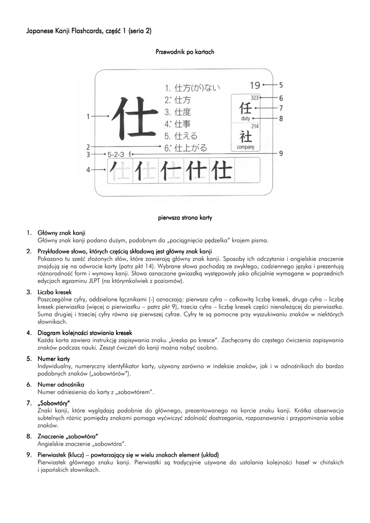 Japanese Kanji Flashcards Flashcards, lashcards, część 1 (seria 2) Przewodnik po kartach pierwsza strona karty 1. Główny znak kanji Główny znak kanji podano dużym, podobnym do „pociągnięcia pędzelka” krojem pisma. 2. Przykładowe słowa, słowa, których częścią składową składową jest główny znak kanji Pokazano tu sześć złożonych słów, które zawierają główny znak kanji. Sposoby ich odczytania i angielskie znaczenie znajdują się na odwrocie karty (patrz pkt 14). Wybrane słowa pochodzą ze zwykłego, codziennego języka i prezentują różnorodność form i wymowy kanji. Słowa oznaczone gwiazdką występowały jako oficjalnie wymagane w poprzednich edycjach egzaminu JLPT (na którymkolwiek z poziomów). 3. Liczba kresek Poszczególne cyfry, oddzielone łącznikami (−) oznaczają: pierwsza cyfra – całkowitą liczbę kresek, druga cyfra – liczbę kresek pierwiastka (więcej o pierwiastku – patrz pkt 9), trzecia cyfra – liczbę kresek części nienależącej do pierwiastka. Suma drugiej i trzeciej cyfry równa się pierwszej cyfrze. Cyfry te są pomocne przy wyszukiwaniu znaków w niektórych słownikach. 4. Diagram kolejności stawiania kresek Każda karta zawiera instrukcję zapisywania znaku „kreska po kresce”. Zachęcamy do częstego ćwiczenia zapisywania znaków podczas nauki. Zeszyt ćwiczeń do kanji można nabyć osobno. 5. Numer karty Indywidualny, numeryczny identyfikator karty, używany zarówno w indeksie znaków, jak i w odnośnikach do bardzo podobnych znaków („sobowtórów”). 6. Numer odnośnika Numer odniesienia do karty z „sobowtórem”. 7. „Sobowtóry” Znaki kanji, które wyglądają podobnie do głównego, prezentowanego na karcie znaku kanji. Krótka obserwacja subtelnych różnic pomiędzy znakami pomaga wyćwiczyć zdolność dostrzegania, rozpoznawania i przypominania sobie znaków. 8. Znaczenie „sobowtóra” Angielskie znaczenie „sobowtóra”. 9. Pierwiastek (klucz) – powtarzający się w wielu znakach element (układ) Pierwiastek głównego znaku kanji. Pierwiastki są tradycyjnie używane do ustalania kolejności haseł w chińskich i japońskich słownikach. druga strona karty 10. Zapożyczone e z języka chińskiego czytanie „on” (on− 10. Zapożyczon (on−yomi) Chińskie czytania głównego znaku kanji są zapisane katakaną. 11. 11. Japońskie czytanie „kun” (kun− (kun−yomi) Hiraganą zapisano czytania głównych znaków kanji zatwierdzone przez japońskie Ministerstwo Edukacji (tzw. Joyo−yomi). W kilku przypadkach oficjalne czytania były zbyt liczne, aby wymienić je wszystkie. 12. 12. Znaczenie znaku kanji w języku angielskim Przedstawiono tutaj najpowszechniejsze znaczenia znaku kanji. 13. 13. Schematyka części składowych znaku (tylko (tylko w częściach 1 i 2) Przedstawiono tutaj za pomocą diagramów układ niektórych (bardziej złożonych) znaków kanji w rozbiciu na poszczególne elementy. Diagramy i związane z nimi angielskie znaczenia (patrz pkt 15) prezentowane są tylko jako pomoc w zapamiętywaniu i nie zawsze są dokładnym odzwierciedleniem prawdziwej genezy znaku. 14. 14. Czytanie i znaczenie przykładowych słów ze znakiem kanji Po przedstawionym hiraganą japońskim czytaniu słowa złożonego podano jego znaczenie w języku angielskim. 15. 15. Znaczenie części składowych znaku Znaczenie znaku kanji lub pierwiastka będących częściami składowymi głównego znaku (patrz pkt 13). 16. 16. Wykres postępów w nauce Wskaźnik na wykresie postępów w nauce pokazuje położenie aktualnie studiowanej karty w obrębie części 1 „Japanese Kanji Flashcards”. Krańcowe położenie po lewej stronie oznacza pierwszą kartę w zestawie (1), krańcowe położenie po prawej stronie – ostatnią kartę w zestawie (300).