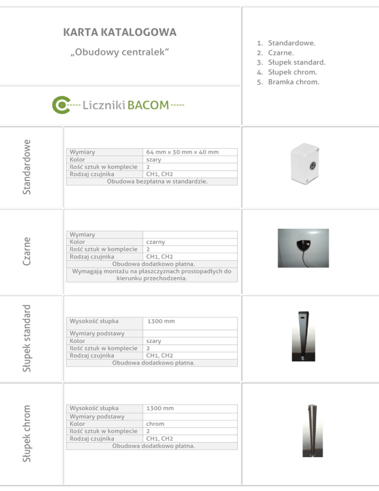 KARTA KATALOGOWA Słupek chrom Słupek standard Czarne Standardowe „Obudowy centralek” Wymiary 64 mm x 30 mm x 40 mm Kolor szary Ilość sztuk w komplecie 2 Rodzaj czujnika CH1, CH2 Obudowa bezpłatna w standardzie. Wymiary Kolor czarny Ilość sztuk w komplecie 2 Rodzaj czujnika CH1, CH2 Obudowa dodatkowo płatna. Wymagają montażu na płaszczyznach prostopadłych do kierunku przechodzenia. Wysokość słupka 1300 mm Wymiary podstawy Kolor szary Ilość sztuk w komplecie 2 Rodzaj czujnika CH1, CH2 Obudowa dodatkowo płatna. Wysokość słupka 1300 mm Wymiary podstawy Kolor chrom Ilość sztuk w komplecie 2 Rodzaj czujnika CH1, CH2 Obudowa dodatkowo płatna. 1. 2. 3. 4. 5. Standardowe. Czarne. Słupek standard. Słupek chrom. Bramka chrom. Bramka chrom Wysokość bramki 1300 mm Szerokść bramki 200 mm Wymiary podstawy Kolor chrom Ilość sztuk w komplecie 2 Rodzaj czujnika CH1, CH2 Obudowa dodatkowo płatna. Bacom Bartosz Wesołowski 41-200 Sosnowiec, ul. Kołłątaja 6a tel.:32 445 35 75, fax: 32 445 03 99 e-mail: [email protected] www.bacom.pl Uwaga! Ten symbol na produkcie lub jego opakowaniu oznacza, że produktu nie wolno wyrzucać do zwykłych pojemników na odpady. Obowiązkiem użytkownika jest przekazanie zużytego sprzętu do wyznaczonego punktu zbiórki w celu recyklingu odpadów powstałych ze sprzętu elektrycznego i elektronicznego. Osobna zbiórka oraz recykling zużytego sprzętu pomogą w ochronie zasobów naturalnych i zapewnią ponowne wprowadzenie go do obiegu w sposób chroniący zdrowie człowieka i środowisko. Aby uzyskać więcej informacji o tym, gdzie można przekazać zużyty sprzęt do recyklingu, należy się skontaktować z urzędem miasta, zakładem gospodarki odpadami lub sklepem, w którym zakupiono produkt.