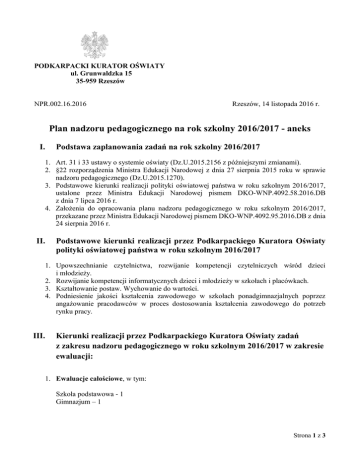 PODKARPACKI KURATOR OŚWIATY ul. Grunwaldzka 15 35-959 Rzeszów NPR.002.16.2016 Rzeszów, 14 listopada 2016 r. Plan nadzoru pedagogicznego na rok szkolny 2016/2017 - aneks I. Podstawa zaplanowania zadań na rok szkolny 2016/2017 1. Art. 31 i 33 ustawy o systemie oświaty (Dz.U.2015.2156 z późniejszymi zmianami). 2. §22 rozporządzenia Ministra Edukacji Narodowej z dnia 27 sierpnia 2015 roku w sprawie nadzoru pedagogicznego (Dz.U.2015.1270). 3. Podstawowe kierunki realizacji polityki oświatowej państwa w roku szkolnym 2016/2017, ustalone przez Ministra Edukacji Narodowej pismem DKO-WNP.4092.58.2016.DB z dnia 7 lipca 2016 r. 4. Założenia do opracowania planu nadzoru pedagogicznego w roku szkolnym 2016/2017, przekazane przez Ministra Edukacji Narodowej pismem DKO-WNP.4092.95.2016.DB z dnia 24 sierpnia 2016 r. II. Podstawowe kierunki realizacji przez Podkarpackiego Kuratora Oświaty polityki oświatowej państwa w roku szkolnym 2016/2017 1. Upowszechnianie czytelnictwa, rozwijanie kompetencji czytelniczych wśród dzieci i młodzieży. 2. Rozwijanie kompetencji informatycznych dzieci i młodzieży w szkołach i placówkach. 3. Kształtowanie postaw. Wychowanie do wartości. 4. Podniesienie jakości kształcenia zawodowego w szkołach ponadgimnazjalnych poprzez angażowanie pracodawców w proces dostosowania kształcenia zawodowego do potrzeb rynku pracy. III. Kierunki realizacji przez Podkarpackiego Kuratora Oświaty zadań z zakresu nadzoru pedagogicznego w roku szkolnym 2016/2017 w zakresie ewaluacji: 1. Ewaluacje całościowe, w tym: Szkoła podstawowa - 1 Gimnazjum – 1 Strona 1 z 3 2. Ewaluacje problemowe w zakresie wskazanym przez MEN (60% wszystkich ewaluacji w roku szkolnym 2016/2017 – liczba: 97), w tym: Lp. Zakres ewaluacji problemowej 1. Kształtowane są postawy i respektowane normy społeczne. Szkoła lub placówka wspomaga rozwój uczniów z uwzględnieniem ich indywidualnej sytuacji. Podmiot Liczba ewaluacji szkoły podstawowe gimnazja szkoły ponadgimnazjalne, w tym: licea ogólnokształcące technika zasadnicze szkoły zawodowe szkoły policealne, pomaturalne 41 45 2 4 3 2 3. Ewaluacje problemowe w zakresie wybranym przez Podkarpackiego Kuratora Oświaty (40% wszystkich ewaluacji w roku szkolnym 2016/2017 – liczba: 63) na podstawie wniosków z nadzoru pedagogicznego, w roku szkolnym 2015/2016, w tym: Lp. Zakres ewaluacji problemowej Podmiot Liczba ewaluacji 1. Dzieci są aktywne. 2. Uczniowie są aktywni. przedszkola inne formy wychowania przedszkolnego oddziały przedszkolne w szkołach podstawowych szkoły podstawowe gimnazja szkoły ponadgimnazjalne, w tym: licea ogólnokształcące technika zasadnicze szkoły zawodowe 8 0 0 29 25 IV. Lp. 1. 2. 3. 1 0 0 Tematyka kontroli planowych w szkołach i placówkach: Tematyka kontroli Prawidłowość organizacji i funkcjonowania biblioteki szkolnej. Realizacja kształcenia dualnego w ramach praktycznej nauki zawodu. Zgodność z przepisami prawa przeprowadzania postępowania rekrutacyjnego do przedszkoli na rok szkolny 2017/2018. Podmiot Liczba kontroli Publiczne: szkoły podstawowe gimnazja szkoły ponadgimnazjalne, w tym: licea ogólnokształcące technika zasadnicze szkoły zawodowe Publiczne: technika zasadnicze szkoły zawodowe 228 33 40 20 4 2 14 Publiczne: przedszkola inne formy wychowania przedszkolnego oddziały przedszkolne w szkołach podstawowych 99 9 12 Strona 2 z 3 V. W roku szkolnym 2016/2017 monitorowanie będzie obejmowało: 1. Sposób realizacji zadań z zakresu upowszechniania czytelnictwa, rozwijania kompetencji czytelniczych wśród dzieci i młodzieży w szkole podstawowej i gimnazjum. 2. Liczbę uczniów technikum i zasadniczej szkoły zawodowej realizujących kształcenie dualne w ramach praktycznej nauki zawodu. 3. Organizację pracy świetlicy w szkołach podstawowych i gimnazjach, w tym specjalnych. Podkarpacki Kurator Oświaty Małgorzata Rauch Strona 3 z 3