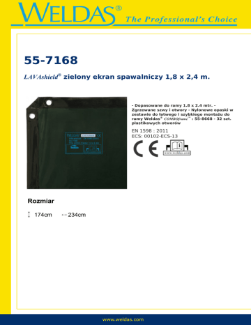 55-7168 LAVAshield® zielony ekran spawalniczy 1,8 x 2,4 m. - Dopasowane do ramy 1.8 x 2.4 mtr. Zgrzewane szwy i otwory - Nylonowe opaski w zestawie do łatwego i szybkiego montażu do ramy Weldas® COMBOframe™ : 55-8668 - 32 szt. plastikowych otworów EN 1598 : 2011 ECS: 00102-ECS-13 Rozmiar 174cm Powered by TCPDF (www.tcpdf.org) 234cm
