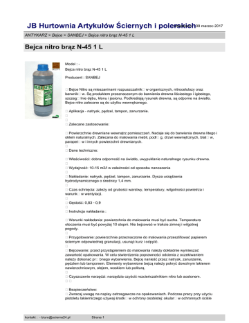 Utworzono : 08 marzec 2017 JB Hurtownia Artykułów Ściernych i polerskich ANTYKARZ > Bejce > SANBEJ > Bejca nitro brąz N-45 1 L Bejca nitro brąz N-45 1 L Model : Bejca nitro brąz N-45 1 L Producent : SANBEJ Bejce Nitro są mieszaninami rozpuszczalnik�w organicznych, nitrocelulozy oraz barwnik�w. Są produktem przeznaczonym do barwienia drewna liściastego i iglastego, szczeg�lnie dębu, klonu i jesionu. Podkreślają rysunek drewna, są odporne na światło. Bejce nitro zalecane są do użytku wewnętrznego. Aplikacja - natrysk, pędzel, tampon, zanurzanie. Zalecane zastosowanie: Powierzchnie drewniane wewnątrz pomieszczeń. Nadaje się do barwienia drewna litego i oklein naturalnych. Zalecana do malowania mebli, podł�g, drzwi wewnętrznych, blat�w, parapet�w i innych powierzchni drewnianych. Dane techniczne: Właściwości: dobra odporność na światło, uwypuklanie naturalnego rysunku drewna. Wydajność: 10-15 m2/l w zależności od sposobu nanoszenia Nakładanie: natrysk, pędzel, tampon, zanurzanie. Dysza urządzenia hydrodynamicznego o średnicy 1,4 mm. Czas schnięcia: zależy od grubości warstwy, temperatury, wilgotności powietrza i warunk�w wentylacji. Gęstość: 0,83 - 0,9 Instrukcja nakładania : Warunki nakładania: powierzchnia do malowania musi być sucha. Temperatura otoczenia musi być powyżej 10 stopni. Nie bejcować w trakcie zimnej i wilgotnej pogody. Przygotowanie: powierzchnie przeznaczone do malowania przeszlifować papierem ściernym odpowiedniej granulacji, usunąć kurz i odpylić. Bejcowanie: przed przystąpieniem do malowania należy dokładnie wymieszać zawartość opakowania. W celu stwierdzenia poprawności odcienia z oczekiwaniem należy dokonać pr�bnego wybarwienia. Bejcę nanieść przez natrysk, zanurzenie, pędzlem lub tamponem. Elementy wybarwione bejcą należy pokryć dowolnym lakierem nawierzchniowym, olejem, woskiem lub politurą. Czyszczenie narzędzi: narzędzia czyścić rozcieńczalnikiem nitro lub acetonem. � Bezpieczeństwo: Zwracaj uwagę na napisy ostrzegawcze na opakowaniach. Podczas pracy przy użyciu pistoletu lakierniczego używaj środk�w ochrony osobistej: okular�w ochronnych ściśle kontakt : - [email protected] Strona 1 Utworzono : 08 marzec 2017 JB Hurtownia Artykułów Ściernych i polerskich ANTYKARZ > Bejce > SANBEJ > Bejca nitro brąz N-45 1 L Bejca nitro brąz N-45 1 L przylegających do twarzy, maski lub p�łmaski, odzieży ochronnej bawełnianej (antyelektrostatycznej) i rękawic ochronnych. � UWAGA: Przedstawione w tym wzorniku kolory mają wyłącznie charakter poglądowy i nie mogą służyć jako wzorzec barw. Na ostateczny odcień mają wpływ m.in.: gatunek drewna, jego naturalne wybarwienie, chłonność oraz grubość naniesionych warstw lakier�w. � Cena : 25,01 zł Brutto ( 20,33 zł Netto) Dostępność: Produkt dostępny w naszym sklepie od 18 marzec 2014 kontakt : - [email protected] Strona 2