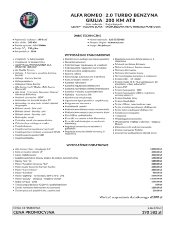 ALFA ROMEO 2.0 TURBO BENZYNA GIULIA 200 KM AT8 Kolor nadwozia: CZARNY - VULCANO BLACK Rodzaj tapicerki: SKÓRA BEŻOWA PIENO FIORE DLA PAKIETU LUX DANE TECHNICZNE • Pojemność skokowa : 1995 cm • Moc silnika : 200 KM • Średnie spalanie : 6.0 l/100km • Emisja CO2 : 138 g/km • Rok produkcji : 2016 • Numer nadwozia : 620 07525465 • Skrzynia biegów : Automatyczna • Napęd : Na jedną oś 3 WYPOSAŻENIE STANDARDOWE • 2 zagłówki na tylnej kanapie • 3-zagłowek na kanapie tylnej • ADAPTACJA WYPOSAŻENIA DLA ZIMNYCH KRAJÓW • Air Quality System • Airbags - 6 (kierowcy, pasażera, kurtyny, boczne) • Airbags - Kurtyny boczne • Airbags pasażera • Airbags przednie boczne • Alfa Connect 6,5'' (Radio, Mp3, Aux-in, Bluetooth) • Alfa DNA - Tryb jazdy: Dynamic/ Natural/ Advanced Efficiency • Asystent pasa ruchu - LDW • Automatyczna skrzynia biegów AT • Automatyczne włączanie świateł mijania i drogowych • Blokada drzwi - Safe Lock • Blokada drzwi - Security Lock • Blokada drzwi - Security Lock • Brak napisu wersji • Centralny zamek sterowany pilotem • Chłodzenie przedniego schowka • Czujnik deszczu • Czujnik monitorowania martwych pól • Czujnik pomiaru ciśnienia w oponach TPMS • Czujnik zapięcia pasów SBR • Czujnik zmierzchu • • • • • • • • • • • • • • • • • • • • • • Dezaktywacja Airbag'u po stronie pasażera Dywaniki welurowe Fotel kierowcy regulowany na wysokość Fotel pasażera regulowany na wysokość Fotele przednie podgrzewane Kamera cofania Klimatyzacja automatyczna 2-strefowa Koła ze stopów lekkich 17" Korektor reflekorów Lusterka regulowane elektrycznie Lusterka zewnętrzne elektrochromatyczne Lusterko w daszku z podświetleniem Naklejka - Assistance 24h Nawiewy na tylną kanapę Ogrzewane dysze przednich spryskiwaczy Podgrzewana kierownica Podłokietnik przedni Podświetlenie ledowe wnętrza samochodu Podświetlenie wnętrza przy otwarciu drzwi Port USB w podłokietniku Przyciski sterowania w kole kierownicy Przyciski wielofunkcyjne na ramionach kierownicy • Regulacja kierownicy na wysokość i głębokość • Regulacja manualna fotela kierowcy, 6stopniowa • Regulacja manualna fotela pasażera, 6stopniowa • Schowek po stronie kierowcy • Skóra techniczna / tkanina czarna • Skórzana kierownica • Skórzana kierownica luxury • Skrzynia biegów manualna, 6-stopniowa • System ASR - Hill Holder • System Audio Hi-Fi Plus (wzmacniacz, 10 głośników, w tym subwoofer) • System ESP • System hamowania - BAS • System hamowania (AEB) z czujnikiem ochrony pieszych • System Keyless Entry • System Stop&Start • Szyba z filtrem przeciwsłonecznym • Szyby przednie regulowane elektrycznie • Szyby tylne regulowane elektrycznie • Światła przeciwmgielne • Tempomat • Wspomaganie kierownicy • Wykończenie wnętrza w drewnie - brązowy Orzech • Zabezpieczenie podczas transportu • Zestaw naprawczy Fix&Go • Zewnętrzne podświetlenie klamek drzwi WYPOSAŻENIE DODATKOWE • • • • • • • • • • • • • • • Alfa Connect Nav - Nawigacja 8,8" Koła ze stopów lekkich 18" Lakier metalizowany Łopatki aluminiowe zmiany biegów do skrzyni automatycznej Opony Run Flat Pakiet "Asystent kierowcy Plus" Pakiet Audio Sound by Karman Kardon Pakiet "Convenience" Pakiet "Komfort" Pakiet "Lighting" - Bi-ksenony 35W z AFS i DRL Pakiet "Luxury" - stylizacja - brązowy Orzech Radio cyfrowe - DAB Tylna kanapa dzielona 40:20:40 z podłokietnikiem Zaciski hamulców lakierowane na czerwono Zestaw palących (popielniczka, zapalniczka) 10000.00 zł 4400.00 zł 4000.00 zł 1400.00 zł 1300.00 zł 5800.00 zł 6000.00 zł 2800.00 zł 900.00 zł 5300.00 zł 16000.00 zł 1350.00 zł 0.00 zł 1600.00 zł 220.00 zł Wartość wyposażenia dodatkowego: 61070 zł CENA CENNIKOWA CENA PROMOCYJNA 216 570 zł 190 582 zł Niniejsze ogłoszenie jest wyłącznie informacją handlową i nie stanowi oferty w myśl art. 66, § 1. Kodeksu Cywilnego. Sprzedający nie odpowiada za ewentualne błędy lub nieaktualność ogłoszenia.