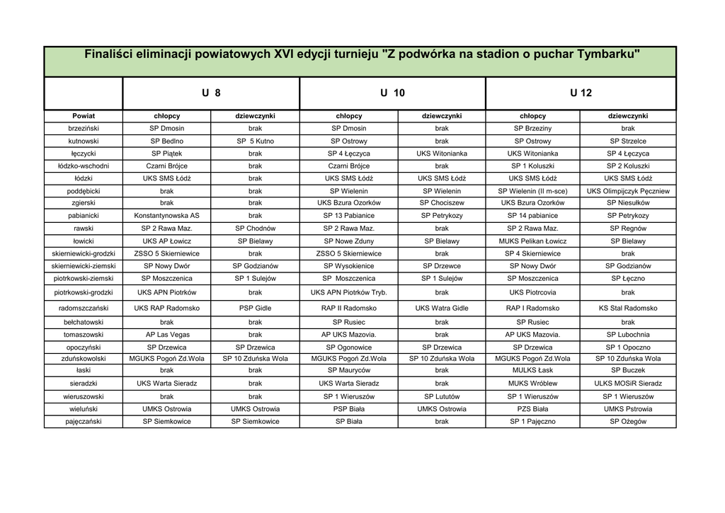 Finaliści eliminacji powiatowych XVI edycji turnieju "Z podwórka na stadion o puchar Tymbarku" U 8 Powiat chłopcy brzeziński SP Dmosin kutnowski SP Bedlno U 10 U 12 chłopcy dziewczynki chłopcy brak SP Dmosin brak SP Brzeziny brak SP 5 Kutno SP Ostrowy brak SP Ostrowy SP Strzelce dziewczynki dziewczynki łęczycki SP Piątek brak SP 4 Łęczyca UKS Witonianka UKS Witonianka SP 4 Łęczyca łódzko-wschodni Czarni Brójce brak Czarni Brójce brak SP 1 Koluszki SP 2 Koluszki łódzki UKS SMS Łódź brak UKS SMS Łódź UKS SMS Łódź UKS SMS Łódź UKS SMS Łódź poddębicki brak brak SP Wielenin SP Wielenin SP Wielenin (II m-sce) UKS Olimpijczyk Pęczniew zgierski brak brak UKS Bzura Ozorków SP Chociszew UKS Bzura Ozorków SP Niesułków pabianicki Konstantynowska AS brak SP 13 Pabianice SP Petrykozy SP 14 pabianice SP Petrykozy rawski SP 2 Rawa Maz. SP Chodnów SP 2 Rawa Maz. brak SP 2 Rawa Maz. SP Regnów łowicki UKS AP Łowicz SP Bielawy SP Nowe Zduny SP Bielawy MUKS Pelikan Łowicz SP Bielawy skierniewicki-grodzki ZSSO 5 Skierniewice brak ZSSO 5 Skierniewice brak SP 4 Skierniewice brak skierniewicki-ziemski SP Nowy Dwór SP Godzianów SP Wysokienice SP Drzewce SP Nowy Dwór SP Godzianów piotrkowski-ziemski SP Moszczenica SP 1 Sulejów SP Moszczenica SP 1 Sulejów SP Moszczenica SP Łęczno piotrkowski-grodzki UKS APN Piotrków brak UKS APN Piotrków Tryb. brak UKS Piotrcovia brak radomszczański UKS RAP Radomsko PSP Gidle RAP II Radomsko UKS Watra Gidle RAP I Radomsko KS Stal Radomsko bełchatowski brak brak SP Rusiec brak SP Rusiec brak tomaszowski AP Las Vegas brak AP UKS Mazovia. brak AP UKS Mazovia. SP Lubochnia opoczyński SP Drzewica SP Drzewica SP Ogonowice SP Drzewica SP Drzewica SP 1 Opoczno zduńskowolski MGUKS Pogoń Zd.Wola SP 10 Zduńska Wola MGUKS Pogoń Zd.Wola SP 10 Zduńska Wola MGUKS Pogoń Zd.Wola SP 10 Zduńska Wola łaski brak brak SP Mauryców brak MULKS Łask SP Buczek sieradzki UKS Warta Sieradz brak UKS Warta Sieradz brak MUKS Wróblew ULKS MOSiR Sieradz wieruszowski brak brak SP 1 Wieruszów SP Lututów SP 1 Wieruszów SP 1 Wieruszów wieluński UMKS Ostrowia UMKS Ostrowia PSP Biała UMKS Ostrowia PZS Biała UMKS Pstrowia pajęczański SP Siemkowice SP Siemkowice SP Biała brak SP 1 Pajęczno SP Oźegów