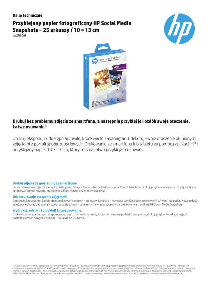 Dane techniczne Przyklejany papier fotograficzny HP Social Media Snapshots – 25 arkuszy / 10 × 13 cm (W2G60A) Drukuj bez problemu zdjęcia ze smartfona, a następnie przyklej je i ozdób swoje otoczenie. Łatwe usuwanie ! 1 Drukuj, eksponuj i udostępniaj chwile, które warto zapamiętać. Udekoruj swoje otoczenie ulubionymi zdjęciami z portali społecznościowych. Drukowanie ze smartfona lub tabletu za pomocą aplikacji HP i przyklejany papier 10 × 13 cm, który można łatwo przyklejać i usuwać . 1 Drukuj zdjęcia bezpośrednio ze smartfona 1 Łatwe drukowanie zdjęć z Facebooka, Instagramu i innych źródeł – bezpośrednio ze smartfona lub tabletu1. Drukuj, przyklejaj i eksponuj – a gdy zechcesz spróbować czegoś nowego, przyklejone zdjęcia można bez problemu usunąć. Udekoruj swoje otoczenie zdjęciami! Dodaj osobiste akcenty. Zapisuj spersonalizowane podpisy – lub ustaw istniejące – i wybieraj wyróżniające się ciekawymi barwami lub podstawowe układy zdjęć, aby opowiedzieć swoją historię. Łącz się z innymi osobami – na własny sposób – za pośrednictwem aplikacji HP Social Media Snapshots. Wydrukuj, oderwij i przyklej! Łatwe usuwanie. Drukuj w domu zdjęcia z portali społecznościowych. Uchwyć momenty, którymi chcesz się podzielić z innymi, wydrukuj, przyklej i wyeksponuj je, a następnie zastąp nowymi zdjęciami – są łatwe do usunięcia. Drukowanie lokalne wymaga podłączenia urządzenia mobilnego i drukarki do tej samej sieci lub bezpośredniego połączenia bezprzewodowego. Drukowanie mobilne z aplikacji HP Social Media Snapshots jest obsługiwane przez urządzenia iPhone®, iPad® oraz iPod touch® z systemem iOS w wersji v7.1 lub nowszej, wykorzystujące technologię AirPrint®. Drukowanie Android™ jest obsługiwane przez urządzenia z systemem Android w wersji v4.4 lub nowszej i może wymagać zainstalowania dodatkowego modułu ze sklepu Google Play™. Szczegółowe informacje na temat drukowania są dostępne na stronie hp.com/go/mobileprinting. AirPrint, Apple, iPhone, iPad oraz iPod touch są znakami towarowymi firmy Apple Inc. zarejestrowanymi na terenie USA i w innych krajach. Android i Google Play są znakami towarowymi firmy Google, Inc. 1 Dane techniczne | Przyklejany papier fotograficzny HP Social Media Snapshots – 25 arkuszy / 10 × 13 cm Informacje o zgodności Współpracuje z bezprzewodowymi drukarkami atramentowymi Dane techniczne produktu P/N W2G60A Opis Przyklejany papier fotograficzny HP Social Media Snapshots – 25 arkuszy / 10 × 13 cm Format nośnika 10 × 13 cm Gramatura mediów 265 g/m² Wykończenie Lekko błyszczący Liczba arkuszy 25 W opakowaniu 25 arkuszy przyklejanego papieru fotograficznego 10 × 13 cm Rozmiary opakowania produktu 161 × 115 × 22 mm Waga 0,12 kg Kod UPC 889899257166 Gwarancja Ten produkt HP objęty jest gwarancją oraz serwisem i pomocą techniczną Centrum Obsługi Klienta HP. Aby uzyskać więcej informacji na temat materiałów konsumpcyjnych HP, odwiedź http://www.hp.com Produkt może odbiegać wyglądem od widocznego na ilustracjach. © Copyright 2016 HP Development Company, L.P. Informacje zawarte w niniejszej publikacji mogą ulec zmianie bez uprzedzenia. Wszystkie gwarancje udzielane w odniesieniu do produktów i usług HP określone zostały w oświadczeniach gwarancyjnych, załączanych do każdego produktu i usługi. Żadne informacje przedstawione w niniejszym dokumencie nie powinny być interpretowane jako dodatkowa gwarancja. Firma HP nie ponosi odpowiedzialności za błędy techniczne lub redakcyjne oraz braki występujące w niniejszym dokumencie. 4AA6-5408PLE, Lipiec 2016