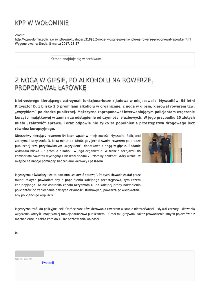 KPP W WOŁOMINIE Źródło: http://kppwolomin.policja.waw.pl/pw/aktualnosci/31895,Z-noga-w-gipsie-po-alkoholu-na-rowerze-proponowal-lapowke.html Wygenerowano: Środa, 8 marca 2017, 18:57 Strona znajduje się w archiwum. Z NOGĄ W GIPSIE, PO ALKOHOLU NA ROWERZE, PROPONOWAŁ ŁAPÓWKĘ Nietrzeźwego kierującego zatrzymali funkcjonariusze z Jadowa w miejscowości Myszadłów. 54-letni Krzysztof D. z blisko 2,5 promilami alkoholu w organizmie, z nogą w gipsie, kierował rowerem tzw. „wężykiem” po drodze publicznej. Mężczyzna zaproponował interweniującym policjantom wręczenie korzyści majątkowej w zamian za odstąpienie od czynności służbowych. W jego przypadku 20 złotych miało „załatwić” sprawę. Teraz odpowie nie tylko za popełnienie przestępstwa drogowego lecz również korupcyjnego. Nietrzeźwy kierujący rowerem 54-latek wpadł w miejscowości Myszadła. Policjanci zatrzymali Krzysztofa D. kilka minut po 18:00, gdy jechał swoim rowerem po drodze publicznej tzw. przysłowiowym „wężykiem”, dodatkowo z nogą w gipsie. Badanie wykazało blisko 2,5 promila alkoholu w jego organizmie. W trakcie przejazdu do komisariatu 54-latek wyciągnął z kieszeni spodni 20-złotowy banknot, który wrzucił w miejsce na napoje pomiędzy siedzeniami kierowcy i pasażera. Mężczyzna oświadczył, że to powinno „załatwić sprawę”. Po tych słowach został przez mundurowych powiadomiony o popełnieniu kolejnego przestępstwa, tym razem korupcyjnego. To nie ostudziło zapału Krzysztofa D. do kolejnej próby nakłonienia policjantów do zaniechania dalszych czynności służbowych, powtarzając wielokrotnie, aby policjanci go wypuścili. Mężczyzna trafił do policyjnej celi. Oprócz zarzutów kierowania rowerem w stanie nietrzeźwości, usłyszał zarzuty usiłowania wręczenia korzyści majątkowej funkcjonariuszowi publicznemu. Grozi mu grzywna, zakaz prowadzenia innych pojazdów niż mechaniczne, a także kara do 10 lat pozbawienia wolności. ts Ocena: 0/5 (0) Tweetnij