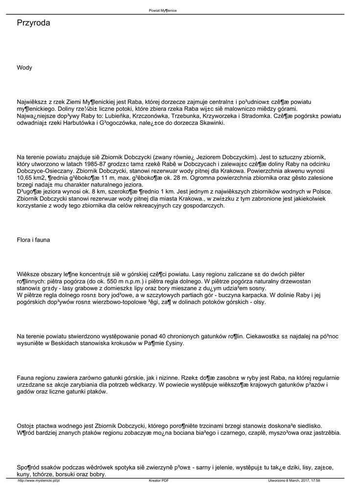 Powiat My¶lenice Przyroda Wody Najwiêksz± z rzek Ziemi My¶lenickiej jest Raba, której dorzecze zajmuje centraln± i po³udniow± czê¶æ powiatu my¶lenickiego. Doliny rze¼bi± liczne potoki, które zbiera rzeka Raba wij±c siê malowniczo miêdzy górami. Najwa¿niejsze dop³ywy Raby to: Lubieñka, Krzczonówka, Trzebunka, Krzyworzeka i Stradomka. Czê¶æ pogórsk± powiatu odwadniaj± rzeki Harbutówka i G³ogoczówka, nale¿±ce do dorzecza Skawinki. Na terenie powiatu znajduje siê Zbiornik Dobczycki (zwany równie¿ Jeziorem Dobczyckim). Jest to sztuczny zbiornik, który utworzono w latach 1985-87 grodz±c tam± rzekê Rabê w Dobczycach i zalewaj±c czê¶æ doliny Raby na odcinku Dobczyce-Osieczany. Zbiornik Dobczycki, stanowi rezerwuar wody pitnej dla Krakowa. Powierzchnia akwenu wynosi 10,65 km2, ¶rednia g³êboko¶æ 11 m, max. g³êboko¶æ ok. 28 m. Ogromna powierzchnia zbiornika oraz gêsto zalesione brzegi nadaj± mu charakter naturalnego jeziora. D³ugo¶æ jeziora wynosi ok. 8 km, szeroko¶æ ¶rednio 1 km. Jest jednym z najwiêkszych zbiorników wodnych w Polsce. Zbiornik Dobczycki stanowi rezerwuar wody pitnej dla miasta Krakowa., w zwi±zku z tym zabronione jest jakiekolwiek korzystanie z wody tego zbiornika dla celów rekreacyjnych czy gospodarczych. Flora i fauna Wiêksze obszary le¶ne koncentruj± siê w górskiej czê¶ci powiatu. Lasy regionu zaliczane s± do dwóch piêter ro¶linnych: piêtra pogórza (do ok. 550 m n.p.m.) i piêtra regla dolnego. W piêtrze pogórza naturalny drzewostan stanowi± gr±dy - lasy grabowe z domieszk± lipy oraz bory mieszane z du¿ym udzia³em sosny. W piêtrze regla dolnego rosn± bory jod³owe, a w szczytowych partiach gór - buczyna karpacka. W dolinie Raby i jej pogórskich dop³ywów rosn± wierzbowo-topolowe ³êgi, za¶ w dolinach potoków górskich - olsy. Na terenie powiatu stwierdzono wystêpowanie ponad 40 chronionych gatunków ro¶lin. Ciekawostk± s± najdalej na pó³noc wysuniête w Beskidach stanowiska krokusów w Pa¶mie £ysiny. Fauna regionu zawiera zarówno gatunki górskie, jak i nizinne. Rzek± do¶æ zasobn± w ryby jest Raba, na której regularnie urz±dzane s± akcje zarybiania dla potrzeb wêdkarzy. W powiecie wystêpuje wiêkszo¶æ krajowych gatunków p³azów i gadów oraz liczne gatunki ptaków. Ostoj± ptactwa wodnego jest Zbiornik Dobczycki, którego poro¶niête trzcinami brzegi stanowi± doskona³e siedlisko. W¶ród bardziej znanych ptaków regionu zobaczyæ mo¿na bociana bia³ego i czarnego, czaplê, myszo³owa oraz jastrzêbia. Spo¶ród ssaków podczas wêdrówek spotyka siê zwierzynê p³ow± - sarny i jelenie, wystêpuj± tu tak¿e dziki, lisy, zaj±ce, kuny, tchórze, borsuki oraz bobry. http://www.myslenicki.pl/pl Kreator PDF Utworzono 8 March, 2017, 17:58 Powiat My¶lenice Ochrona przyrody W obszarze Powiatu wielko¶æ powierzchni stanowi±cej przedmiot ochrony to tereny o powierzchni 9737,2 ha (1,44.% powierzchni Powiatu), w tym: na rezerwaty przyrody przypada 293,8 ha, a na obszar chronionego krajobrazu - 9437,9 ha. W granicach Powiatu My¶lenickiego zlokalizowane s± dwa istniej±ce rezerwaty przyrody: - rezerwat krajobrazowy ,,Las Go¶cibia" (gmina Su³kowice): obszar le¶ny o powierzchni 282,46 ha. Przedmiotem ochrony jest charakterystyczny dla Beskidu Makowskiego le¶ny ekosystem w obszarze potoku górskiego oraz ¼ród³o wody pitnej dla Su³kowic. - rezerwat le¶ny ,,Zamczysko nad Rab±" (gmina My¶lenice): przedmiotem ochrony jest karpacki bór jod³owy z domieszk± ¶wierka, z du¿ym udzia³em chronionego bluszczu pospolitego w warstwie podszytu. Porasta on pó³nocne stoki wzgórza Ukleina. W lasach nadle¶nictwa My¶lenice utworzono trzy u¿ytki ekologiczne: M³aka ¼ródliskowa, Mokrad³o ¶ródle¶ne oraz najciekawszy z nich - Polana Sucha pod £ysin± - stanowisko kilkunastu chronionych gatunków ro¶lin. Po³udniowa czê¶æ Powiatu wchodzi w sk³ad Obszaru Chronionego Krajobrazu obejmuj±cego teren by³ego województwo nowos±deckiego, natomiast pó³nocno-wschodnia czê¶æ Powiatu le¿y w granicach projektowanego OChK Dobczyce. Prócz tego na obszarze Powiatu s± zlokalizowane trzy istniej±ce u¿ytki ekologiczne: - Mokrad³o ¦ródle¶ne w gminie My¶lenice, pow. 0,26 ha - M³aka ¬ródliskowa w gminie My¶lenice, pow. 0,12 ha - Polana Sucha w gminie Wi¶niowa, pow. 5,06 ha. http://www.myslenicki.pl/pl Kreator PDF Utworzono 8 March, 2017, 17:58 Powiat My¶lenice Bogactwo naturalnego krajobrazu uzupe³niaj± liczne osobliwo¶ci turystyczne i okazy przyrodnicze. Na terenie powiatu znajduje siê 95 pomników przyrody. A¿ 91 z nich to sêdziwe drzewa, z których najwiêkszym jest d±b w Osieczanach (680 cm obwodu), a pozosta³e znane to: ,,Lipka" na Górze Plebañskiej w My¶lenicach, lipa ,,Marysieñka" w Dobczycach, wg tradycji zasadzona przez Jana III Sobieskiego i s³ynne ,,Cisy Raciborskiego" w Harbutowicaach, z których starszy liczy ponad 660 lat oraz liczne starodrzewy przy zabytkowych budowlach ko¶cio³ach i dworach. Pomniki przyrody nieo¿ywionej to: g³az narzutowy w Dobczycach oraz ska³ki piaskowcowe: ,,Diabelskie Kamienie" w Krzes³awicach, Rudniku oraz ,,Kamieñ Grzyb" w Zegartowicach. Walory Ziemi My¶lenickiej podkre¶laj± niezwykle urokliwe okolice Tokarni oraz Wi¶niowej. Do innych ciekawostek przyrodniczych powiatu nale¿±: 26-metrowa jaskinia szczelinowa ,,Zimna Dziura" w masywie góry Szczebel k. Lubnia, starodrzew ,,Lipiny" w Pcimiu, ska³ki ,,Diabelski" i ,,Wielki Kamieñ" w Stró¿y oraz ska³ka ,,Kopytko" i ¼róde³ko B³ogos³awionej Anieli Salwy w Sieprawiu. http://www.myslenicki.pl/pl Kreator PDF Utworzono 8 March, 2017, 17:58