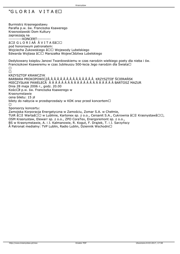 Krasnystaw "G L O R I A V I T A E Burmistrz Krasnegostawu Parafia p.w. św. Franciszka Ksawerego Krasnostawski Dom Kultury zapraszają na ----------KONCERT---------„G L O R I A  V I T A E― pod honorowym patronatem: Wojciecha Żukowskiego – Wojewody Lubelskiego Edwarda Wojtasa – Marszałka WojewÃłdztwa Lubelskiego Dedykowany księdzu Janowi Twardowskiemu w czas narodzin wielkiego poety dla nieba i św. Franciszkowi Ksaweremu w czas Jubileuszu 500-lecia Jego narodzin dla Świata KRZYSZTOF KRAWCZYK BARBARA PROKOPOWICZ               KRZYSZTOF ŚCIERAŃSK MIECZYSŁAW PAWELEC                      BARTOSZ MAZUR Dnia 28 maja 2006 r., godz. 20.00 KościÃłł p.w. św. Franciszka Ksawerego w Krasnymstawie cena biletu: 15 zł bilety do nabycia w przedsprzedaży w KDK oraz przed koncertem Sponsorzy koncertu: Zamojska Korporacja Energetyczna w Zamościu, Zomar S.A. w Chełmie, TUiR „Warta― w Lublinie, Kartonex sp. z o.o., Cersanit S.A., Cukrownia „Krasnystaw―, OSM Krasnystaw, Elewarr sp. z o.o., ZPO CoraTex, Energoremont sp. z o.o., BS w Krasnymstawie, A. i J. Kalmanowie, R. Kogut, F. Drążek, T. i J. Sarzyńscy  Patronat medialny: TVP Lublin, Radio Lublin, Dziennik Wschodni http://www.krasnystaw.pl/new Kreator PDF Utworzono 8-03-2017, 17:58