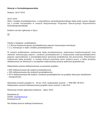 Dotacje w Zachodniopomorskim Dodano: 26.07.2010 26.07.2010 Małe i średnie przedsiębiorstwa z województwa zachodniopomorskiego będą miały szanse ubiegać się o środki europejskie w ramach Regionalnego Programu Operacyjnego Województwa Zachodniopomorskiego. Konkurs ma być ogłoszony w lipcu. Chodzi o działanie i poddziałanie: 1.1 Wzrost konkurencyjności przedsiębiorstw poprzez innowacyjne inwestycje 1.1.2. Inwestycje w małe i średnie przedsiębiorstwa W ramach poddziałania realizowane będą przedsięwzięcia, podnoszące konkurencyjność oraz zdolność inwestycyjną małych i średnich przedsiębiorstw (z wyłączeniem mikroprzedsiębiorstw) poprzez wprowadzanie w przedsiębiorstwie innowacji produktowej lub procesowej. Priorytetowo traktowane będą projekty, w wyniku których powstaną nowe miejsca pracy, a także projekty zlokalizowane na obszarach o szczególnie niekorzystnej sytuacji społeczno-gospodarczej. Maksymalny poziom dofinansowania na poziomie projektu: ● ● ● 60% dofinansowania dla małych przedsiębiorstw, 50% dofinansowania dla średnich przedsiębiorstw, 40 % dofinansowania dla małych i średnich przedsiębiorstw na projekty dotyczące działalności transportowej. Minimalna wartość projektu to – 40 tys. PLN, maksymalna wartość – 7 999 999, 99 PLN. Maksymalna wartość dofinansowania projektu może wynieść 2 mln PLN. Planowany termin ogłoszenia konkursu – lipiec 2010. firmylesne.pl Źródło: lesnedotacje.pl Komentarze (0) Nie dodano jeszcze żadnego komentarza.