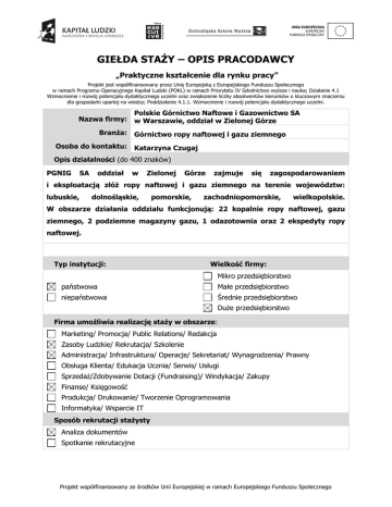 GIEŁDA STAŻY – OPIS PRACODAWCY „Praktyczne kształcenie dla rynku pracy” Projekt jest współfinansowany przez Unię Europejską z Europejskiego Funduszu Społecznego w ramach Programu Operacyjnego Kapitał Ludzki (POKL) w ramach Priorytetu IV Szkolnictwo wyższe i nauka; Działanie 4.1 Wzmocnienie i rozwój potencjału dydaktycznego uczelni oraz zwiększenie liczby absolwentów kierunków o kluczowym znaczeniu dla gospodarki opartej na wiedzy; Poddziałanie 4.1.1. Wzmocnienie i rozwój potencjału dydaktycznego uczelni. Polskie Górnictwo Naftowe i Gazownictwo SA Nazwa firmy: w Warszawie, oddział w Zielonej Górze Branża: Górnictwo ropy naftowej i gazu ziemnego Osoba do kontaktu: Katarzyna Czugaj Opis działalności (do 400 znaków) PGNIG SA oddział w Zielonej Górze zajmuje się zagospodarowaniem i eksploatacją złóż ropy naftowej i gazu ziemnego na terenie województw: lubuskie, dolnośląskie, pomorskie, zachodniopomorskie, wielkopolskie. W obszarze działania oddziału funkcjonują: 22 kopalnie ropy naftowej, gazu ziemnego, 2 podziemne magazyny gazu, 1 odazotownia oraz 2 ekspedyty ropy naftowej. Typ instytucji: Wielkość firmy: Mikro przedsiębiorstwo państwowa Małe przedsiębiorstwo niepaństwowa Średnie przedsiębiorstwo Duże przedsiębiorstwo Firma umożliwia realizację staży w obszarze: Marketing/ Promocja/ Public Relations/ Redakcja Zasoby Ludzkie/ Rekrutacja/ Szkolenie Administracja/ Infrastruktura/ Operacje/ Sekretariat/ Wynagrodzenia/ Prawny Obsługa Klienta/ Edukacja Ucznia/ Serwis/ Usługi Sprzedaż/Zdobywanie Dotacji (Fundraising)/ Windykacja/ Zakupy Finanse/ Księgowość Produkcja/ Drukowanie/ Tworzenie Oprogramowania Informatyka/ Wsparcie IT Sposób rekrutacji stażysty Analiza dokumentów Spotkanie rekrutacyjne Projekt współfinansowany ze środków Unii Europejskiej w ramach Europejskiego Funduszu Społecznego