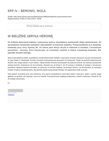 KRP IV – BEMOWO, WOLA Źródło: http://wola.policja.waw.pl/r4/aktualnosci/4958,W-bieliznie-ukryla-heroine.html Wygenerowano: Środa, 8 marca 2017, 18:58 Strona znajduje się w archiwum. W BIELIŹNIE UKRYŁA HEROINĘ Po krótkiej obserwacji kobiety i mężczyzny wolscy wywiadowcy postanowili oboje skontrolować. Po sprawdzeniu tożsamości policjanci zdecydowali na kontrolę osobistą. Przeprowadzono ją w budynku komendy przy ulicy Żytniej 36. 25 letnia pani Alicja ukryła w bieliźnie 6 torebek z brunatnym proszkiem - heroiną. Para tłumaczyła, że narkotyki znaleźli w klatce schodowej budynku. Nie potrafili określić którego. Nieco przed północą wolscy wywiadowcy zaczęli obserwować kobietę i mężczyznę nerwowo kręcących się przy skrzyżowaniu Al. Jana Pawła II i Nowolipek. Po kilku minutach funkcjonariusze sprawdzili ich tożsamość. Oboje nie potrafili jednoznacznie określić celu swego pobytu w tym miejscu. Oboje bardzo nerwowo zachowywali się podczas kontroli. By stworzyć prywatność dalszej kontroli, dowieziono ich do komendy. Okazało się, że Alicja P. lat 25 ukrywa w bieliźnie 6 torebek z brunatnym proszkiem. Badanie testerem określiło, że może być to heroina. Kobieta i jej kompan Paweł Ł. lat 28 twierdzili, że narkotyki znaleźli w klatce schodowej bloku. Nie potrafili jednak sprecyzować którego. Do wyjaśnienia trafili za kratki. Kilka godzin wcześniej przy ulicy Deotymy inny patrol wywiadowczy kontroluje dwóch mężczyzn. Jeden z panów sięga głęboko za spodnie, coś wyjmuje i rzuca na trawnik. Funkcjonariusze znajdują torebeczkę z suszem marihuany. Michał W. lat 20 zostaje zatrzymany. kn Ocena: 0/5 (0) Tweetnij