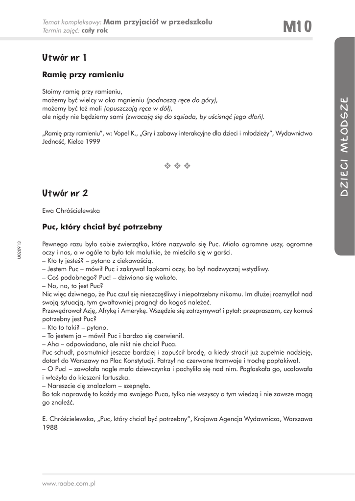 Temat kompleksowy: Mam przyjaciół w przedszkolu Termin zajęć: cały rok M10 Ut wór nr 1 Stoimy ramię przy ramieniu, możemy być wielcy w oka mgnieniu (podnoszą ręce do góry), możemy być też mali (opuszczają ręce w dół), ale nigdy nie będziemy sami (zwracają się do sąsiada, by uścisnąć jego dłoń). „Ramię przy ramieniu”, w: Vopel K., „Gry i zabawy interakcyjne dla dzieci i młodzieży”, Wydawnictwo Jedność, Kielce 1999 ❖❖❖ Ut wór nr 2 Ewa Chróścielewska U020913 Puc, który chciał być potrzebny Pewnego razu było sobie zwierzątko, które nazywało się Puc. Miało ogromne uszy, ogromne oczy i nos, a w ogóle to było tak malutkie, że mieściło się w garści. – Kto ty jesteś? – pytano z ciekawością. – Jestem Puc – mówił Puc i zakrywał łapkami oczy, bo był nadzwyczaj wstydliwy. – Coś podobnego? Puc! – dziwiono się wokoło. – No, no, to jest Puc? Nic więc dziwnego, że Puc czuł się nieszczęśliwy i niepotrzebny nikomu. Im dłużej rozmyślał nad swoją sytuacją, tym gwałtowniej pragnął do kogoś należeć. Przewędrował Azję, Afrykę i Amerykę. Wszędzie się zatrzymywał i pytał: przepraszam, czy komuś potrzebny jest Puc? – Kto to taki? – pytano. – To jestem ja – mówił Puc i bardzo się czerwienił. – Aha – odpowiadano, ale nikt nie chciał Puca. Puc schudł, posmutniał jeszcze bardziej i zapuścił brodę, a kiedy stracił już zupełnie nadzieję, dotarł do Warszawy na Plac Konstytucji. Patrzył na czerwone tramwaje i trochę popłakiwał. – O Puc! – zawołała nagle mała dziewczynka i pochyliła się nad nim. Pogłaskała go, ucałowała i włożyła do kieszeni fartuszka. – Nareszcie cię znalazłam – szepnęła. Bo tak naprawdę to każdy ma swojego Puca, tylko nie wszyscy o tym wiedzą i nie zawsze mogą go znaleźć. E. Chróścielewska, „Puc, który chciał być potrzebny”, Krajowa Agencja Wydawnicza, Warszawa 1988 www.raabe.com.pl DZIECI MŁODSZE Ramię przy ramieniu M10 Temat kompleksowy: Mam przyjaciół w przedszkolu Termin zajęć: cały rok Ut wór nr 3 Włodzimierz Melzacki DZIECI MŁODSZE Co lubią dzieci Co lubią dzieci? Słońce – gdy świeci, Deszcz – kiedy pada, Wiatr – kiedy gada, Mróz – kiedy szczypie, Śnieg – kiedy sypie… Każdą pogodę z upałem, chłodem, o każdej porze… Byle na dworze! W. Melzacki, „Co lubią dzieci”, w: Rok w przedszkolu, Wydawnictwo Żak, Warszawa 1997 U020913 www.raabe.com.pl