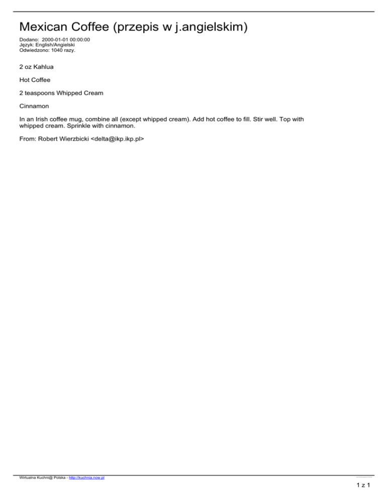 Mexican Coffee (przepis w j.angielskim) Dodano: 2000-01-01 00:00:00 Język: English/Angielski Odwiedzono: 1040 razy. 2 oz Kahlua Hot Coffee 2 teaspoons Whipped Cream Cinnamon In an Irish coffee mug, combine all (except whipped cream). Add hot coffee to fill. Stir well. Top with whipped cream. Sprinkle with cinnamon. From: Robert Wierzbicki <[email protected]> Wirtualna Kuchni@ Polska - http://kuchnia.now.pl przepis nr 3504, plik wygenerowano 2017.03.08 18:58 1z1