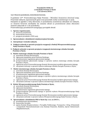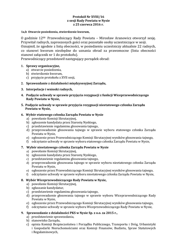 Protokół Nr XVIII/16 z sesji Rady Powiatu w Nysie z 25 czerwca 2016 r. 1a,b Otwarcie posiedzenia, stwierdzenie kworum, O godzinie 1200 Przewodniczący Rady Powiatu – Mirosław Aranowicz otworzył sesję. Przywitał radnych, zaproszonych gości oraz pozostałe osoby uczestniczące w sesji. Oznajmił, że zgodnie z listą obecności, w posiedzeniu uczestniczy aktualnie 22 radnych, co stanowi kworum niezbędne do uznania obrad za prawomocne (lista obecności stanowi załącznik nr 1 do protokołu). Przewodniczący przedstawił następujący porządek obrad: 1. Sprawy organizacyjne, a) otwarcie posiedzenia, b) stwierdzenie kworum, c) przyjęcie protokołu z XVII sesji, 2. Sprawozdanie z działalności międzysesyjnej Zarządu, 3. Interpelacje i wnioski radnych, 4. Podjęcie uchwały w sprawie przyjęcia rezygnacji z funkcji Wiceprzewodniczącego Rady Powiatu w Nysie, 5. Podjęcie uchwały w sprawie przyjęcia rezygnacji nieetatowego członka Zarządu Powiatu w Nysie, 6. Wybór etatowego członka Zarządu Powiatu w Nysie a) powołanie Komisji Skrutacyjnej, b) zgłoszenie kandydata przez Starostę Nyskiego, c) przedstawienie regulaminu głosowania tajnego, d) przeprowadzenie głosowania tajnego w sprawie wyboru etatowego członka Zarządu Powiatu w Nysie, e) ogłoszenie przez Przewodniczącego Komisji Skrutacyjnej wyników głosowania tajnego, f) odczytanie uchwały w sprawie wyboru etatowego członka Zarządu Powiatu w Nysie, 7. Wybór nieetatowego członka Zarządu Powiatu w Nysie a) powołanie Komisji Skrutacyjnej, b) zgłoszenie kandydata przez Starostę Nyskiego, c) przedstawienie regulaminu głosowania tajnego, d) przeprowadzenie głosowania tajnego w sprawie wyboru nieetatowego członka Zarządu Powiatu w Nysie, e) ogłoszenie przez Przewodniczącego Komisji Skrutacyjnej wyników głosowania tajnego, f) odczytanie uchwały w sprawie wyboru nieetatowego członka Zarządu Powiatu w Nysie, 8. Wybór Wiceprzewodniczącego Rady Powiatu w Nysie, a) powołanie Komisji Skrutacyjnej, b) zgłaszanie kandydatur, c) przedstawienie regulaminu głosowania tajnego, d) przeprowadzenie głosowania tajnego w sprawie wyboru Wiceprzewodniczącego Rady Powiatu w Nysie, e) ogłoszenie przez Przewodniczącego Komisji Skrutacyjnej wyników głosowania tajnego, f) odczytanie uchwały w sprawie wyboru Wiceprzewodniczącego Rady Powiatu w Nysie, 9. Sprawozdanie z działalności PKS w Nysie Sp. z o.o. za 2015 r., a) przedstawienie sprawozdania, b) stanowisko Zarządu, c) opinia Komisji Bezpieczeństwa i Porządku Publicznego, Transportu i Dróg, Urbanistyki i Gospodarki Nieruchomościami oraz Komisji Finansów, Budżetu, Spraw Statutowych i Regulaminowych, d) dyskusja, e) przyjęcie sprawozdania, 10. Sprawozdanie z działalności Muzeum Powiatowego w Nysie za 2015 r., a) przedstawienie sprawozdania, b) stanowisko Zarządu, c) opinia Komisji Edukacji Publicznej, Kultury, Sportu, Turystyki i Promocji, d) dyskusja, e) przyjęcie sprawozdania, 11. Sprawozdanie z działalności Ogniska Artystycznego w Nysie za 2015 r. a) przedstawienie informacji, b) stanowisko Zarządu, c) opinia Komisji Edukacji Publicznej, Kultury, Sportu, Turystyki i Promocji, d) dyskusja, e) przyjęcie informacji, 12.Informacja nt. przygotowań do letniego sezonu turystycznego (stan akwenów wodnych), a) przedstawienie informacji, b) stanowisko Zarządu, c) opinia Komisji Edukacji Publicznej, Kultury, Sportu, Turystyki i Promocji oraz Komisji Zdrowia i Opieki Społecznej, d) dyskusja, e) przyjęcie informacji. 13. Podjęcie uchwał w sprawie: a) zatwierdzenia planów pracy stałych Komisji Rady Powiatu w Nysie, b) współdziałania pomiędzy Powiatem Nyskim, a Gminą Kamiennik w zakresie publicznego transportu zbiorowego, c) przeniesienia środków Państwowego Funduszu Rehabilitacji Osób Niepełnosprawnych, d) ustalenia dla szkół prowadzonych przez Powiat Nyski: zasad rozliczania tygodniowego obowiązkowego wymiaru godzin zajęć nauczycieli, dla których ustalony plan zajęć jest różny w poszczególnych okresach roku szkolnego, tygodniowego obowiązkowego wymiaru godzin zajęć nauczycieli szkół zaocznych i zasady zaliczania do wymiaru godzin poszczególnych zajęć w kształceniu zaocznym, tygodniowego obowiązkowego wymiaru godzin zajęć nauczycieli zatrudnionych na stanowiskach pedagogów, psychologów, logopedów i doradców zawodowych oraz zasad udzielania i rozmiaru obniżek tygodniowego obowiązkowego wymiaru godzin zajęć dydaktycznych, wychowawczych i opiekuńczych nauczycielom zajmującym kierownicze stanowiska, e) zmiany budżetu Powiatu Nyskiego na 2016 rok, f) zmiany budżetu Powiatu Nyskiego na 2016 rok, g) zmiany wieloletniej prognozy finansowej na lata 2016 – 2020. 14.Wręczenie odznaczenia „Honorowy Order Zasług dla Powiatu Nyskiego PROMEREOR” dla Ochotniczych Straży Pożarnych działających na terenie gmin powiatu nyskiego, 15. Wolne wnioski. 16. Zamknięcie obrad. Ad 1 c Przyjęcie protokołu z XVII sesji, Protokół z XVII sesji przyjęto jednogłośnie. Ad 2 Sprawozdanie z działalności międzysesyjnej Zarządu (załącznik nr 2 do protokołu), W tej części posiedzenia nikt z radnych nie zabrał głosu. Ad 3 Interpelacje i wnioski radnych, Interpelacji, zapytań nie zgłoszono. Ad 4 Podjęcie uchwały w sprawie przyjęcia rezygnacji z funkcji Wiceprzewodniczącego Rady Powiatu w Nysie (projekt uchwały stanowi załącznik nr 3 do protokołu), Przewodniczący Rady – Mirosław Aranowicz oznajmił, iż w dniu 10 czerwca br. wpłynęła do niego rezygnacja Pana Wincentego Galli z funkcji Wiceprzewodniczącego Rady (załącznik nr 4 do protokołu). Zapytał następnie czy ktoś z radnych ma uwagi do projektu uchwały. Ponieważ nie zgłoszono uwag, Przewodniczący Rady poddał projekt uchwały pod głosowanie. W głosowaniu uczestniczyło 22 radnych, uchwałę podjęto przy 21 głosach „za” i 1 „przeciw”. Ad 5 Podjęcie uchwały w sprawie przyjęcia rezygnacji nieetatowego członka Zarządu Pow
