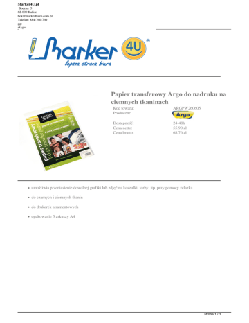 Marker4U.pl Boczna 5 62-800 Kalisz [email protected] Telefon: 884-760-760 gg: skype: Papier transferowy Argo do nadruku na ciemnych tkaninach Kod towaru: Producent: ARGPW260605 Dostępność: Cena netto: Cena brutto: 24-48h 55.90 zł 68.76 zł umożliwia przeniesienie dowolnej grafiki lub zdjęć na koszulki, torby, itp. przy pomocy żelazka do czarnych i ciemnych tkanin do drukarek atramentowych opakowanie 5 arkuszy A4 strona 1 / 1 Powered by TCPDF (www.tcpdf.org)