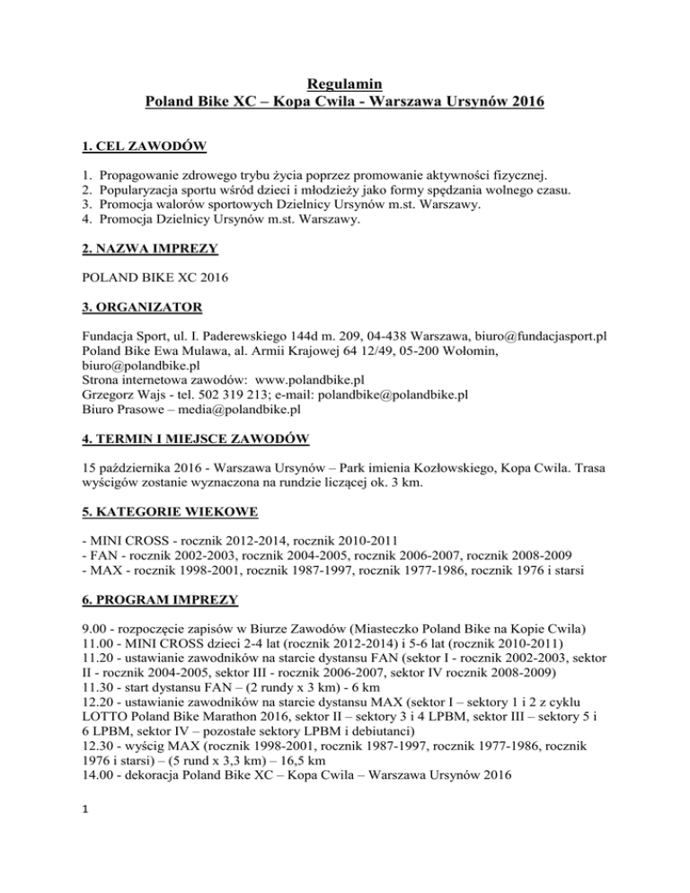 Regulamin Poland Bike XC – Kopa Cwila - Warszawa Ursynów 2016 1. CEL ZAWODÓW 1. 2. 3. 4. Propagowanie zdrowego trybu życia poprzez promowanie aktywności fizycznej. Popularyzacja sportu wśród dzieci i młodzieży jako formy spędzania wolnego czasu. Promocja walorów sportowych Dzielnicy Ursynów m.st. Warszawy. Promocja Dzielnicy Ursynów m.st. Warszawy. 2. NAZWA IMPREZY POLAND BIKE XC 2016 3. ORGANIZATOR Fundacja Sport, ul. I. Paderewskiego 144d m. 209, 04-438 Warszawa, [email protected] Poland Bike Ewa Mulawa, al. Armii Krajowej 64 12/49, 05-200 Wołomin, [email protected] Strona internetowa zawodów: www.polandbike.pl Grzegorz Wajs - tel. 502 319 213; e-mail: [email protected] Biuro Prasowe – [email protected] 4. TERMIN I MIEJSCE ZAWODÓW 15 października 2016 - Warszawa Ursynów – Park imienia Kozłowskiego, Kopa Cwila. Trasa wyścigów zostanie wyznaczona na rundzie liczącej ok. 3 km. 5. KATEGORIE WIEKOWE - MINI CROSS - rocznik 2012-2014, rocznik 2010-2011 - FAN - rocznik 2002-2003, rocznik 2004-2005, rocznik 2006-2007, rocznik 2008-2009 - MAX - rocznik 1998-2001, rocznik 1987-1997, rocznik 1977-1986, rocznik 1976 i starsi 6. PROGRAM IMPREZY 9.00 - rozpoczęcie zapisów w Biurze Zawodów (Miasteczko Poland Bike na Kopie Cwila) 11.00 - MINI CROSS dzieci 2-4 lat (rocznik 2012-2014) i 5-6 lat (rocznik 2010-2011) 11.20 - ustawianie zawodników na starcie dystansu FAN (sektor I - rocznik 2002-2003, sektor II - rocznik 2004-2005, sektor III - rocznik 2006-2007, sektor IV rocznik 2008-2009) 11.30 - start dystansu FAN – (2 rundy x 3 km) - 6 km 12.20 - ustawianie zawodników na starcie dystansu MAX (sektor I – sektory 1 i 2 z cyklu LOTTO Poland Bike Marathon 2016, sektor II – sektory 3 i 4 LPBM, sektor III – sektory 5 i 6 LPBM, sektor IV – pozostałe sektory LPBM i debiutanci) 12.30 - wyścig MAX (rocznik 1998-2001, rocznik 1987-1997, rocznik 1977-1986, rocznik 1976 i starsi) – (5 rund x 3,3 km) – 16,5 km 14.00 - dekoracja Poland Bike XC – Kopa Cwila – Warszawa Ursynów 2016 1 7. SEKTORY NA DYSTANSIE MAX Start na dystansie MAX odbędzie się z czterech sektorów, uwzględniających sektory z LOTTO Poland Bike Marathon 2016. Sektor I – sektory 1 i 2 LPBM, sektor II – sektory 3 i 4 LPBM, sektor III – sektory 5 i 6 LPBM, sektor IV – pozostałe sektory LPBM i debiutanci. Start sektorów co 30 sekund. Organizator może przyznać wyższy sektor (zainteresowane osoby prosimy o kontakt na [email protected]). 8. OPŁATY I NUMERY STARTOWE Opłaty startowe: - MINI CROSS – bezpłatnie - FAN (dzieci i młodzież – mieszkańcy dzielnicy Ursynów) – bezpłatnie (numer startowy z chipem do elektronicznego pomiaru czasu będzie wydawany za kaucją zwrotną 20 zł) - FAN (pozostali - dzieci i młodzież spoza dzielnicy Ursynów) – 10 zł - MAX – 30 zł Numery startowe: - obowiązuje nr startowy z LOTTO Poland Bike Marathon 2016; - uczestnicy nie posiadający nr startowego muszą go kupić (koszt nr startowego z chipem do elektronicznego pomiaru czasu = 20 zł) 9. WARUNKI UCZESTNICTWA: Uczestnikiem może być każda osoba, która spełni następujące warunki: Wypełni kartę zgłoszeniową w Biurze Zawodów i dostarczy do Biura Zawodów do 30 minut przed startem swojej kategorii. Dokona opłaty startowej w Biurze Zawodów w dniu startu. Posiada nr startowy z cyklu LOTTO Poland Bike Maraton 2016. Wypełniając kartę zgłoszeniową (w formie pisemnej) uczestnik akceptuje poniższą klauzulę: „Znane mi są reguły i zasady uprawiania kolarstwa i zobowiązuję się do ich przestrzegania w trakcie trwania zawodów. Znane mi jest ryzyko związane z udziałem w zawodach, jestem świadomy szkód (w tym polegających na naruszeniu nietykalności cielesnej, uszkodzeniu ciała lub rozstroju zdrowia) jakie mogą powstać w czasie i w związku z rywalizacją sportową i podejmuję ją w sposób świadomy i dobrowolny. Biorąc udział w zawodach na własne ryzyko przyjmuję jednocześnie do wiadomości i oświadczam, iż ponoszę wyłączną odpowiedzialność za wszelkie szkody mogące powstać wskutek mojego uczestnictwa w zawodach, w szczególności w przypadku naruszenia przeze mnie reguł sportowych. Przyjmuję do wiadomości, iż w razie wypadku, w szczególności spowodowanego przez innego uczestnika zawodów, nie przysługują mi jakiekolwiek roszczenia w stosunku do organizatora zawodów. Przyjmuję do wiadomości, iż odpowiedzialność organizatora zawodów jest określona przepisami prawa, a jej zakres nie jest rozszerzony umownie w żaden sposób, dorozumiany lub bezpośredni. Oświadczam również, iż mój stan zdrowia pozwala mi na wzięcie udziału w zawodach. Przyjmuję do wiadomości, że należy przestrzegać zarządzeń służb porządkowych oraz warunków regulaminu. Zapoznałem się z trasą i zgadzam się z warunkami uczestnictwa i zgłaszam swoje uczestnictwo w zawodach pod nazwą Poland Bike XC 2016. W przypadku startu młodzieży poniżej 18 lat wymagana jest zgoda rodzica lub opiekuna prawnego, poprzez złożenie podpisu. Zdjęcia, nagrania filmowe oraz wywiady z moją osobą, a także wyniki z moimi danymi osobowymi mogą być wykorzystane przez prasę, radio i telewizję. Swoim podpisem zapewniam, że zapoznałem się z wszystkimi warunkami regulaminu zawodów i wypełniłem formularz zgłoszeniowy zgodnie z prawdą oraz kompletnie. Wyrażam zgodę na przetwarzanie moich danych osobowych przez Poland Bike Ewa Mulawa z siedzibą w Wołominie zgodnie z ustawą z dnia 29 sierpnia 1997 r. o ochronie danych osobowych dla potrzeb związanych z organizacją i przeprowadzeniem zawodów sportowych pod nazwą Poland Bike XC 2016. Niniejsza deklaracja obowiązuje na wszystkich edycjach tegorocznego cyklu.” 2 Deklarację udziału w cyklu Poland Bike XC 2016 wypełnia się tylko jeden raz. Każdy uczestnik startujący jest zobowiązany do jazdy w kasku sztywnym. Zawodnicy poruszający się po trasie bez wymaganego kasku będą dyskwalifikowani. W zawod