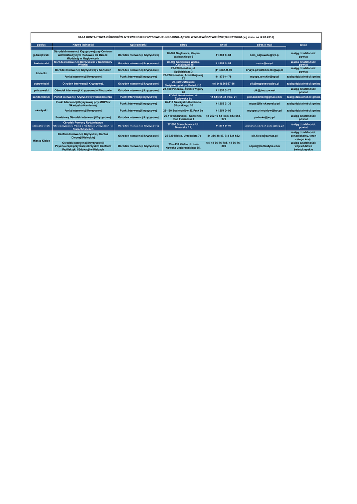 BAZA KONTAKTOWA OŚRODKÓW INTERWENCJI KRYZYSOWEJ FUNKCJONUJĄCYCH W WOJEWÓDZTWIE ŚWIĘTOKRZYSKIM (wg stanu na 12.07.2016) powiat jędrzejowski kazimierski Nazwa jednostki Ośrodek Interwencji Kryzysowej przy Centrum Administracyjnym Placówek dla Dzieci i Młodzieży w Nagłowicach Ośrodek Interwencji Kryzysowej w Kazimierzy Wielkiej Ośrodek Interwencji Kryzysowej w Końskich typ jednostki adres Ośrodek Interwencji Kryzysowej 28-362 Nagłowice, Kacpra Walewskiego 6 Ośrodek Interwencji kryzysowej Ośrodek Interwencji kryzysowej konecki 28-500 Kazimierza Wielka, T.Kościuszki 15 26-200 Końskie, ul. Spółdzielcza 3 26-200 Końskie, Armii Krajowej 22 27-400 Ostrowiec Świętokrzyski os. Pułanki 10 28-400 Pińczów, Żwirki i Wigury 40 27-600 Sandomierz, ul. Żydowska 6c 26-110 Skarżysko-Kamienna, Sikorskiego 10 [email protected] 41 352 18 32 [email protected] (41) 372-84-06 [email protected] zasięg działalności: powiat zasięg działalności: powiat [email protected] zasięg działalności: gmina [email protected] zasięg działalności: gmina 41 357 35 75 [email protected] zasięg działalności: powiat 15 644 55 35 wew. 21 [email protected] zasięg działalności: gmina 41 252 03 36 [email protected] zasięg działalności: gmina 41 254 30 92 [email protected] zasięg działalności: gmina 26-110 Skarżysko - Kamienna, Plac Floriański 1 41 252 19 53 kom. 883-063272 [email protected] zasięg działalności: powiat Ośrodek Interwencji Kryzysowej 27-200 Starachowice Ul. Murarska 11, 41 274-09-97 [email protected] zasięg działalności: powiat Centrum Interwencji Kryzysowej Caritas Diecezji Kieleckiej Ośrodek Interwencji kryzysowej 25-729 Kielce, Urzędnicza 7b 41 366 48 47, 784 531 622 [email protected] Ośrodek Interwencji Kryzysowej i Psychoterapii przy Świętokrzyskim Centrum Profilaktyki i Edukacji w Kielcach Ośrodek Interwencji Kryzysowej 25 – 432 Kielce Ul. Jana Nowaka Jeziorańskiego 65, tel. 41 36-76-788, 41 36-76302 [email protected] Ośrodek Interwencji kryzysowej pińczowski Ośrodek Interwencji Kryzysowej w Pińczowie Ośrodek Interwencji kryzysowej sandomierski Punkt Interwencji Kryzysowej w Sandomierzu Punkt Interwencji kryzysowej Punkt Interwencji Kryzysowej przy MOPS w Skarżysku-Kamiennej Punkt Interwencji kryzysowej Punkt Interwencji Kryzysowej Punkt Interwencji kryzysowej 26-130 Suchedniów, E. Peck 9a Powiatowy Ośrodek Interwencji Kryzysowej Ośrodek Interwencji kryzysowej Ośrodek Pomocy Rodzinie przy Stowarzyszeniu Pomoc Rodzinie „Przystań” w Starachowicach Miasto Kielce zasięg zasięg działalności: powiat 41-375-16-78 Punkt Interwencji kryzysowej Ośrodek Interwencji Kryzysowej. starachowicki 41 381 45 84 adres e-mail tel. (41) 263-27-36 Punkt Interwencji Kryzysowej ostrowiecki skarżyski nr tel. zasięg działalności: ponadlokalny, teren całego kraju zasięg działalności: województwo świętokrzyskie