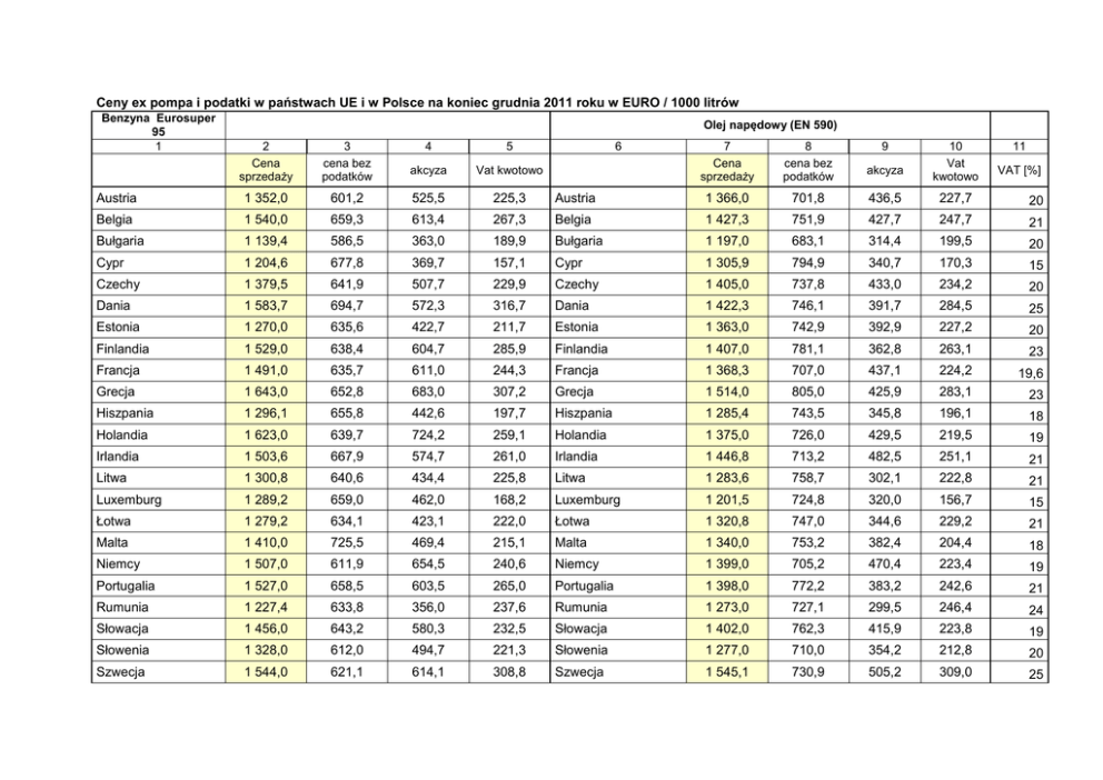 Ceny ex pompa i podatki w państwach UE i w Polsce na koniec grudnia 2011 roku w EURO / 1000 litrów Benzyna Eurosuper 95 1 Olej napędowy (EN 590) 2 Cena sprzedaży 3 cena bez podatków 4 5 akcyza Vat kwotowo Austria 1 352,0 601,2 525,5 225,3 Belgia 1 540,0 659,3 613,4 Bułgaria 1 139,4 586,5 Cypr 1 204,6 Czechy 6 7 Cena sprzedaży 8 cena bez podatków 9 Austria 1 366,0 701,8 436,5 227,7 20 267,3 Belgia 1 427,3 751,9 427,7 247,7 21 363,0 189,9 Bułgaria 1 197,0 683,1 314,4 199,5 20 677,8 369,7 157,1 Cypr 1 305,9 794,9 340,7 170,3 15 1 379,5 641,9 507,7 229,9 Czechy 1 405,0 737,8 433,0 234,2 20 Dania 1 583,7 694,7 572,3 316,7 Dania 1 422,3 746,1 391,7 284,5 25 Estonia 1 270,0 635,6 422,7 211,7 Estonia 1 363,0 742,9 392,9 227,2 20 Finlandia 1 529,0 638,4 604,7 285,9 Finlandia 1 407,0 781,1 362,8 263,1 23 Francja 1 491,0 635,7 611,0 244,3 Francja 1 368,3 707,0 437,1 224,2 19,6 Grecja 1 643,0 652,8 683,0 307,2 Grecja 1 514,0 805,0 425,9 283,1 23 Hiszpania 1 296,1 655,8 442,6 197,7 Hiszpania 1 285,4 743,5 345,8 196,1 18 Holandia 1 623,0 639,7 724,2 259,1 Holandia 1 375,0 726,0 429,5 219,5 19 Irlandia 1 503,6 667,9 574,7 261,0 Irlandia 1 446,8 713,2 482,5 251,1 21 Litwa 1 300,8 640,6 434,4 225,8 Litwa 1 283,6 758,7 302,1 222,8 21 Luxemburg 1 289,2 659,0 462,0 168,2 Luxemburg 1 201,5 724,8 320,0 156,7 15 Łotwa 1 279,2 634,1 423,1 222,0 Łotwa 1 320,8 747,0 344,6 229,2 21 Malta 1 410,0 725,5 469,4 215,1 Malta 1 340,0 753,2 382,4 204,4 18 Niemcy 1 507,0 611,9 654,5 240,6 Niemcy 1 399,0 705,2 470,4 223,4 19 Portugalia 1 527,0 658,5 603,5 265,0 Portugalia 1 398,0 772,2 383,2 242,6 21 Rumunia 1 227,4 633,8 356,0 237,6 Rumunia 1 273,0 727,1 299,5 246,4 24 Słowacja 1 456,0 643,2 580,3 232,5 Słowacja 1 402,0 762,3 415,9 223,8 19 Słowenia 1 328,0 612,0 494,7 221,3 Słowenia 1 277,0 710,0 354,2 212,8 20 Szwecja 1 544,0 621,1 614,1 308,8 Szwecja 1 545,1 730,9 505,2 309,0 25 akcyza 10 Vat kwotowo 11 VAT [%] Węgry 1 306,6 638,7 406,6 261,3 Węgry 1 409,5 753,1 374,5 281,9 25 Wielka Brytania 1 577,6 624,6 718,0 235,0 Wielka Brytania 1 678,1 708,4 719,8 249,9 17,5 Włochy 1 673,5 678,9 715,7 278,9 Włochy 1 654,0 773,7 604,6 275,7 POLSKA 1 229,4 623,6 375,9 229,9 POLSKA 1 261,0 733,6 291,6 235,8 20 23 Średnia europejska 1 415,2 644,2 530,5 240,6 Średnia europejska 1 382,4 740,5 407,0 234,9 87% 97% 71% 96% Cena w Polsce do średniej ceny europejskiej 91% 99% 72% 100% Cena w Polsce do średniej ceny europejskiej 1 EUR = 4,4168 PLN 15