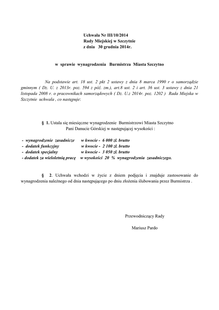 Uchwała Nr III/10/2014 Rady Miejskiej w Szczytnie z dnia 30 grudnia 2014r. w sprawie wynagrodzenia Burmistrza Miasta Szczytno Na podstawie art. 18 ust. 2 pkt 2 ustawy z dnia 8 marca 1990 r o samorządzie gminnym ( Dz. U. z 2013r. poz. 594 z póź. zm.), art.8 ust. 2 i art. 36 ust. 3 ustawy z dnia 21 listopada 2008 r. o pracownikach samorządowych ( Dz. U.z 2014r. poz. 1202 ) Rada Miejska w Szczytnie uchwala , co następuje: § 1. Ustala się miesięczne wynagrodzenie Burmistrzowi Miasta Szczytno Pani Danucie Górskiej w następującej wysokości : - wynagrodzenie zasadnicze w kwocie - 6 000 zł. brutto - dodatek funkcyjny w kwocie - 2 100 zł. brutto - dodatek specjalny w kwocie - 3 050 zł. brutto - dodatek za wieloletnią pracę w wysokości 20 % wynagrodzenia zasadniczego. § 2. Uchwała wchodzi w życie z dniem podjęcia i znajduje zastosowanie do wynagrodzenia należnego od dnia następującego po dniu złożenia ślubowania przez Burmistrza . Przewodniczący Rady Mariusz Pardo