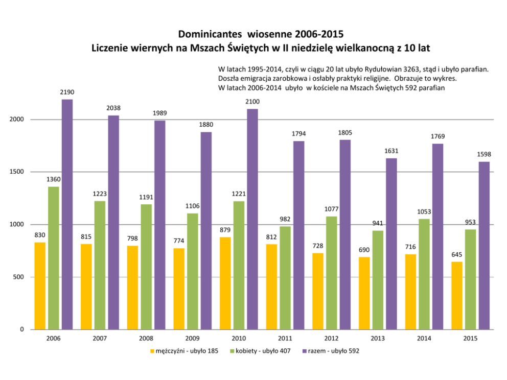 Dominicantes wiosenne 2006-2015 Liczenie wiernych na Mszach Świętych w II niedzielę wielkanocną z 10 lat W latach 1995-2014, czyli w ciągu 20 lat ubyło Rydułowian 3263, stąd i ubyło parafian. Doszła emigracja zarobkowa i osłabły praktyki religijne. Obrazuje to wykres. W latach 2006-2014 ubyło w kościele na Mszach Świętych 592 parafian 2190 2100 2038 1989 2000 1880 1805 1794 1769 1631 1598 1500 1360 1223 1221 1191 1106 1077 1053 982 1000 830 815 798 953 941 879 812 774 728 716 690 645 500 0 2006 2007 2008 2009 mężczyźni - ubyło 185 2010 2011 kobiety - ubyło 407 2012 razem - ubyło 592 2013 2014 2015 Comunicantes wiosenne w latach 2006-2015 Komunie Święte mężczyzn i kobiet w II niedzielę wielkanocną 1400 1189 1200 1120 1145 1109 1071 1063 971 1000 853 778 800 798 759 804 775 739 703 686 646 600 400 577 541 517 391 350 342 406 377 325 287 368 276 234 200 0 2006 2007 2008 2009 2010 mężczyźni 2011 kobiety razem 2012 2013 2014 2015 Dominicantes i Comunicantes 2006 -2015 Udział we Mszy Świętej i przystępowanie do Komunii W 2006 roku, rok po śmierci Jana Pawła II Polacy więcej praktykowali. W 2010 roku, dzień po katastrofie smoleńskiej, 11 kwietnia było od razu więcej ludzi na Mszach Świętych. Cyfry nie kłamią. Taka jest nasza religijność. 2190 2100 2038 1989 2000 1880 1805 1794 1769 1631 1598 1500 1189 1120 1145 1109 1071 1063 971 1000 804 775 853 500 0 2006 2007 2008 2009 2010 Mężczyźni i Kobiety - Dominicantes 2006-2015 2011 2012 2013 Mężczyźni i Kobiety - Comunicantes 2006-2015 2014 2015 Dominicantes i Comunicantes wiosenne 2006 -2015 Zależność między udziałem we Mszy Świętej a przystępowaniem do Komunii w procentach - % Faktem jest, że im mniej parafian na Mszach, tym więcej w Komunii Świętej. Liczenie dotyczy tzw. Komunii Wielkanocnej. Wnioski: 1. odpadli ze Mszy Świętej przede wszystkim ci, co nie przyjmowali Komunii Świętej. 2. "europeizujemy" się, czyli tak jak w np. w Niemczech, nikt nie chodzi do spowiedzi, a do Komunii idą wszyscy obecni w kościele, my też zaczynamy lekceważyć Spowiedź sakramentalną i bez Spowiedzi coraz częściej przystępujemy do Komunii Świętej. 67% 70% 65% 65% 2013 2014 60% 60% 54% 51% 50% 46% 47% 45% 41% 40% 30% 20% 10% 0% 2006 2007 2008 2009 2010 2011 2012 Wykres zależności udziału w Mszach niedzielnych w II n. wielkanocną a wiernych przystępujących wtedy do Komunii Świętej w % 2015 Liczba mieszkańców Rydułtów w latach 1995-2014 na dzień 31 grudnia z linią trendu 30000 25000 24013 1995 23308 23262 22950 1998 22032 21968 21952 21826 21712 21644 21476 21391 21234 20907 20750 1999 2000 20000 2004 2005 2006 15000 2007 2008 2009 10000 2010 2011 2012 5000 2013 2014 Różnica 1995-2014 0 -3263 -5000 1995 1998 1999 2000 2004 2005 2006 2007 2008 2009 2010 2011 2012 2013 Różnic 2014 a 19952014 Rydułtowianie 24013 23308 23262 22950 22032 21968 21952 21826 21712 21644 21476 21391 21234 20907 20750 -3263 Liczenie uczestników niedzielnej Mszy Świętej. Wiosna 2006 ÷ 2007 ÷ 2008 ÷ 2009 ÷ 2010 ÷ 2011 ÷ 2012 ÷ 2013 ÷ 2014 ÷ 2015 parafia: Rydułtowy – Orłowiec pod wezwaniem: Matki Bożej Uzdrowienia Chorych dekanat: Pszów O godzinie W sobotę 1700 W niedzielę 7 00 Rok Ile było na Mszy św. Ile przystąpiło do Komunii św. Mężczyzn Kobiet Razem Mężczyzn Kobiet Razem 2006 81 184 265 x x x 2007 75 151 226 33 92 125 2008 62 151 213 34 97 131 2009 52 112 164 13 44 57 2010 109 211 320 46 114 160 2011 204 192 396 58 111 169 2012 88 171 259 41 86 127 2013 74 125 199 59 88 147 2014 84 177 261 53 136 189 2015 46 109 155 29 76 105 2006 102 132 234 x x x 2007 97 134 231 52 103 155 2008 91 115 206 55 90 145 2009 99 124 223 39 78 117 2010 90 115 205 44 75 119 2011 90 102 192 47 66 113 2012 81 98 179 32 63 95 2013 63 94 157 38 79 117 2014 95 124 219 72 108 180 2015 60 97 157 42 65 107 2006 182 298 480 x x x 2007 164 219 383 79 162 241 2008 130 200 330 79 150 229 2009 139 212 351 47 131 178 W niedzielę 2010 151 212 363 64 139 203 900 2011 117 162 279 50 89 139 2012 156 189 345 66 121 187 2013 121 166 287 79 143 222 2014 135 221 356 78 176 254 2015 140 156 296 88 133 221 2006 218 357 575 x x x 2007 209 319 528 86 186 272 2008 193 248 441 84 187 271 2009 206 277 483 62 124 186 W niedzielę 2010 187 261 448 71 145 216 1030 2011 144 181 325 47 82 129 2012 185 263 448 63 148 211 2013 166 209 375 72 155 227 2014 142 171 313 74 124 198 2015 161 225 386 83 161 244 2006 177 287 464 x x x 2007 177 260 437 70 125 195 2008 233 308 541 101 186 287 2009 203 289 492 54 131 185 W niedzielę 2010 255 316 571 78 123 201 1200 2011 164 188 352 43 85 128 2012 139 231 370 51 107 158 2013 170 220 390 91 146 237 2014 147 199 346 67 105 172 2015 155 228 383 82 175 257 2006 70 102 172 x x x 2007 93 140 233 30 91 121 2008 89 169 258 38 88 126 2009 75 92 167 19 33 52 W niedzielę 2010 87 106 193 22 50 72 1700 2011 93 157 250 42 84 126 2012 79 125 204 23 52 75 2013 96 127 223 38 75 113 2014 113 161 274 62 90 152 2015 83 138 221 44 93 137 2006 830 1360 2190 342 778 1120 2007 815 1223 2038 350 759 1109 2008 798 1191 1989 391 798 1189 2009 774 1106 1880 234 541 775 2010 879 1221 2100 325 646 971 2011 812 982 1794 287 517 804 2012 728 1077 1805 276 577 853 2013 690 941 1631 377 686 1063 2014 716 1053 1769 406 739 1145 2015 645 953 1598 368 703 1071 Ogółem