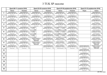 3 TUK SP zaoczne Zjazd (09-11 września 2016) 1 Zjazd (23-25 września 2016) Zjazd (21-23 października 2016) Sobota Niedziela Sobota Niedziela Sobota Niedziela Zabiegi pielęgnacyjne i upiększające dłoni, stóp i ciała Zabiegi pielęgnacyjne i upiększające dłoni, stóp i ciała Zabiegi pielęgnacyjne i upiększające dłoni, stóp i ciała Zabiegi pielęgnacyjne i upiększające dłoni, stóp i ciała Zabiegi pielęgnacyjne i upiększające dłoni, stóp i ciała Zabiegi pielęgnacyjne i upiększające dłoni, stóp i ciała S5 8:00 - 8:45 Zubiel Joanna Komorek Anna 2 Zabiegi pielęgnacyjne i upiększające dłoni, stóp i ciała Zabiegi pielęgnacyjne i upiększające dłoni, stóp i ciała S5 8:45 - 9:30 Zubiel Joanna Komorek Anna 3 Zabiegi pielęgnacyjne i upiększające dłoni, stóp i ciała Zabiegi pielęgnacyjne i upiększające dłoni, stóp i ciała S5 9:35 - 10:20 Komorek Anna 4 Zabiegi pielęgnacyjne i upiększające dłoni, stóp i ciała S5 10:20 - 11:05 Komorek Anna 5 Zabiegi pielęgnacyjne i upiększające dłoni, stóp i ciała S5 11:20 - 12:05 Komorek Anna 6 Zabiegi pielęgnacyjne i upiększające dłoni, stóp i ciała S5 12:05 - 12:50 Komorek Anna 7 Zabiegi pielęgnacyjne i upiększające dłoni, stóp i ciała S5 12:55 - 13:40 Komorek Anna 8 Zabiegi pielęgnacyjne i upiększające dłoni, stóp i ciała S5 13:40 - 14:25 Komorek Anna 9 Zabiegi pielęgnacyjne i upiększające dłoni, stóp i ciała S5 14:30 - 15:15 Komorek Anna 10 Zabiegi pielęgnacyjne i upiększające dłoni, stóp i ciała 15:15 - 16:00 Komorek Anna 11 Zjazd (07-09 października 2016) S5 Komorek Anna S5 Zabiegi pielęgnacyjne i upiększające dłoni, stóp i ciała Komorek Anna S5 Komorek Anna S5 Zabiegi pielęgnacyjne i upiększające dłoni, stóp i ciała Komorek Anna S5 Zabiegi pielęgnacyjne i upiększające dłoni, stóp i ciała Komorek Anna S5 Zabiegi pielęgnacyjne i upiększające dłoni, stóp i ciała Komorek Anna Zabiegi pielęgnacyjne i upiększające dłoni, stóp i ciała Język angielski zawodowy S5 Komorek Anna S5 Zabiegi pielęgnacyjne i upiększające dłoni, stóp i ciała Komorek Anna S5 Zabiegi pielęgnacyjne i upiększające dłoni, stóp i ciała Komorek Anna S5 Zabiegi pielęgnacyjne i upiększające dłoni, stóp i ciała Komorek Anna S5 Komorek Anna S5 Zabiegi pielęgnacyjne i upiększające dłoni, stóp i ciała Komorek Anna S5 Zabiegi pielęgnacyjne i upiększające dłoni, stóp i ciała Komorek Anna S5 Zabiegi pielęgnacyjne i upiększające dłoni, stóp i ciała Komorek Anna S5 Zabiegi pielęgnacyjne i upiększające dłoni, stóp i ciała Język angielski Język niemiecki zawodowy zawodowy Komorek Anna Piątek S5 Komorek Anna Komorek Anna S5 S5 Komorek Anna S5 S14a Kuczerowska Anna S8a Kulczyńska Dorota Komorek Anna Zabiegi pielęgnacyjne i upiększające dłoni, stóp i ciała Język angielski Język niemiecki zawodowy zawodowy Zabiegi pielęgnacyjne i upiększające dłoni, stóp i ciała S5 S14a Kulczyńska Dorota Komorek Anna S5 S14a Kuczerowska Anna S8a Kulczyńska Dorota Komorek Anna Język angielski zawodowy Kosmetyka pielęgnacyjna i upiększająca dłoni, stóp i ciała Język angielski Język niemiecki zawodowy zawodowy Zabiegi pielęgnacyjne i upiększające dłoni, stóp i ciała S5 S14a Kulczyńska Dorota S5 S14a Kuczerowska Anna S8a Kulczyńska Dorota Komorek Anna Podstawy anatomiczno dermatologiczne w kosmetyce Zabiegi pielęgnacyjne i upiększające dłoni, stóp i ciała Komorek Anna S5 Zabiegi pielęgnacyjne i upiększające dłoni, stóp i ciała Komorek Anna S5 Zabiegi pielęgnacyjne i upiększające dłoni, stóp i ciała Komorek Anna S5 Działalność gospodarcza i usługowa w salonie kosmetycznym Bocian Urszula Działalność gospodarcza i usługowa w salonie kosmetycznym Bocian Urszula Komorek Anna Kosmetyka pielęgnacyjna i upiększająca dłoni, stóp i ciała S2 Komorek Anna S5 Kosmetyka pielęgnacyjna i upiększająca dłoni, stóp i ciała S2 Komorek Anna S5 Kosmetyka pielęgnacyjna i upiększająca dłoni, stóp i ciała Komorek Anna S5 Dmochowska Barbara S6 Podstawy anatomiczno dermatologiczne w kosmetyce Dmochowska Barbara S6 Podstawy anatomiczno dermatologiczne w kosmetyce Dmochowska Barbara S6 Komorek Anna Dmochowska Barbara Dmochowska Barbara Komorek Anna Dmochowska Barbara S5 S6 Dmochowska Barbara S6 Podstawy anatomiczno dermatologiczne w kosmetyce S5 Dmochowska Barbara Działalność gospodarcza i usługowa w salonie kosmetycznym S5 S5 S6 Podstawy anatomiczno dermatologiczne w kosmetyce Zabiegi pielęgnacyjne i upiększające dłoni, stóp i ciała Komorek Anna S6 Podstawy anatomiczno dermatologiczne w kosmetyce S5 Zabiegi pielęgnacyjne i upiększające dłoni, stóp i ciała S5 Podstawy anatomiczno dermatologiczne w kosmetyce S5 Zabiegi pielęgnacyjne i upiększające dłoni, stóp i ciała Komorek Anna Komorek Anna S5 Język angielski zawodowy S5 Podstawy anatomiczno dermatologiczne w kosmetyce Zabiegi pielęgnacyjne i upiększające dłoni, stóp i ciała S14a Kulczyńska Dorota Zabiegi pielęgnacyjne i upiększające dłoni, stóp i ciała Komorek Anna Zabiegi pielęgnacyjne i upiększające dłoni, stóp i ciała Zabiegi pielęgnacyjne i upiększające dłoni, stóp i ciała Komorek Anna S5 Zabiegi pielęgnacyjne i upiększające dłoni, stóp i ciała Zabiegi pielęgnacyjne i upiększające dłoni, stóp i ciała S5 Komorek Anna Komorek Anna Zabiegi pielęgnacyjne i upiększające dłoni, stóp i ciała Zabiegi pielęgnacyjne i upiększające dłoni, stóp i ciała Komorek Anna Sobota Zabiegi pielęgnacyjne i upiększające dłoni, stóp i ciała Bocian Urszula Kosmetyka pielęgnacyjna i upiększająca dłoni, stóp i ciała Komorek Anna S5 Działalność gospodarcza i usługowa w salonie kosmetycznym Bocian Urszula S6 S2 S2 Kosmetyka pielęgnacyjna i upiększająca dłoni, stóp i ciała S5 16:00 - 16:45 Komorek Anna 12 Zabiegi pielęgnacyjne i upiększające dłoni, stóp i ciała S5 16:50 - 17:35 Komorek Anna 
