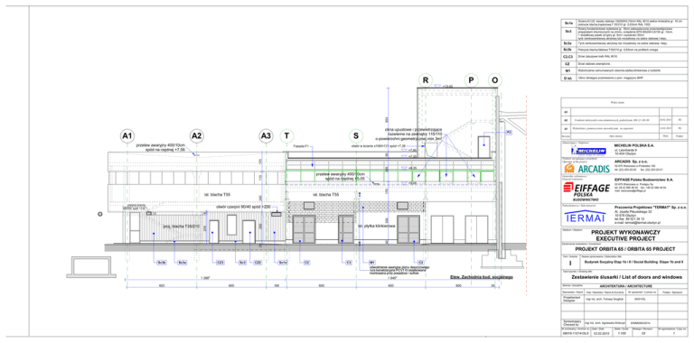Ściana EI120: kasety stalowe 150/600/0,75mm RAL 9010 wełna mineralna gr. 19 cm pokrycie blachą trapezową T 35/210 gr. 0,63mm RAL 1002 Sc1a Ściany fundamentowe wylewane gr. 18cm zabezpieczone przeciwwilgociowo preparatami bitumicznymi na zimno, ocieplenie EPS BS200-CS150 gr. 10cm, + dodatkowy pasek od góry gr. 8cm i wysokości 50cm tynk cienkowarstwowy akrylowy lub mozaikowy na siatce stalowej i kleju. Sc3 R P O Sc3a Tynk cienkowarstwowy akrylowy lub mozaikowy na siatce stalowej i kleju. Sc3b Pokrycie blachą fałdowa T35/210 gr. 0,63mm na profilach omega C2,C3 Drzwi żaluzjowe trafo RAL 8016 CZ Drzwi stalowe zewnętrzne. M1 Wykończenie zamurowanych otworów płytką klinkierowa z rozbiórki Okno istniejące przeniesione z pom. magazynu BHP. O ist. +13,43 Wykaz zmian 553 03 A1 A2 A3 T okna upustowe i przewietrzające rozwierne na zewnątrz 115/110 o powierzchni geometrycznej min 3m2 S Ustalenie kolorystyki scian aluminiowych, podział pom. H0-12 i H1-09 02 Wydzielenie z pomieszczenia zmywalni pom. na separator 01 50 +7,35 170 Podmiot zarządzający projektem/ Operator of the project: 110 czerpnia ścienna 400/250; spód: +2,45 02-670 Warszawa ul.Puławska 182 tel: (22) 203-20-00 fax: (22) 203-20-01 205 +6,35 240 175 EIFFAGE 8 IERMAI 330 250 CZ3 Sc3 42 Stadium / Stadium: PROJEKT WYKONAWCZY EXECUTIVE PROJECT PROJEKT ORBITA 65 / ORBITA 65 PROJECT CZ2 Sc1a C2 C3 5 M1 1 388 1 846 180 600 600 Nazwa opracowania / Elaboration title: I C2 5 600 Al. Józefa Piłsudskiego 32 10-578 Olsztyn tel./fax 89 521 34 12 e-mail: [email protected] Zamierzenie budowlane / Investment: odwodnienie awaryjne pionu deszczowego rura kanalizacyjna PCV110 osiatkowana montowana przy posadzce i suficie 603 Pracownia Projektowa "TERMAT" Sp. z o.o. ist. płytka klinkierowa 22 270 Sc3a 02-676 Warszawa ul. Postępu 5a tel: 48 22 566 49 00 fax: +48 22 566 49 50 mail: [email protected] BUDOWNICTWO Podwykonawca / Subcontractor: Tom / Volume: Sc3b EIFFAGE Polska Budownictwo S.A. POLSKA otwór czerpni 90/40 spód +230 proj. blacha T35/210 Podpis ARCADIS Sp. z o.o. Generalny wykonawca / General contractor: ist. blacha T55 Data ul. Leonharda 9 10-454 Olsztyn +5,05 ist. blacha T55 TG MICHELIN POLSKA S.A. +7,90 przelew awaryjny 400/10cm spód na rzędnej +5,05 13.02.2015 Opis zmiany Rewizja otwór w ścianie s106/h131 spód +7,38 Fasada F1 TG P2 Zamawiający / Employer: przelew awaryjny 400/10cm spód na rzędnej +7,56 20.02.2015 Budynek Socjalny Etap 1b i II / Social Building Etape 1b and II Tytuł rysunku / Drawing title: Elew. Zachodnia bud. socjalnego 600 35 Zestawienie ślusarki / List of doors and windows Branża / Discipline: ARCHITEKTURA / ARCHITECTURE Nr uprawnień / License no. Stanowisko / Stand Imię i Nazwisko / Name & Surname Projektantant Designer: mgr inż. arch. Tomasz Gryglicki 50/01/OL Sprawdzający Checked by: mgr inż. arch. Agnieszka Królczyk 9/WMOKK/2014 Nr archiwalny / Archive no.: Data / Date: 08016-11214-OLS 12.03.2015 Skala / Scale: Rewizja / Revision: 1:100 03 Podpis / Signature Nr egzemplarza / Copy no.: 1