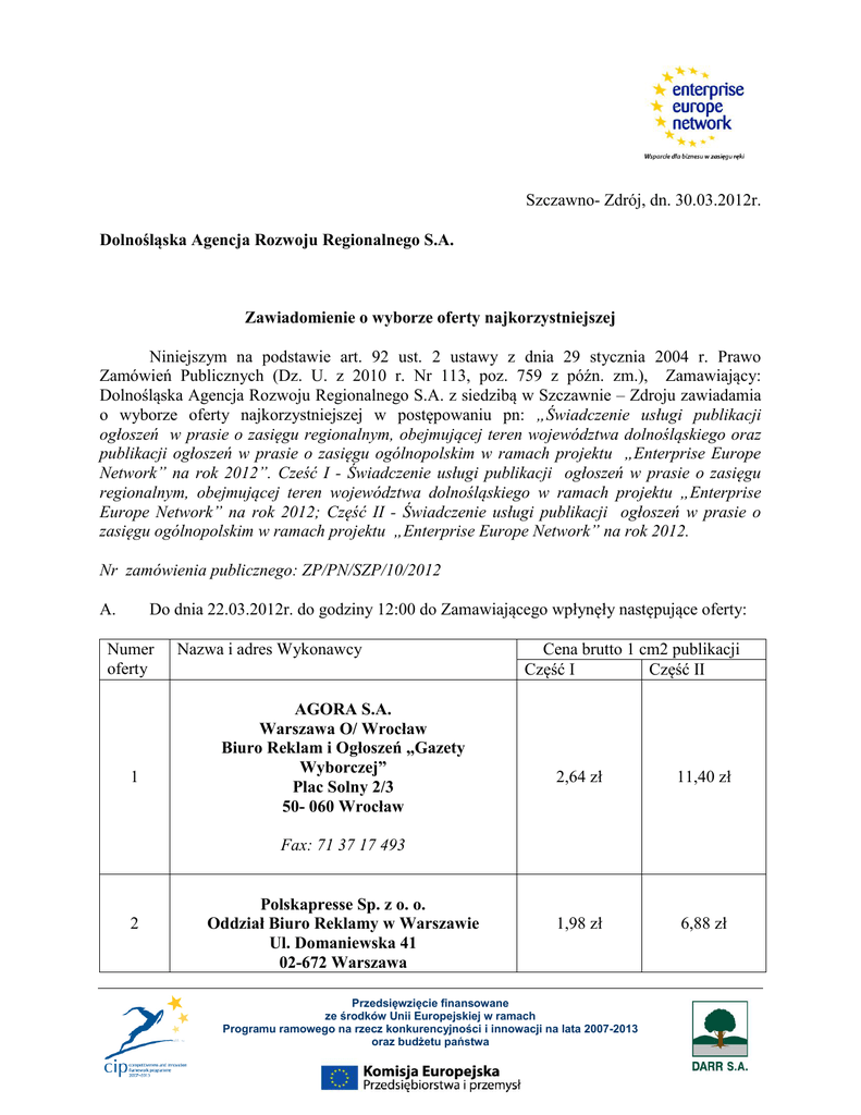 Szczawno- Zdrój, dn. 30.03.2012r. Dolnośląska Agencja Rozwoju Regionalnego S.A. Zawiadomienie o wyborze oferty najkorzystniejszej Niniejszym na podstawie art. 92 ust. 2 ustawy z dnia 29 stycznia 2004 r. Prawo Zamówień Publicznych (Dz. U. z 2010 r. Nr 113, poz. 759 z późn. zm.), Zamawiający: Dolnośląska Agencja Rozwoju Regionalnego S.A. z siedzibą w Szczawnie – Zdroju zawiadamia o wyborze oferty najkorzystniejszej w postępowaniu pn: „Świadczenie usługi publikacji ogłoszeń w prasie o zasięgu regionalnym, obejmującej teren województwa dolnośląskiego oraz publikacji ogłoszeń w prasie o zasięgu ogólnopolskim w ramach projektu „Enterprise Europe Network” na rok 2012”. Cześć I - Świadczenie usługi publikacji ogłoszeń w prasie o zasięgu regionalnym, obejmującej teren województwa dolnośląskiego w ramach projektu „Enterprise Europe Network” na rok 2012; Część II - Świadczenie usługi publikacji ogłoszeń w prasie o zasięgu ogólnopolskim w ramach projektu „Enterprise Europe Network” na rok 2012. Nr zamówienia publicznego: ZP/PN/SZP/10/2012 Do dnia 22.03.2012r. do godziny 12:00 do Zamawiającego wpłynęły następujące oferty: A. Numer oferty 1 Nazwa i adres Wykonawcy AGORA S.A. Warszawa O/ Wrocław Biuro Reklam i Ogłoszeń „Gazety Wyborczej” Plac Solny 2/3 50- 060 Wrocław Cena brutto 1 cm2 publikacji Część I Część II 2,64 zł 11,40 zł 1,98 zł 6,88 zł Fax: 71 37 17 493 2 Polskapresse Sp. z o. o. Oddział Biuro Reklamy w Warszawie Ul. Domaniewska 41 02-672 Warszawa Przedsięwzięcie finansowane ze środków Unii Europejskiej w ramach Programu ramowego na rzecz konkurencyjności i innowacji na lata 2007-2013 oraz budżetu państwa Filia Wrocław Ul. Św. Antoniego 2/4 50-073 Wrocław Fax: 74 842 22 30 INFOR Biznes Sp. z o. o. Biuro Reklamy Ul. Okopowa 58/72 01-042 Warszawa 3 8,60 zł - Fax: 22 530 41 10 Zamawiający przyznał następującą punktację w ramach kryteriów oceny ofert: B. Numer oferty 1 Nazwa i adres Wykonawcy AGORA S.A. Warszawa O/ Wrocław Biuro Reklam i Ogłoszeń „Gazety Wyborczej” Plac Solny 2/3 50- 060 Wrocław Cena brutto 1 cm2 publikacji Część I Część II 75 pkt 60,35 pkt 100 pkt 100 pkt Fax: 71 37 17 493 2 Polskapresse Sp. z o. o. Oddział Biuro Reklamy w Warszawie Ul. Domaniewska 41 02-672 Warszawa Filia Wrocław Ul. Św. Antoniego 2/4 50-073 Wrocław Przedsięwzięcie finansowane ze środków Unii Europejskiej w ramach Programu ramowego na rzecz konkurencyjności i innowacji na lata 2007-2013 oraz budżetu państwa Fax: 74 842 22 30 3 INFOR Biznes Sp. z o. o. Biuro Reklamy Ul. Okopowa 58/72 01-042 Warszawa - 80 pkt Fax: 22 530 41 10 C. Zamawiający dokonał wyboru obydwóch ofert częściowych Wykonawcy (dla części I oraz II zamówienia): Polskapresse Sp. z o. o. Oddział Biuro Reklamy w Warszawie Ul. Domaniewska 41 02-672 Warszawa Filia Wrocław Ul. Św. Antoniego 2/4, 50-073 Wrocław W postępowaniu przetargowym uczestniczyło 3 Wykonawców. Wybrane oferty częściowe zostały sporządzone prawidłowo, treść dokumentów oraz ich daty odpowiadają wymogom określonym w specyfikacji istotnych warunków zamówienia. Oferty częściowe w myśl przyjętego kryterium oceny ofert otrzymały po 100 pkt i tym samym zostały najwyżej ocenione przez Zamawiającego. D. Zamawiający nie odrzucił żadnej oferty w postępowaniu. E. Zamawiający nie wykluczył żadnego wykonawcy z postępowania. F. Zamawiający informuje, że zgodnie z art. 94 ust. 2 pkt 3 lit. „a” Ustawy Prawo Zamówień Publicznych umowa w sprawie niniejszego zamówienia może zostać zawarta z pominięciem terminów o których mowa w art. 94 ust. 1 pkt. 1 tej Ustawy. O Przedsięwzięcie finansowane ze środków Unii Europejskiej w ramach Programu ramowego na rzecz konkurencyjności i innowacji na lata 2007-2013 oraz budżetu państwa planowanym terminie zawarcia umowy wybrany wykonawca zostanie poinformowany odrębnym pismem. G. Zamawiający jednocześnie informuje, iż wobec czynności podjętych przez Zamawiającego w toku postępowania można wnieść środki ochrony prawnej przewidziane w Dziale VI Ustawy z dnia 29 stycznia 2004r. Prawo Zamówień Publicznych (Dz. U. z 2010 r. Nr 113, poz. 759 z późn. zm.). Zatwierdzam: ……………………………….. Przedsięwzięcie finansowane ze środków Unii Europejskiej w ramach Programu ramowego na rzecz konkurencyjności i innowacji na lata 2007-2013 oraz budżetu państwa