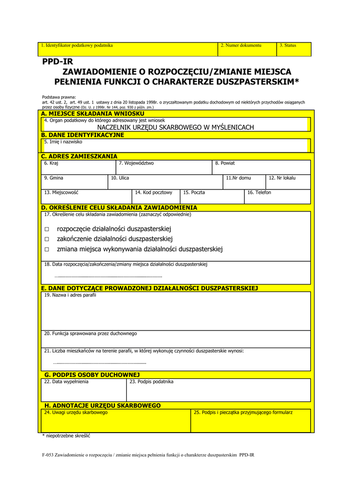1. Identyfikator podatkowy podatnika 2. Numer dokumentu 3. Status PPD-IR ZAWIADOMIENIE O ROZPOCZĘCIU/ZMIANIE MIEJSCA PEŁNIENIA FUNKCJI O CHARAKTERZE DUSZPASTERSKIM* Podstawa prawna: art. 42 ust. 2, art. 49 ust. 1 ustawy z dnia 20 listopada 1998r. o zryczałtowanym podatku dochodowym od niektórych przychodów osiąganych przez osoby fizyczne (Dz. U. z 1998r. Nr 144, poz. 930 z późn. zm.) A. MIEJSCE SKŁADANIA WNIOSKU 4. Organ podatkowy do którego adresowany jest wniosek NACZELNIK URZĘDU SKARBOWEGO W MYŚLENICACH B. DANE IDENTYFIKACYJNE 5. Imię i nazwisko C. ADRES ZAMIESZKANIA 6. Kraj 9. Gmina 13. Miejscowość 7. Województwo 8. Powiat 10. Ulica 11.Nr domu 14. Kod pocztowy 15. Poczta 12. Nr lokalu 16. Telefon D. OKREŚLENIE CELU SKŁADANIA ZAWIADOMIENIA 17. Określenie celu składania zawiadomienia (zaznaczyć odpowiednie) □ □ □ rozpoczęcie działalności duszpasterskiej zakończenie działalności duszpasterskiej zmiana miejsca wykonywania działalności duszpasterskiej 18. Data rozpoczęcia/zakończenia/zmiany miejsca działalności duszpasterskiej …........................................................................ E. DANE DOTYCZĄCE PROWADZONEJ DZIAŁALNOŚCI DUSZPASTERSKIEJ 19. Nazwa i adres parafii 20. Funkcja sprawowana przez duchownego 21. Liczba mieszkańców na terenie parafii, w której wykonuję czynności duszpasterskie wynosi: ….............................................................. G. PODPIS OSOBY DUCHOWNEJ 22. Data wypełnienia 23. Podpis podatnika H. ADNOTACJE URZĘDU SKARBOWEGO 24. Uwagi urzędu skarbowego 25. Podpis i pieczątka przyjmującego formularz * niepotrzebne skreślić F-053 Zawiadomienie o rozpoczęciu / zmianie miejsca pełnienia funkcji o charakterze duszpasterskim PPD-IR