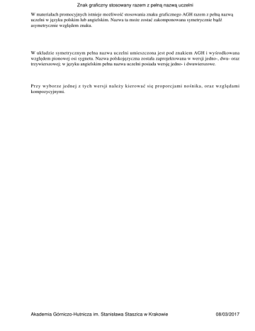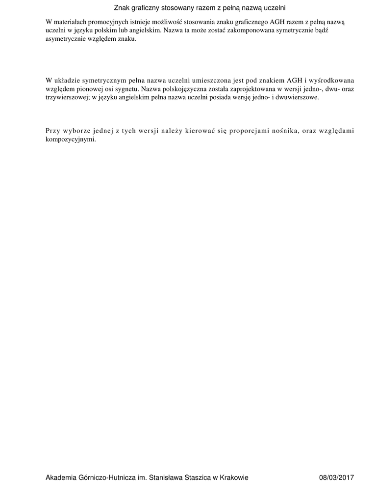 Znak graficzny stosowany razem z pełną nazwą uczelni W materiałach promocyjnych istnieje możliwość stosowania znaku graficznego AGH razem z pełną nazwą uczelni w języku polskim lub angielskim. Nazwa ta może zostać zakomponowana symetrycznie bądź asymetrycznie względem znaku. W układzie symetrycznym pełna nazwa uczelni umieszczona jest pod znakiem AGH i wyśrodkowana względem pionowej osi sygnetu. Nazwa polskojęzyczna została zaprojektowana w wersji jedno-, dwu- oraz trzywierszowej; w języku angielskim pełna nazwa uczelni posiada wersję jedno- i dwuwierszowe. Przy wyborze jednej z tych wersji należy kierować się proporcjami nośnika, oraz względami kompozycyjnymi. Akademia Górniczo-Hutnicza im. Stanisława Staszica w Krakowie 08/03/2017