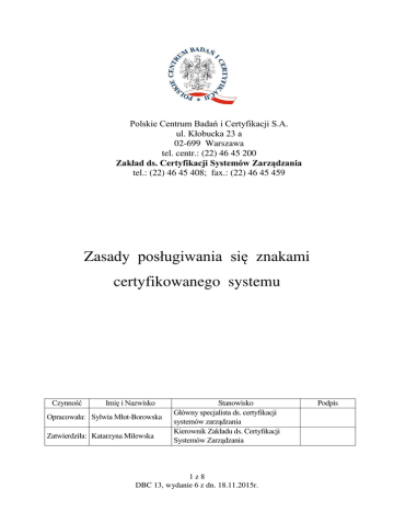 Polskie Centrum Badań i Certyfikacji S.A. ul. Kłobucka 23 a 02-699 Warszawa tel. centr.: (22) 46 45 200 Zakład ds. Certyfikacji Systemów Zarządzania tel.: (22) 46 45 408; fax.: (22) 46 45 459 Zasady posługiwania się znakami certyfikowanego systemu Czynność Imię i Nazwisko Opracowała: Sylwia Młot-Borowska Zatwierdziła: Katarzyna Milewska Stanowisko żłówny specjalista ds. certyfikacji systemów zarządzania Kierownik Zakładu ds. Certyfikacji Systemów Zarządzania 1z8 DBC 13, wydanie 6 z dn. 18.11.2015r. Podpis Spis treści 1. Wstęp .......................................................................................................................................... 3 2. Terminy i definicje ..................................................................................................................... 3 3. Postanowienia ogólne ................................................................................................................. 3 4. Żorma, wygląd, umiejscowienie znaków .................................................................................... 5 5. Stosowanie znaków w dokumentach i materiałach reklamowych .............................................. 6 6. Pozostałe ograniczenia i uwarunkowania dotyczące stosowania znaków ................................. 6 7. Tekstowe powoływanie się certyfikację ..................................................................................... 7 8. Sankcje........................................................................................................................................ 7 9. Postanowienia końcowe .............................................................................................................. 8 10. Dokumenty związane ............................................................................................................... 8 2z8 DBC 13, wydanie 6 z dn. 18.11.2015r. 1. Wstęp W niniejszym dokumencie Polskie Centrum Badań i Certyfikacji S.A. określiło warunki, na jakich organizacje certyfikowane przez PCBC S.A. w zakresie systemów zarządzania mogą powoływać się za znaki, tj. znak PCBC S.A. oraz na: znak FSSC 22000– Żundacji Bezpieczeństwa ywności i znak IQNet – Międzynarodowej Sieci Certyfikacji. W/w znaki są wydawane przez PCBC S.A. w celu posługiwania się nimi przez certyfikowane organizacje. Znaki informują, e klient przeszedł pozytywnie proces certyfikacji / odnowienia / wznowienia. 2. Terminy i definicje 2.1. Znaki certyfikowanego systemu to graficzne symbole PCBC S.A. odniesione do konkretnych norm (systemów) wdro onych u klienta i certyfikowanych przez PCBC S.A. (dalej zwane znakami) oraz graficzny znak fundacji FSSC 22000 i sieci IQNet. 2.2. Dokument organizacji-zapis na dowolnym nośniku (papierowym lub elektronicznym, np.: papier firmowy, folder, materiały reklamowe, promocyjne, informacyjne, strony internetowe, itp. 2.3. Klient/organizacja - podmiot certyfikowany przez PCBC S.A. 2.4. IQNet - Międzynarodowa Sieć Certyfikacji (Intemational Certification Network) do której nale y PCBC S.A. 3. Postanowienia ogólne 3.1. Polskie Centrum Badań i Certyfikacji S.A. jest właścicielem znaków certyfikowanych systemów, które zostały określone w niniejszym dokumencie i ma prawo do przekazywania ich certyfikowanym klientom w celu ich stosowania. 3.2. PCBC S.A. ma prawo przekazywać znak IQNet-u certyfikowanym klientom w celu stosowania z zastrze eniem pkt. 3.5. do 3.11. 3.3. Certyfikowane organizacje mogą stosować znaki wyłącznie w okresie wa ności certyfikatu na dokumentach, które dotyczą obszaru działania organizacji, określonego w zakresie certyfikatu. 3.4. Znaki PCBC S.A. powinny być stosowane przez certyfikowaną organizację w połączeniu ze znakiem FSSC 22000 i IQNet - z zastrze eniem pkt. 3.5. do 3.11. 3.5. Znak IQNet nie mo e być stosowany łącznie ze znakiem PCBC S.A. w przypadku, gdy klient certyfikował w PCBC S.A. wyłącznie wymagania: 3z8 DBC 13, wydanie 6 z dn. 18.11.2015r. - Codex Alimentarius; - Systemu Przeciwdziałania Zagro eniom Korupcyjnym; - Kryteria Wewnętrznego Systemu Kontroli (WSK). 3.6. Znaki nie mogą być stosowane w sposób wprowadzający zainteresowane strony w błąd. Certyfikowana organizacja nie mo e składać lub dopuszczać do składania jakichkolwiek wprowadzających w błąd oświadczeń, odnoszących się do swojego zakresu oraz dopuszczać do stosowania certyfikatu lub jakiejkolwiek jego części równie w sposób wprowadzający w błąd. 3.7. Znaki nie mogą być stosowane na raportach z badań laboratoryjnych, wzorcowań lub kontroli. 3.8. Znaki nie mogą być stosowane przez organizacje w sposób, który mógłby świadczyć, e odnoszą się one do wyrobu. W szczególności nie mogą być one umieszczane na wyrobie i opakowaniach jednostkowych wyrobu w miejscu widocznym dla konsumenta, lub w inny dowolny sposób, który mógłby być interpretowany jako oznaczający zgodność wyrobu. 3.9. W przypadku, gdy z jakichkolwiek powodów certyfikat systemu Organizacji utracił wa ność lub został zawieszony, organizacja powinna niezwłocznie: - zaprzestać stosowania znaków, będących wyró nikami certyfikatu; - uaktualnić wszystkie materiały reklamowe w przypadku ograniczenia zakresu certyfikacji. 3.10. Organizacja powinna niezwłocznie zaprzestać stosowania znaków w sytuacji, gdy sposób ich wykorzystania PCBC S.A. uzna za niedopuszczalny i pisemnie powiadomi o tym Organizację. 3.11. Organizacja nie mo e sugerować, e zakres certyfikacji odnosi się do działalności nie wymienionej na certyfikacie PCBC S.A. / IQNet. 3.12. Organizacja nie mo e wykorzystywać swojego certyfikatu w sposób, który naruszałby reputację PCBC S.A. i/ lub systemu certyfikacji oraz nara ałoby ją na utratę publicznej wiarygodności. 3.13. W przypadku jakichkolwiek wątpliwości co do zastosowania znaków, nale y zwrócić się do PCBC S.A. na piśmie w celu uzyskania wyjaśnień. 3.14