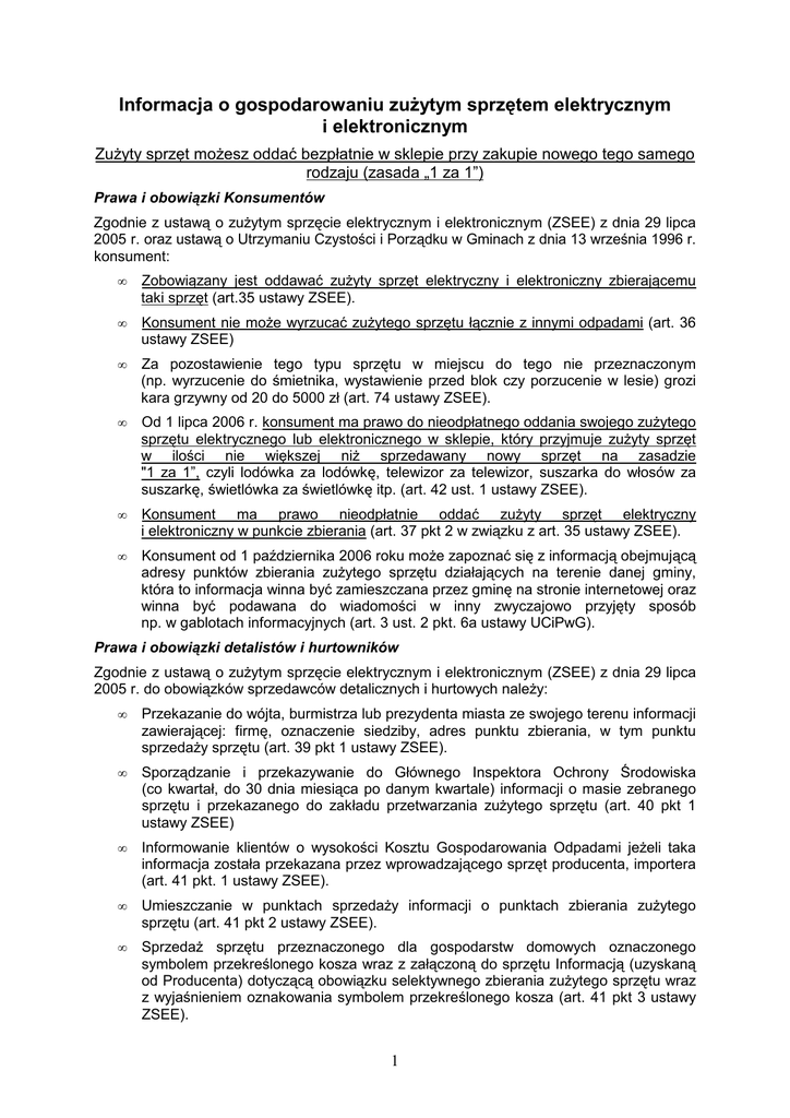 Informacja o gospodarowaniu zuŜytym sprzętem elektrycznym i elektronicznym ZuŜyty sprzęt moŜesz oddać bezpłatnie w sklepie przy zakupie nowego tego samego rodzaju (zasada „1 za 1”) Prawa i obowiązki Konsumentów Zgodnie z ustawą o zuŜytym sprzęcie elektrycznym i elektronicznym (ZSEE) z dnia 29 lipca 2005 r. oraz ustawą o Utrzymaniu Czystości i Porządku w Gminach z dnia 13 września 1996 r. konsument: • Zobowiązany jest oddawać zuŜyty sprzęt elektryczny i elektroniczny zbierającemu taki sprzęt (art.35 ustawy ZSEE). • Konsument nie moŜe wyrzucać zuŜytego sprzętu łącznie z innymi odpadami (art. 36 ustawy ZSEE) • Za pozostawienie tego typu sprzętu w miejscu do tego nie przeznaczonym (np. wyrzucenie do śmietnika, wystawienie przed blok czy porzucenie w lesie) grozi kara grzywny od 20 do 5000 zł (art. 74 ustawy ZSEE). • Od 1 lipca 2006 r. konsument ma prawo do nieodpłatnego oddania swojego zuŜytego sprzętu elektrycznego lub elektronicznego w sklepie, który przyjmuje zuŜyty sprzęt w ilości nie większej niŜ sprzedawany nowy sprzęt na zasadzie "1 za 1”, czyli lodówka za lodówkę, telewizor za telewizor, suszarka do włosów za suszarkę, świetlówka za świetlówkę itp. (art. 42 ust. 1 ustawy ZSEE). • Konsument ma prawo nieodpłatnie oddać zuŜyty sprzęt elektryczny i elektroniczny w punkcie zbierania (art. 37 pkt 2 w związku z art. 35 ustawy ZSEE). • Konsument od 1 października 2006 roku moŜe zapoznać się z informacją obejmującą adresy punktów zbierania zuŜytego sprzętu działających na terenie danej gminy, która to informacja winna być zamieszczana przez gminę na stronie internetowej oraz winna być podawana do wiadomości w inny zwyczajowo przyjęty sposób np. w gablotach informacyjnych (art. 3 ust. 2 pkt. 6a ustawy UCiPwG). Prawa i obowiązki detalistów i hurtowników Zgodnie z ustawą o zuŜytym sprzęcie elektrycznym i elektronicznym (ZSEE) z dnia 29 lipca 2005 r. do obowiązków sprzedawców detalicznych i hurtowych naleŜy: • Przekazanie do wójta, burmistrza lub prezydenta miasta ze swojego terenu informacji zawierającej: firmę, oznaczenie siedziby, adres punktu zbierania, w tym punktu sprzedaŜy sprzętu (art. 39 pkt 1 ustawy ZSEE). • Sporządzanie i przekazywanie do Głównego Inspektora Ochrony Środowiska (co kwartał, do 30 dnia miesiąca po danym kwartale) informacji o masie zebranego sprzętu i przekazanego do zakładu przetwarzania zuŜytego sprzętu (art. 40 pkt 1 ustawy ZSEE) • Informowanie klientów o wysokości Kosztu Gospodarowania Odpadami jeŜeli taka informacja została przekazana przez wprowadzającego sprzęt producenta, importera (art. 41 pkt. 1 ustawy ZSEE). • Umieszczanie w punktach sprzedaŜy informacji o punktach zbierania zuŜytego sprzętu (art. 41 pkt 2 ustawy ZSEE). • SprzedaŜ sprzętu przeznaczonego dla gospodarstw domowych oznaczonego symbolem przekreślonego kosza wraz z załączoną do sprzętu Informacją (uzyskaną od Producenta) dotyczącą obowiązku selektywnego zbierania zuŜytego sprzętu wraz z wyjaśnieniem oznakowania symbolem przekreślonego kosza (art. 41 pkt 3 ustawy ZSEE). 1 • Od 1 lipca 2006 r. – obowiązek nieodpłatnego przyjęcia zuŜytego sprzętu elektrycznego i elektronicznego w ilości nie większej niŜ sprzedawany nowy sprzęt na zasadzie "1 za 1”, czyli lodówka za lodówkę, telewizor za telewizor, suszarka do włosów za suszarkę, świetlówka za świetlówkę itp. (art. 42 pkt 1 ustawy ZSEE). • Od 1 lipca 2006 r. – Sprzedawca detaliczny zobowiązany jest do nieodpłatnego przekazania przyjętego zuŜytego sprzętu prowadzącemu zakład przetwarzania lub sprzedawcy hurtowemu (art. 42 pkt 2 ustawy ZSEE). • Od 1 lipca 2006 r. – Sprzedawca hurtowy zobowiązany jest do nieodpłatnego przekazania przyjętego zuŜytego sprzętu prowadzącemu zakład przetwarzania (art. 42 pkt 3 ustawy ZSEE). Prawa i obowiązki producentów i importerów Na mocy ustawy z 29 lipca 2005 o zuŜytym sprzęcie elektrycznym i elektronicznym (ZSEE) na producentach i importerach wprowadzających na rynek polski urządzenia elektryczne i elektroniczne spoczywa obowiązek zorganizowania, sfinansowania, zbierania, odbioru, przetwarzania, odzysku i recyklingu zuŜytego sprzętu. Ustawa ta dopuszcza przeniesienie części zobowiązań z wprowadzającego na organizację odzysku sprzętu elektrycznego i elektronicznego (art. 57 ustawy ZSEE), a w przypadku wprowadzających sprzęt oświetleniowy nawet zobowiązuje do przeniesienia obowiązków na organizację odzysku sprzętu elektrycznego i elektronicznego taką jak np. ElektroEko (art. 34 ustawy ZSEE). Firmy, które nie podpiszą umowy ze stosowną organizacja odzysku zobowiązane są do złoŜenia zabezpieczenia finansowego stanowiącego gwarancję sfinansowania ciąŜących na nich obowiązków na wypadek ich niewykonania lub nieprawidłowego ich wykonania. Na stronie www.elektroeko.pl lub pod bezpłatną infolinią 0800 000 080 uzyskać moŜna informacje o największej organizacja tego typu: ElektroEko Organizacja Odzysku Sprzętu Elektrycznego i Elektronicznego S.A. Powołana została do Ŝycia przez największe firmy i organizacje zrzeszające producentów i importerów sprzętu AGD, RTV, IT i Oświetlenia. W imieniu swoich klientów realizuje ich zobowiązania wynikające z ustawy z 29 lipca 2005 o zuŜytym sprzęcie elektrycznym i elektronicznym: • • • organizuje sprawny i efektywny kosztowo system zbierania zuŜytego sprzętu, odbierania go z punktu zbierania, poddawania go procesom przetwarzania, odzysku, recyklingu i unieszkodliwiania, składa do Głównego Inspektora Ochrony Środowiska stosowne sprawozdania i rozliczenia, prowadzi działania edukacyjne popularyzujące ideę selektywnego zbierania zuŜytego sprzętu elektrycznego i elektronicznego. ElektroEko działa na podstawie ustawy o zuŜytym sprzęcie elektrycznym i elektronicznym, która nakłada na kaŜdego Wprowadzającego tj. producent