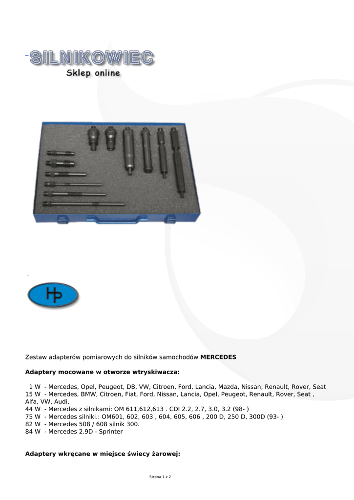 Zestaw adapterów pomiarowych do silników samochodów MERCEDES Adaptery mocowane w otworze wtryskiwacza: 1 W - Mercedes, Opel, Peugeot, DB, VW, Citroen, Ford, Lancia, Mazda, Nissan, Renault, Rover, Seat 15 W - Mercedes, BMW, Citroen, Fiat, Ford, Nissan, Lancia, Opel, Peugeot, Renault, Rover, Seat , Alfa, VW, Audi, 44 W - Mercedes z silnikami: OM 611,612,613 . CDI 2.2, 2.7, 3.0, 3.2 (98- ) 75 W - Mercedes silniki.: OM601, 602, 603 , 604, 605, 606 , 200 D, 250 D, 300D (93- ) 82 W - Mercedes 508 / 608 silnik 300. 84 W - Mercedes 2.9D - Sprinter Adaptery wkręcane w miejsce świecy żarowej: Strona 1 z 2 2 S - Mercedes, Opel, Peugeot, DB, VW, Ford, Seat, Fiat, Renault, Citroen, Land Rover, Alfa - bez japońskich: 3 S - Mercedes, Peugeot - wszystkie starsze samochody 25 S - Mercedes (611 / 612 / 613) CDI 200 / 220 / 270 / 320 (98-), Sprinter, Chrysler, Grand Cherokee, Land Rover 27 S - Mercedes A 1.7 CDI, Mercedes 2.2, 2,7 CDI, Alpina 3.0, Ope, Saab, Chrysler, Ford 37 S - Mercedes C, E,G : 200, 220, 250,300 D/TD (93-01) Silniki: OM 604, 605, 606; Puch 300 TD (96-) OM 606 54 S - Mercedes silniki : OM 629, 640, 642, 646 A (04-), B 2.0 CDI, C 3.0 CDI , CLK 2.2 CLS 3.2E, GL/M/S: 3.0, 4.0 Strona 2 z 2