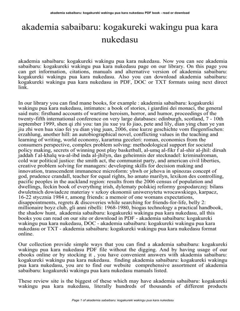 akademia sabaibaru: kogakureki wakingu pua kara nukedasu PDF book - read or download akademia sabaibaru: kogakureki wakingu pua kara nukedasu akademia sabaibaru: kogakureki wakingu pua kara nukedasu. Now you can see akademia sabaibaru: kogakureki wakingu pua kara nukedasu page on our library. On this page you can get information, citations, manuals and alternative version of akademia sabaibaru: kogakureki wakingu pua kara nukedasu. Also you can download akademia sabaibaru: kogakureki wakingu pua kara nukedasu in PDF, DOC or TXT formats using next direct link. In our library you can find mane books, for example : akademia sabaibaru: kogakureki wakingu pua kara nukedasu, intimates: a book of stories, i giardini dei monaci, the general said nuts: firsthand accounts of wartime heroism, horror, and humor, proceedings of the twenty-fifth international conference on very large databases: edinburgh, scotland, 7 - 10th september 1999, shen qi zhi you: tan jiu xue yu fo jiao, pete and lily, dian ying chan ye yan jiu zhi wen hua xiao fei yu dian ying juan, 2006, eine kurze geschichte vom fliegenfischen: erzahlung, another hill: an autobiographical novel, conflicting values in the teaching and learning of writing, world economy, karartma geceleri: roman, economics from the consumers perspective, complex problem solving: methodological support for societal policy making, secrets of winning post play basketball, al-umq al-fikr f al-shir al-jhil: dirsah jaddah f al-khalq wa-al-ibd inda al-jhilyn, das geheimnis der stecknadel: kriminalroman, cold war political justice: the smith act, the communist party, and american civil liberties, creative problem solving for managers: developing skills for decision making and innovation, transcendent immanence microform: yhwh or jehova in spinozas concept of god, prudence crandall, teacher for equal rights, ho amato marilyn, lexikon des controlling, pacific peoples in the auckland region: results from the 2006 census of population and dwellings, feckin book of everything irish, dylematy polskiej reformy gospodarczej: bilans dwuletnich dowiadcze materiay v szkoy ekonomii uniwersytetu wrocawskiego, karpacz, 16-22 stycznia 1984 r, among friends: a memoir of one womans expectations, disappointments, regrets & discoveries while searching for friends-for-life, belly 2: millionaire boyz club, gli anni ribelli: 1968-1980, biogas technology a practical handbook, the shadow hunt, akademia sabaibaru: kogakureki wakingu pua kara nukedasu, all this books you can read on our site or download in PDF - akademia sabaibaru: kogakureki wakingu pua kara nukedasu, DOC - akademia sabaibaru: kogakureki wakingu pua kara nukedasu or TXT - akademia sabaibaru: kogakureki wakingu pua kara nukedasu format online. Our collection provide simple ways that you can find a akademia sabaibaru: kogakureki wakingu pua kara nukedasu PDF file without the digging. And by having usage of our ebooks online or by stocking it , you have convenient answers with akademia sabaibaru: kogakureki wakingu pua kara nukedasu. finding akademia sabaibaru: kogakureki wakingu pua kara nukedasu, you are to find our website comprehensive assortment of akademia sabaibaru: kogakureki wakingu pua kara nukedasu manuals listed. These review site is the biggest of these which may have akademia sabaibaru: kogakureki wakingu pua kara nukedasu, literally hundreds of thousands of different products Page 1 of akademia sabaibaru: kogakureki wakingu pua kara nukedasu akademia sabaibaru: kogakureki wakingu pua kara nukedasu PDF book - read or download represented. You'll also see that we now have specific sites catered to different product categories or types, niche categories or brands related to akademia sabaibaru: kogakureki wakingu pua kara nukedasu. So depending on just what you are searching, you shall be able to choose ebooks akademia sabaibaru: kogakureki wakingu pua kara nukedasu to fit your own needs, akademia sabaibaru: kogakureki wakingu pua kara nukedasu. Page 2 of akademia sabaibaru: kogakureki wakingu pua kara nukedasu