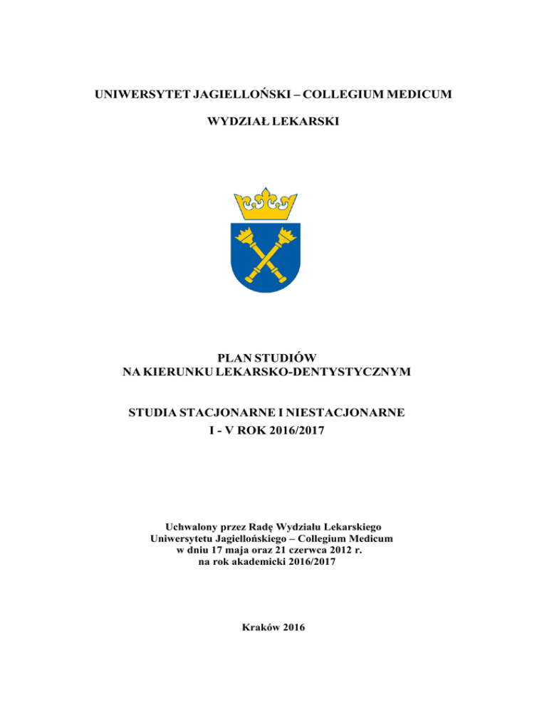 UNIWERSYTET JAGIELLOŃSKI – COLLEGIUM MEDICUM WYDZIAŁ LEKARSKI PLAN STUDIÓW NA KIERUNKU LEKARSKO-DENTYSTYCZNYM STUDIA STACJONARNE I NIESTACJONARNE I - V ROK 2016/2017 Uchwalony przez Radę Wydziału Lekarskiego Uniwersytetu Jagiellońskiego – Collegium Medicum w dniu 17 maja oraz 21 czerwca 2012 r. na rok akademicki 2016/2017 Kraków 2016 Objaśnienia: ”O” – przedmiot obowiązkowy do zaliczenia roku studiów „F” – przedmiot fakultatywny (do wyboru) „N” – przedmiot nadobowiązkowy Obowiązkowy wpis do indeksu: - na I roku studiów jeden kurs fakultatywny w zakresie filozofii - na II lub III roku studiów jeden kurs fakultatywny w zakresie nauk podstawowych - na IV roku studiów jeden kurs fakultatywny w zakresie nauk klinicznych Uruchomienie kursu fakultatywnego jest możliwe przy wpisie minimum 8 osób. Dziekan na wniosek studenta wyraża zgodę na wpis na kolejny rok studiów w przypadku uzyskania co najmniej 50 punktów ECTS. Materiały w wersji elektronicznej - www.wl.uj.edu.pl/dydaktyka Nazwa przedmiotu (TREŚCI PROGRAMOWYCH) wg planu studiów w UJ CM z uwzgl. Ramowego program naucz. MZ na KIERUNKU LEK - DENT nowelizacja z roku 2016/17 SEMESTR ECTS I: ECTS II: ECTS III: ECTS IV: ECTS V: 60 60 60 60 66 5373 306 Forma zaliczenia Ogólna liczba godzin Punkty ECTS RAZEM: 859 60 Forma zajęć O/F/N W S Ćw. I ROK STUDIÓW 2016/17: OPIEKUN - prof. dr hab. Jerzy Walocha I, II semestr: Anatomia z embriologią i podstawy genetyki WL-S1.Anat.Emb.Gen. WL-D1.Anat.Emb.Gen. Prof. dr hab. Jerzy Walocha I, II 65 Histologia z cytofizjologią WL-S1.Hist.Cyt. WL-D1.Hist.Cyt. Prof. dr hab. Jan Litwin I, II 52 Lektorat języka angielskiego 1/4 Poziom B2+ CM-CJ-A-LD-S-1 CM-CJ-A-LD-N-1 20 165 O Egzamin 250 22 58 O Egzamin 110 12 I, II 60 O Zaliczenie bez oceny 60 2 I, II 60 O Zaliczenie bez oceny 60 I, II 60 O Zaliczenie bez oceny 60 I 20 O Zaliczenie bez oceny 20 1 12 O Zaliczenie na ocenę 30 3 Koordynator zajęć: Mgr Iwona Misztal Lektorat języka łacińskiego\* CM-CJ-L-LD-S-1 CM-CJ-L-LD-N-1 Koordynator zajęć: Mgr Iwona Misztal Wychowanie fizyczne Dr Dorota Palik I semestr: Informatyka i statystyka medyczna 1/2 WL-S1.Inf.Stat. WL-D1.Inf.Stat. Prof. dr hab. Irena Roterman-Konieczna Propedeutyka medycyny i stomatologii WL-S1.Prop.MiS WL-D1.Prop.MiS I 14 4 I 12 13 O Egzamin 25 2 15 O Zaliczenie bez oceny 15 1 Dr hab. Jolanta Pytko-Polończyk, prof.UJ Historia medycyny i stomatologii WL-S1.Hist.MiS. WL-D1.Hist.MiS. Dr hab. Ryszard Gryglewski, prof. UJ Filozofia WL-S1.Filoz. WL-D1.Filoz. Prof. dr hab. Jan Hartman I Pierwsza pomoc medyczna i elementy pielęgniarstwa WL-S1.Pom.Piel. WL-D1.Pom.Piel. II semestr: Pierwsza pomoc 6 16 4 4 II 4 II 5 II 10 II Elementy pielęgniarstwa O Zaliczenie na ocenę 30 3 26 O Zaliczenie na ocenę 30 2 28 O Zaliczenie na ocenę 45 3 20 O Zaliczenie bez oceny 30 3 O Zaliczenie bez oceny 4 Koordynator zajęć: Prof. dr hab. Janusz Andres Prowadzący zajęcia: Prof. dr hab. Janusz Andres Dr Michał Nowakowski Higiena WL-S1.Hig. WL-D1.Hig. Dr hab. Małgorzata Bała Profilaktyka stomatologiczna WL-S1.Prof.Stom. WL-D1.Prof.Stom. 12 Dr hab. Marta Cześnikiewicz-Guzik Materiałoznawstwo i sprzęt stomatologiczny 1/2 WL-S1.Mat.Sprz. WL-D1.Mat.Sprz. Koordynator zajęć: Dr hab. inż. Anna Ryniewicz Szkolenie w zakresie bezpieczeństwa i higieny pracy 4 Zajęcia fakultatywne (do wyboru): Koordynator zajęć: Prof. dr hab. Jan Hartman Filozofia medycyny - zarys problematyki WL-SL1.F1 WL-DN1.F1 Wprowadzenie do filozofii nauki WL-SL1.F2 WL-DN1.F2 Cierpienie, śmierć i fenomen troski w perspektywie bioetyki transkulturowej WL-SL1.F3 WL-DN1.F3 Estetyka, sztuka, medycyna WL-SL1.F4 WL-DN1.F4 Główne problemy filozofii człowieka WL-SL1.F5 WL-DN1.F5 II 30 O Zaliczenie na ocenę 30 2 60 O Zaliczenie bez oceny 60 2 60 O Zaliczenie bez oceny 60 2 Filozoficzne aspekty koncepcji zaburzeń psychicznych w myśli Franka i Kepińskiego WL-SL1.F7 WL-DN1.F7 Aksologiczna koncepcja człowieka WL-SL1.F8 WL-DN1.F8 Śmierć i umieranie w różnych kulturach WL-SL1.F9 WL-DN1.F9 Medycyna Trzeciej Rzeszy WL-SL1.F10 WL-DN1.F10 Koordynator: Dr hab. Jolanta Ambrosewicz-Jacobs Praktyka wakacyjna: Praktyka w zakresie organizacji ochrony zdrowia Praktyka lekarska na chirurgii ogólnej, chorobach wewnętrznych lub na chirurgii szczękowo-twarzowej \* Dla osób nie posiadających oceny z tego przedmiotu na świadectwie ukończenia szkoły średniej Sekwencyjność przedmiotów - warunki dopuszczenia do egzaminu, zaliczenia lub zajęć roku II: Przedmiot z II roku Warunkiem dopuszczenia do egzaminu lub zaliczenia jest pozytywny wynik egzaminu z: Fizjologia człowieka Anatomia z embriologią i podstawy genetyki, histologia z cytofizjologią Immunologia Anatomia z embriologią i podstawy genetyki Przedmiot z II roku Warunkiem dopuszczenia do zajęć jest pozytywny wynik egzaminu lub zaliczenia z: Przedkliniczna stomatologia zintegrowana 1/2 Propedeutyka medycyny i stomatologii II ROK STUDIÓW 2016/17: OPIEKUN - prof. dr hab. Maria Wróbel III, IV semestr: Biochemia z elementami chemii WL-S2.Bioch.Chem. WL-D2.Bioch.Chem. Prof. dr hab. Maria Wróbel Fizjologia człowieka WL-S2.Fizjol.Czł. WL-D2.Fizjol.Czł. III, IV 62 III, IV 114 52 RAZEM: 966 60 36 O Egzamin 150 9 56 O Egzamin 170 12 O Zaliczenie na ocenę 155 15 2 Przedkliniczna stomatologia zintegrowana 1/2 WL-S2.Prz.Stom.Zin. WL-D2.Prz.Stom.Zin. Dr hab. Jolanta Pytko-Polończyk, prof. UJ Prof. dr hab. Tomasz Brzozowski Ergonomia w stomatologii 3 5 22 5 8 32 3 5 17 Periodontologia przedkliniczna 1 3 11 Protetyka przedkliniczna 4 7 29 Stomatologia zachowawcza przedkliniczna Endodoncja przedkliniczna Lektorat języka angielskiego 2/4 Poziom B2+ CM-CJ-A-LD-S-2 CM-CJ-A-LD-N-2 III, IV III, IV 60 O Zaliczenie bez oceny 60 Lektorat języka obcego od II do V roku studiów (do wyboru: francuski, niemiecki, rosyjski III, IV kontynuacja ze szkoły średniej) 60 F Zaliczenie bez oceny 60 60 N Zaliczenie bez oceny 60 36 O Egzamin 48 2 III 45 O Zaliczenie na