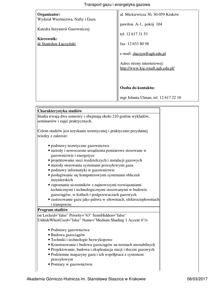Transport gazu i energetyka gazowa Organizator: Wydział Wiertnictwa, Nafty i Gazu al. Mickiewicza 30, 30-059 Kraków pawilon A-1, pokój 104 Katedra Inżynierii Gazowniczej tel. 12 617 31 53 Kierownik: dr Stanisław Łuczyński fax: 12 633 80 58 e-mail: [email protected] Adres strony internetowej: http://www.kig.wnaft.agh.edu.pl/ Osoba do kontaktu: mgr Jolanta Ulman, tel. 12 617 22 10 Charakterystyka studiów Studia trwają dwa semestry i obejmują około 210 godzin wykładów, seminariów i zajęć praktycznych. Celem studiów jest uzyskanie teoretycznej i praktycznie przydatnej wiedzy z zakresie: • podstawy teoretyczne gazownictwa • metody i nowoczesne urządzenia pomiarowe stosowane w gazownictwie i energetyce • projektowanie sieci rozdzielczych i instalacji gazowych • metody sterowania systemami przesyłowymi gazu • podstawy informatyki w gazownictwie • posługiwanie się komputerowymi systemami obliczeń inżynierskich • zapoznanie uczestników z najnowszymi rozwiązaniami technicznymi i technologicznymi stosowanymi w budowie gazociągów, w kotłach i podgrzewaczach gazowych • zastosowanie gazu jako paliwa w siłowniach, elektrociepłowniach i transporcie. Program studiów on Locked="false" Priority="63" SemiHidden="false" UnhideWhenUsed="false" Name="Medium Shading 1 Accent 4"/> • Podstawy gazownictwa • Budowa gazociągów • Techniki i technologie bezwykopowe • Konstruowanie i budowa gazociągów na terenach niestabilnych • Projektowanie, budowa i eksploatacja stacji i tłoczni gazowych • Podziemne magazyny gazu i ich współpraca z systemem przesyłowym • Pomiary w gazownictwie Akademia Górniczo-Hutnicza im. Stanisława Staszica w Krakowie 08/03/2017 Transport gazu i energetyka gazowa • Systemy telemechaniki w sieci przesyłowej gazu • Sterowanie systemami przesyłowymi gazu • Podstawy informatyki w gazownictwie • Modelowanie i optymalizacja sieci gazowych • Spalanie gazu • Projektowanie, budowa i eksploatacja instalacji gazowych • Kotły i podgrzewacze gazowe • Siłownie i elektrociepłownie gazowe • Podstawy ekonomii w gazownictwie Sylwetka absolwenta Studia przeznaczone są w szczególności dla inżynierów zatrudnionych w przemyśle gazowniczym, energetyce i ciepłownictwie, a także dla absolwentów szkół wyższych, zajmujących się problematyką wykorzystania paliw gazowych, budowy gazociągów przesyłowych i sieci dystrybucyjnych oraz projektowaniem i eksploatacją instalacji i sieci gazowych. Absolwenci otrzymują najnowszą wiedzę teoretyczną, jak i wynikającą z praktyki, dotyczącą transportu gazu, eksploatacji sieci gazowych oraz instalacji, energetyki gazowej z elementami ciepłownictwa, a nawet podstaw ekonomii w gazownictwie. Ponadto słuchacze będą mieli możliwość wymiany doświadczeń, nawiązania kontaktów oraz wykonywania analiz, ćwiczeń i projektów. Ukończenie oferowanych studiów podyplomowych będzie stanowić podstawę do ubiegania się o uzyskanie specjalizacji zawodowej w sektorze gazowniczym, energetycznym i ciepłownictwie. Opłaty: 4.700 zł Czas trwania: 2 semestry Od X 2012 r. do IX 2013 r. Akademia Górniczo-Hutnicza im. Stanisława Staszica w Krakowie 08/03/2017 Transport gazu i energetyka gazowa Zasady naboru: Termin zgłoszeń: do 1 X 2012 r. Wymagane dokumenty: • podanie o przyjęcie na studia podyplomowe • odpis dyplomu ukończenia studiów wyższych lub poświadczona kserokopia dyplomu • kwestionariusz osobowy • skierowanie z zakładu pracy (można również zgłaszać się indywidualnie) zawierające deklarację dokonania wpłaty na studia Tryb zgłoszeń: kolejność wpływu podań kandydatów spełniających warunki rekrutacji. Liczba miejsc: 30 Miejsce zgłoszeń: AGH, Wydział Wiertnictwa, Nafty i Gazu al. Mickiewicza 30, 30-059 Kraków pawilon A-1, pokój 104 Osoba przyjmująca zgłoszenia: mgr Jolanta Ulman, tel.: 12 617 22 10 Informacje dodatkowe: Zajęcia odbywają się w systemie studiów niestacjonarnych, tzn. piątek (od godz. 14.00), sobota (od godz. 8.15 do godz. 17.30) i w niektóre niedziele (do godz. 12.00). Akademia Górniczo-Hutnicza im. Stanisława Staszica w Krakowie 08/03/2017