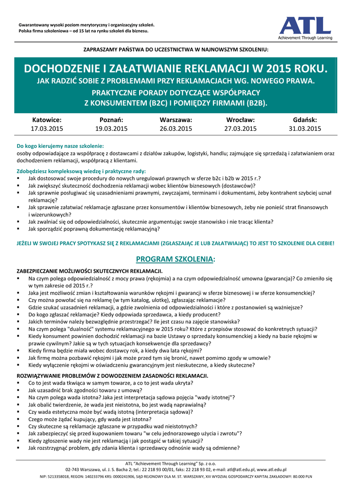 Gwarantowany wysoki poziom merytoryczny i organizacyjny szkoleń. Polska firma szkoleniowa – od 15 lat na rynku szkoleń dla biznesu. ZAPRASZAMY PAŃSTWA DO UCZESTNICTWA W NAJNOWSZYM SZKOLENIU: DOCHODZENIE I ZAŁATWIANIE REKLAMACJI W 2015 ROKU. JAK RADZIĆ SOBIE Z PROBLEMAMI PRZY REKLAMACJACH WG. NOWEGO PRAWA. PRAKTYCZNE PORADY DOTYCZĄCE WSPÓŁPRACY Z KONSUMENTEM (B2C) I POMIĘDZY FIRMAMI (B2B). Katowice: 17.03.2015 Poznań: 19.03.2015 Warszawa: 26.03.2015 Wrocław: 27.03.2015 Gdańsk: 31.03.2015 Do kogo kierujemy nasze szkolenie: osoby odpowiadające za współpracę z dostawcami z działów zakupów, logistyki, handlu; zajmujące się sprzedażą i załatwianiem oraz dochodzeniem reklamacji, współpracą z klientami. Zdobędziesz kompleksową wiedzę i praktyczne rady: Jak dostosować swoje procedury do nowych uregulowań prawnych w sferze b2c i b2b w 2015 r.? Jak zwiększyć skuteczność dochodzenia reklamacji wobec klientów biznesowych (dostawców)? Jak sprawnie posługiwać się uzasadnieniami prawnymi, zwyczajami, terminami i dokumentami, żeby kontrahent szybciej uznał reklamację? Jak sprawnie załatwiać reklamacje zgłaszane przez konsumentów i klientów biznesowych, żeby nie ponieść strat finansowych i wizerunkowych? Jak zwalniać się od odpowiedzialności, skutecznie argumentując swoje stanowisko i nie tracąc klienta? Jak sporządzić poprawną dokumentację reklamacyjną? JEŻELI W SWOJEJ PRACY SPOTYKASZ SIĘ Z REKLAMACJAMI (ZGŁASZAJĄC JE LUB ZAŁATWIAJĄC) TO JEST TO SZKOLENIE DLA CIEBIE! PROGRAM SZKOLENIA: ZABEZPIECZANIE MOŻLIWOŚCI SKUTECZNYCH REKLAMACJI. Na czym polega odpowiedzialność z mocy prawa (rękojmia) a na czym odpowiedzialność umowna (gwarancja)? Co zmieniło się w tym zakresie od 2015 r.? Jaka jest możliwość zmian i kształtowania warunków rękojmi i gwarancji w sferze biznesowej i w sferze konsumenckiej? Czy można powołać się na reklamę (w tym katalog, ulotkę), zgłaszając reklamacje? Gdzie szukać uzasadnień reklamacji, a gdzie zwolnienia od odpowiedzialności i które z postanowień są ważniejsze? Do kogo zgłaszać reklamacje? Kiedy odpowiada sprzedawca, a kiedy producent? Jakich terminów należy bezwzględnie przestrzegać? Ile jest czasu na zajęcie stanowiska? Na czym polega "dualność" systemu reklamacyjnego w 2015 roku? Które z przepisów stosować do konkretnych sytuacji? Kiedy konsument powinien dochodzić reklamacji na bazie Ustawy o sprzedaży konsumenckiej a kiedy na bazie rękojmi w prawie cywilnym? Jakie są w tych sytuacjach konsekwencje dla sprzedawcy? Kiedy firma będzie miała wobec dostawcy rok, a kiedy dwa lata rękojmi? Jak firmę można pozbawić rękojmi i jak może przed tym się bronić, nawet pomimo zgody w umowie? Kiedy wyłączenie rękojmi w oświadczeniu gwarancyjnym jest nieskuteczne, a kiedy skuteczne? ROZWIĄZYWANIE PROBLEMÓW Z DOWODZENIEM ZASADNOŚCI REKLAMACJI. Co to jest wada tkwiąca w samym towarze, a co to jest wada ukryta? Jak uzasadnić brak zgodności towaru z umową? Na czym polega wada istotna? Jaka jest interpretacja sądowa pojęcia "wady istotnej"? Jak obalić twierdzenie, że wada jest nieistotna, bo jest wadą naprawialną? Czy wada estetyczna może być wadą istotną (interpretacja sądowa)? Czego może żądać kupujący, gdy wada jest istotna? Czy skuteczne są reklamacje zgłaszane w przypadku wad nieistotnych? Jak zabezpieczyć się przed kupowaniem towaru "w celu jednorazowego użycia i zwrotu"? Kiedy zgłoszenie wady nie jest reklamacją i jak postąpić w takiej sytuacji? Jak rozstrzygnąć problem, gdy zdania klienta i sprzedawcy odnośnie wady są odmienne? ATL “Achievement Through Learning” Sp. z o.o. 02-743 Warszawa, ul. J. S. Bacha 2; tel.: 22 218 93 00/01, faks: 22 218 93 02, e-mail: [email protected], www.atl.edu.pl NIP: 5213358018, REGON: 140233796 KRS: 0000241906, SĄD REJONOWY DLA M. ST. WARSZAWY, XIII WYDZIAŁ GOSPODARCZY KAPITAŁ ZAKŁADOWY: 80.000 PLN Gwarantowany wysoki poziom merytoryczny i organizacyjny szkoleń. Polska firma szkoleniowa – od 15 lat na rynku szkoleń dla biznesu. ROZWIĄZYWANIE PROBLEMÓW ZE ZWROTEM TOWARÓW. W jakich sytuacjach możliwy jest zwrot towaru, w którym nie wystąpiła wada? Jakie są terminy, w których zwrot towaru bez wady jest możliwy? Kiedy termin taki ulega rozszerzeniu ponad 26-krotnie? Kiedy odstąpienie od umowy nie jest możliwe? Jak ująć kwestię zwrotu towaru (odstąpienia od umowy) w regulaminie sprzedaży przez internet? O czym należy poinformować konsumenta? Jakie prawa ma firma kupująca przez Internet? Czy odstąpienie od umowy jest wówczas możliwe? Jak można bronić się przed zwrotem towaru noszącego ślady użytkowania? Kiedy można obronić się przed zwrotem towaru wadliwego (odstąpieniem od umowy)? ROZWIĄZYWANIE PROBLEMÓW Z ZAŁATWIANIEM REKLAMACJI. Jakie terminy ma sprzedawca wobec konsumenta i firma wobec drugiej firmy na odpowiedź oraz na załatwienie reklamacji, w tym na naprawę? Czy sprzedawca musi uznać żądanie wymiany wadliwego towaru na nowy, jeżeli byłby skłonny do jego naprawy? Kiedy sprzedawca może sam zaproponować sposób załatwienia reklamacji, a kiedy jest zmuszony podporządkować się decyzji klienta? Kiedy klienta można odesłać do producenta a kiedy do wyspecjalizowanego serwisu? Jaki jest tryb załatwiania reklamacji dla towarów z określonym terminem przydatności do uzycia? Jak bronić się przed ponoszeniem dodatkowych kosztów lub odpowiedzialnością za szkodę po stronie klienta? Jak…? czy…? kiedy? - odpowiedzi na problemy zgłaszane przez uczestników STUDIA PRZYPADKÓW. Dobór argumentów prawnych i analiza drogi postępowania w konkretnych przypadkach reklamacyjnych Uczestnicy otrzymują obszerny komplet materiałów do wykorzystania w praktyce. DODATKOWO! Konsultacje po szkoleniu przez Internet. NOWOŚC! Zachęcamy uczestników do przesyłania pytań związanych z tematyką szkolenia na min. 10 dni przed jego terminem. PROWADZĄC