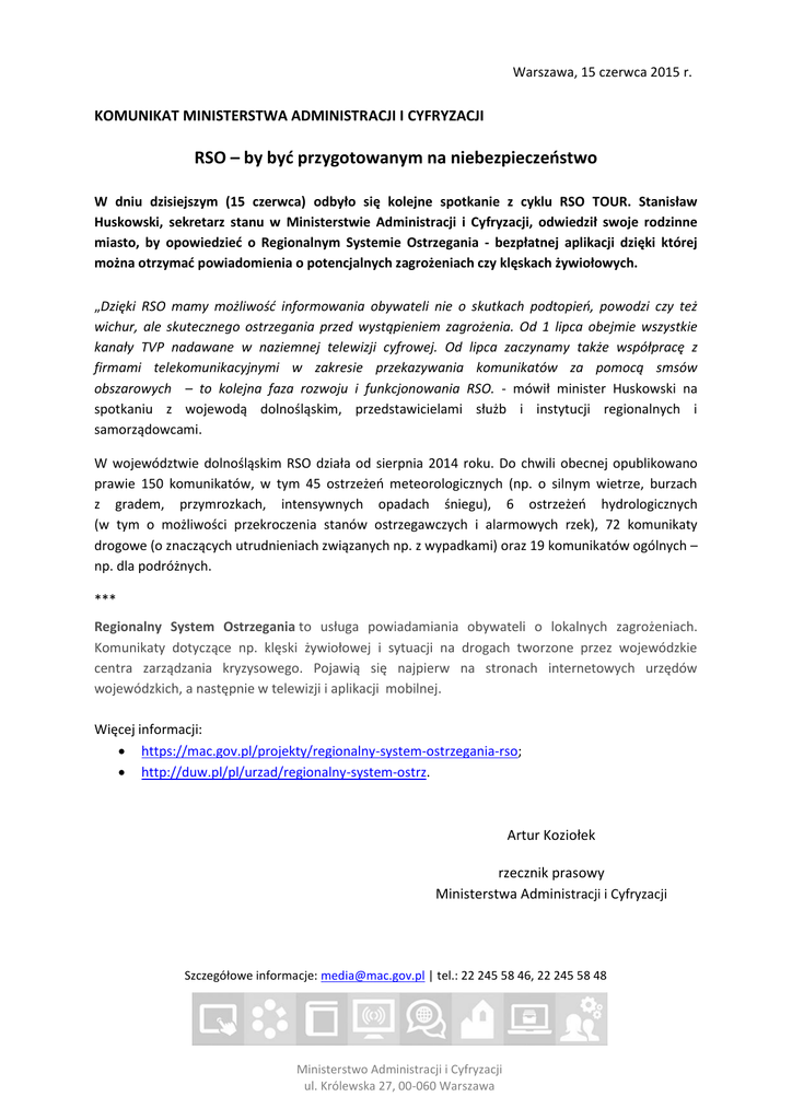 Warszawa, 15 czerwca 2015 r. KOMUNIKAT MINISTERSTWA ADMINISTRACJI I CYFRYZACJI RSO – by być przygotowanym na niebezpieczeństwo W dniu dzisiejszym (15 czerwca) odbyło się kolejne spotkanie z cyklu RSO TOUR. Stanisław Huskowski, sekretarz stanu w Ministerstwie Administracji i Cyfryzacji, odwiedził swoje rodzinne miasto, by opowiedzieć o Regionalnym Systemie Ostrzegania - bezpłatnej aplikacji dzięki której można otrzymać powiadomienia o potencjalnych zagrożeniach czy klęskach żywiołowych. „Dzięki RSO mamy możliwość informowania obywateli nie o skutkach podtopień, powodzi czy też wichur, ale skutecznego ostrzegania przed wystąpieniem zagrożenia. Od 1 lipca obejmie wszystkie kanały TVP nadawane w naziemnej telewizji cyfrowej. Od lipca zaczynamy także współpracę z firmami telekomunikacyjnymi w zakresie przekazywania komunikatów za pomocą smsów obszarowych – to kolejna faza rozwoju i funkcjonowania RSO. - mówił minister Huskowski na spotkaniu z wojewodą dolnośląskim, przedstawicielami służb i instytucji regionalnych i samorządowcami. W województwie dolnośląskim RSO działa od sierpnia 2014 roku. Do chwili obecnej opublikowano prawie 150 komunikatów, w tym 45 ostrzeżeń meteorologicznych (np. o silnym wietrze, burzach z gradem, przymrozkach, intensywnych opadach śniegu), 6 ostrzeżeń hydrologicznych (w tym o możliwości przekroczenia stanów ostrzegawczych i alarmowych rzek), 72 komunikaty drogowe (o znaczących utrudnieniach związanych np. z wypadkami) oraz 19 komunikatów ogólnych – np. dla podróżnych. *** Regionalny System Ostrzegania to usługa powiadamiania obywateli o lokalnych zagrożeniach. Komunikaty dotyczące np. klęski żywiołowej i sytuacji na drogach tworzone przez wojewódzkie centra zarządzania kryzysowego. Pojawią się najpierw na stronach internetowych urzędów wojewódzkich, a następnie w telewizji i aplikacji mobilnej. Więcej informacji: https://mac.gov.pl/projekty/regionalny-system-ostrzegania-rso; http://duw.pl/pl/urzad/regionalny-system-ostrz. Artur Koziołek rzecznik prasowy Ministerstwa Administracji i Cyfryzacji Szczegółowe informacje: [email protected] | tel.: 22 245 58 46, 22 245 58 48 Ministerstwo Administracji i Cyfryzacji ul. Królewska 27, 00-060 Warszawa