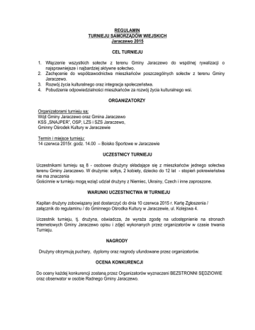 REGULAMIN TURNIEJU SAMORZĄDÓW WIEJSKICH Jaraczewo 2015 CEL TURNIEJU 1. Włączenie wszystkich sołectw z terenu Gminy Jaraczewo do wspólnej rywalizacji o najsprawniejsze i najbardziej aktywne sołectwo. 2. Zachęcenie do współzawodnictwa mieszkańców poszczególnych sołectw z terenu Gminy Jaraczewo. 3. Rozwój życia kulturalnego oraz integracja społeczeństwa. 4. Pobudzenie odpowiedzialności mieszkańców za rozwój życia kulturalnego wsi. ORGANIZATORZY Organizatorami turnieju są: Wójt Gminy Jaraczewo oraz Gmina Jaraczewo KSS „SNAJPER”, OSP, LZS i SZS Jaraczewo, Gminny Ośrodek Kultury w Jaraczewie Termin i miejsce turnieju: 14 czerwca 2015r. godz. 14.00 – Boisko Sportowe w Jaraczewie UCZESTNICY TURNIEJU Uczestnikami turnieju są 8 - osobowe drużyny składające się z mieszkańców jednego sołectwa terenu Gminy Jaraczewo. W drużynie: sołtys, 2 kobiety, dziecko do 12 lat - stopień pokrewieństwa nie ma znaczenia Gościnnie w turnieju mogą wziąć udział drużyny z Niemiec, Ukrainy, Czech i inne zaproszone. WARUNKI UCZESTNICTWA W TURNIEJU Kapitan drużyny zobowiązany jest dostarczyć do dnia 10 czerwca 2015 r. Kartę Zgłoszenia / załącznik do regulaminu / do Gminnego Ośrodka Kultury w Jaraczewie, ul. Kolejowa 4. Uczestnik turnieju, tj. drużyna, oświadcza, że wyraża zgodę na udostępnienie na stronach internetowych Gminy Jaraczewo opisu i zdjęć wykonanych przez organizatorów w czasie trwania Turnieju. NAGRODY Drużyny otrzymują puchary, dyplomy oraz nagrody ufundowane przez organizatorów. OCENA KONKURENCJI Do oceny każdej konkurencji zostaną przez Organizatorów wyznaczeni BEZSTRONNI SĘDZIOWIE oraz obserwator w osobie Radnego Gminy Jaraczewo. KONKURENCJE 1. Wyścig sołtysów Konkurencja na czas, drużyna w 5 osobowym składzie (4 osoby) + sołtys. Konkurencja polega na jak najszybszym przeniesieniu koca z sołtysem z linii startu do pachołka, okrążyć go i wrócić do mety. Wygrywa najszybsza drużyna. 4 drużyny jednocześnie. 2.Toczenie cytryny W konkurencji bierze udział 1 mężczyzna i 1 kobieta z drużyny. Konkurencja polega na jak najszybszym przetoczeniu cytryny kijem od szczotki slalomem do wyznaczonego punktu – tam przejmuje cytrynę następny zawodnik, który toczy ją, również slalomem, na linię startu. Wygrywa najszybsza drużyna. 4 drużyny jednocześnie. 3. Slalom na deszczułkach Konkurencja dla 1 dziecka z drużyny. Polega ona na pokonaniu trasy (do pachołka – okrążeniu go i powrót na linię startu) w jak najkrótszym czasie na specjalnych deskach. 4 drużyny jednocześnie. 4. Toczenie beczki Konkurencja dla drużyny (po 2 osoby z drużyny) Zawodnik toczy beczkę w stronę pachołka, okrąża go i wraca na start przekazując beczkę kolejnemu zawodnikowi. Konkurencja rozgrywana będzie na czas. Wygrywa drużyna, która ukończy zadanie w krótszym czasie. 4 drużyny jednocześnie. 5. Sadzenie i wykopki. W konkurencji bierze udział kobieta i mężczyzna z drużyny. Mężczyzna otrzymuje w koszyku ziemniaki, które ma „posadzić” w rozmieszczonych miejscach na trasie 20 m. Następnie wraca na linię startu, przekazuje koszyk kobiecie, która ma za zadanie przeprowadzić wykopki – czyli zebrać ziemniaki i wrócić na linię startu. 4 drużyny jednocześnie. 6. Rzut piłką lekarską. Konkurencja dla drużyn mieszanych: 3 osoby - kobieta, mężczyzna, dziecko do 12 roku życia, każdy z zawodników wykonuje 1 rzut piłką lekarską z wyznaczonego miejsca. Mierzone są wszystkie odległości, suma trzech rzutów decyduje o miejscu w konkurencji, technika i sposób rzutu dowolne 7. Rzut beretem. Konkurencja polega na jak najdalszym wyrzucie beretu ręką. Aby zachować sztywność podczas lotu beret wzmocniony jest naciągiem drucianym. Startuje jeden zawodnik z drużyny, który ma dwie próby. Odległości z poszczególnych prób nie sumują się. Wygrywa zawody ten, kto w swojej próbie odda rzut beretem na najdalszą odległość. 8. Ubijanie piany W konkurencji bierze udział 1 mężczyzna + 1 kobieta z drużyny . Mają do dyspozycji 3 jaja. Zadaniem kobiety jest oddzielić żółtko od białka a mężczyzny – ubić białko na sztywną pianę. Konkurencja rozgrywana będzie na czas. Wygrywa drużyna, której zawodnicy wykonają tę czynność najszybciej i po odwróceniu miski z pianą do góry dnem piana nie wypadnie. Narzędzia do konkurencji przygotowuje organizator. 9. (Konkurencja niespodzianka) 10. „STRZELANIE z KBKS” (strzelnica KSS „SNAJPER” w Jaraczewie) Jeden zawodnik z każdej drużyny, po oficjalnym otwarciu Turnieju Samorządów Wiejskich, po pierwszej konkurencji, udaje się na strzelnicę i na ogólnych zasadach strzeleckich obowiązujących w Klubie SNAJPER – oddaje 5 strzałów do tarczy + próbny. Liczone są punkty przez sędziów z Klubu SNAJPER. POSTANOWIENIA KOŃCOWE Organizatorzy nie biorą odpowiedzialności za szkody materialne uczestników podczas Turnieju. Organizatorzy Turnieju nie biorą odpowiedzialności za wszelkie urazy i kontuzje zawodników powstałe podczas konkurencji. Koszty przejazdu uczestników pokrywają uczestnicy konkursu. Ostateczna interpretacja regulaminu należy do organizatorów. Kwestie sporne rozstrzygać będzie komisja sędziowska, po wpłaceniu kaucji w wys. 50 zł na rzecz Organizatora. Regulamin w jego pełnym brzmieniu zostanie zamieszczony na stronie Organizatora, pod adresem www.gok.jaraczewo.pl Wszelkie pytania związane z konkursem prosimy kierować do Gminnego Ośrodka Kultury, Tel.62 740 8032.