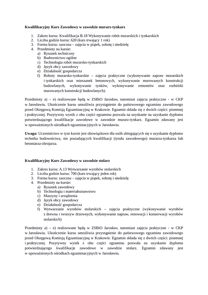 Kwalifikacyjny Kurs Zawodowy w zawodzie murarz-tynkarz 1. 2. 3. 4. Zakres kursu: Kwalifikacja B.18 Wykonywanie robót murarskich i tynkarskich Liczba godzin kursu: 620 (kurs trwający 1 rok) Forma kursu: zaoczna – zajęcia w piątek, sobotę i niedzielę Przedmioty na kursie: a) Rysunek techniczny b) Budownictwo ogólne c) Technologia robót murarsko-tynkarskich d) Język obcy zawodowy e) Działalność gospodarcza f) Roboty murarsko-tynkarskie – zajęcia praktyczne (wykonywanie zapraw murarskich i tynkarskich oraz mieszanek betonowych, wykonywanie murowanych konstrukcji budowlanych, wykonywanie tynków, wykonywanie remontów oraz rozbiórki murowanych konstrukcji budowlanych). Przedmioty a) – e) realizowane będą w ZSBiO Jarosław, natomiast zajęcia praktyczne - w CKP w Jarosławiu. Ukończenie kursu umożliwia przystąpienie do państwowego egzaminu zawodowego przed Okręgową Komisją Egzaminacyjną w Krakowie. Egzamin składa się z dwóch części: pisemnej i praktycznej. Pozytywny wynik z obu części egzaminu pozwala na uzyskanie na uzyskanie dyplomu potwierdzającego kwalifikacje zawodowe w zawodzie murarz-tynkarz. Egzamin zdawany jest w upoważnionych ośrodkach egzaminacyjnych w Jarosławiu. Uwaga: Uczestnictwo w tym kursie jest obowiązkowe dla osób ubiegających się o uzyskanie dyplomu technika budownictwa, nie posiadających kwalifikacji (tytułu zawodowego) murarza-tynkarza lub betoniarza-zbrojarza. Kwalifikacyjny Kurs Zawodowy w zawodzie stolarz 1. 2. 3. 4. Zakres kursu: A.13 Wytwarzanie wyrobów stolarskich Liczba godzin kursu: 700 (kurs trwający jeden rok) Forma kursu: zaoczna – zajęcia w piątek, sobotę i niedzielę Przedmioty na kursie: a) Rysunek zawodowy b) Technologia i materiałoznawstwo c) Maszyny i urządzenia d) Język obcy zawodowy e) Działalność gospodarcza f) Wytwarzanie wyrobów stolarskich – zajęcia praktyczne (wykonywanie wyrobów z drewna i tworzyw drzewnych, wykonywanie napraw, renowacji i konserwacji wyrobów stolarskich) Przedmioty a) – e) realizowane będą w ZSBiO Jarosław, natomiast zajęcia praktyczne - w CKP w Jarosławiu. Ukończenie kursu umożliwia przystąpienie do państwowego egzaminu zawodowego przed Okręgową Komisją Egzaminacyjną w Krakowie. Egzamin składa się z dwóch części: pisemnej i praktycznej. Pozytywny wynik z obu części egzaminu pozwala na uzyskanie dyplomu potwierdzającego kwalifikacje zawodowe w zawodzie stolarz. Egzamin zdawany jest w upoważnionych ośrodkach egzaminacyjnych w Jarosławiu. Kwalifikacyjny Kurs Zawodowy w zawodzie monter zabudowy i robót wykończeniowych w budownictwie 1. 2. 3. 4. Zakres kursu: Kwalifikacja B.05 Montaż systemów suchej zabudowy Liczba godzin kursu: 400 (kurs trwający pół roku) Forma kursu: zaoczna – zajęcia w piątek, sobotę i niedzielę Przedmioty na kursie: a) Rysunek techniczny b) Budownictwo ogólne c) Technologia systemów suchej zabudowy d) Język obcy zawodowy e) Działalność gospodarcza f) Montaż suchej zabudowy – zajęcia praktyczne (montaż ścian działowych, sufitów podwieszanych oraz obudowy konstrukcji dachowych w systemie suchej zabudowy, montaż okładzin ściennych i płyt podłogowych w systemie suchej zabudowy ). Przedmioty a) – e) realizowane będą w ZSBiO Jarosław, natomiast zajęcia praktyczne w CKP w Jarosławiu. Ukończenie kursu umożliwia przystąpienie do państwowego egzaminu zawodowego przed Okręgową Komisją Egzaminacyjną w Krakowie. Egzamin składa się z dwóch części: pisemnej i praktycznej. Pozytywny wynik z obu części egzaminu pozwala na uzyskanie świadectwa potwierdzającego kwalifikacje w zawodzie monter zabudowy i robót wykończeniowych w budownictwie w zakresie kwalifikacji B.05: Montaż systemów suchej zabudowy. Egzamin zdawany jest w upoważnionych ośrodkach egzaminacyjnych w Jarosławiu. Uwaga: Warunkiem uzyskania dyplomu potwierdzającego pełne kwalifikacje w zawodzie monter zabudowy i robót wykończeniowych w budownictwie jest uczestnictwo w kwalifikacyjnych kursach zawodowych i zdanie egzaminów dla kwalifikacji B.06 Wykonywanie robót malarskotapeciarskich i kwalifikacji B.07 Wykonywanie robót posadzkarsko-okładzinowych. Nie dotyczy to osób, które posiadają już kwalifikacje w zawodzie malarz-tapeciarz lub posadzkarz. Kwalifikacyjny Kurs Zawodowy w zawodzie technik budownictwa 1. Zakres kursu: B.30. Sporządzanie kosztorysów oraz przygotowywanie dokumentacji przetargowej 2. Liczba godzin kursu: 350 (kurs trwający pół roku) + 40 godzin (tydzień) praktyk w firmach budowlanych 3. Forma kursu: zaoczna – zajęcia w piątek, sobotę i niedzielę praktyka: forma stacjonarna w godzinach pracy firmy 4. Przedmioty na kursie: a) Rysunek techniczny i dokumentacja techniczna b) Podstawy budownictwa c) Konstrukcje budowlane d) Kosztorysowanie w budownictwie e) Język obcy zawodowy f) Działalność gospodarcza w budownictwie g) Kosztorysowanie i dokumentacja przetargowa – ćwiczenia (sporządzanie kosztorysów, przygotowywanie dokumentacji przetargowej) Wszystkie przedmioty realizowane będą w ZSBiO Jarosław. Ukończenie kursu umożliwia przystąpienie do państwowego egzaminu zawodowego przed Okręgową Komisją Egzaminacyjną w Krakowie. Egzamin składa się z dwóch części: pisemnej i praktycznej. Pozytywny wynik z obu części egzaminu pozwala na uzyskanie świadectwa potwierdzającego kwalifikacje w zawodzie technik budownictwa w zakresie kwalifikacji B.30: Sporządzanie kosztorysów oraz przygotowywanie dokumentacji przetargowej. Egzamin zdawany jest w upoważnionych ośrodkach egzaminacyjnych w Jarosławiu. Uwaga: Warunkiem uzyskania dyplomu potwierdzającego pełne kwalifikacje w zawodzie technik budownictwa jest uczestnictwo w kwalifikacyjnych kursach zawodowych i zdanie egzaminów dla kwalifikacji B.33 Organizacja i kontrolowanie robót budowlanych oraz dla wybranej jednej kwalifikacji z dwóch: B.18 Wykonywanie robót murarsko-tynkarskich lub B.16 Wykonywanie robót zbr