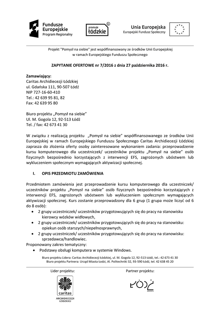 Projekt "Pomysł na siebie" jest współfinansowany ze środków Unii Europejskiej w ramach Europejskiego Funduszu Społecznego ZAPYTANIE OFERTOWE nr 7/2016 z dnia 27 października 2016 r. Zamawiający: Caritas Archidiecezji Łódzkiej ul. Gdańska 111, 90-507 Łódź NIP 727-16-60-410 Tel.: 42 639 95 81, 82 Fax: 42 639 95 80 Biuro projektu „Pomysł na siebie” Ul. M. Gogola 12, 92-513 Łódź Tel. / fax: 42 673 41 30 W związku z realizacją projektu „Pomysł na siebie” współfinansowanego ze środków Unii Europejskiej w ramach Europejskiego Funduszu Społecznego Caritas Archidiecezji Łódzkiej zaprasza do złożenia oferty osoby zainteresowane wykonaniem zadania: przeprowadzenie kursu komputerowego dla uczestniczek/ uczestników projektu „Pomysł na siebie” osób fizycznych bezpośrednio korzystających z interwencji EFS, zagrożonych ubóstwem lub wykluczeniem społecznym wymagających aktywizacji społecznej. I. OPIS PRZEDMIOTU ZAMÓWIENIA Przedmiotem zamówienia jest przeprowadzenie kursu komputerowego dla uczestniczek/ uczestników projektu „Pomysł na siebie” osób fizycznych bezpośrednio korzystających z interwencji EFS, zagrożonych ubóstwem lub wykluczeniem społecznym wymagających aktywizacji społecznej. Kurs zostanie przeprowadzony dla 6 grup (1 grupa może liczyć od 6 do 8 osób): 2 grupy uczestniczek/ uczestników przygotowujących się do pracy na stanowisku kierowcy wózków widłowych, 2 grupy uczestniczek/ uczestników przygotowujących się do pracy na stanowisku: opiekun osób starszych/niepełnosprawnych, 2 grupy uczestniczek/ uczestników przygotowujących się do pracy na stanowisku: sprzedawca/handlowiec. Proponowany zakres tematyczny: Podstawy obsługi komputera w systemie Windows. Biuro projektu Lidera: Caritas Archidiecezji Łódzkiej, ul. M. Gogola 12, 92-513 Łódź, tel.: 42 673 41 30 Biuro projektu Partnera: Urząd Miasta Łodzi, Al. Politechniki 32, 93-590 Łódź, tel. 42 638 45 20 Lider projektu: Partner projektu: Projekt "Pomysł na siebie" jest współfinansowany ze środków Unii Europejskiej w ramach Europejskiego Funduszu Społecznego Obsługa programów Office. Przeglądarka internetowa. Konta pocztowe. Ogłoszenia, mapy, komunikatory, bankowość elektroniczna. Multimedia. Ponadto kurs komputerowy powinien być dopasowany do umiejętności grup i będzie zawierał również zagadnienia związane z przyszłym zawodem i mogące być przydatne na danym stanowisku pracy np.: sklep internetowy, obsługa oprogramowania księgującego i fakturującego, a także magazynowego. Zajęcia odbywać się będą w biurze projektu, mieszczącym się w Łodzi, przy ulicy Mikołaja Gogola 12, w godz. 8:30-13:45 (I grupa) i 13:00-18:15 (II grupa). Zamawiający zastrzega, że zajęcia powinny odbywać się od poniedziałku do piątku. Zamawiający zastrzega, że liczba uczestników może ulec zmianie, o czym Wykonawca niezwłocznie zostanie poinformowany. Wynagrodzenie Wykonawcy stanowić będzie iloczyn ceny jednostkowej wymienionej w ofercie oraz liczby osób uczestniczących w szkoleniu (przy czym zaznacza się, że uczestnik/ uczestniczka projektu, który/która opuści więcej niż 20% zajęć szkoleniowych przewidzianych w harmonogramie projektu, może zostać wykluczony/a z udziału w tym projekcie o ile wcześniej nie przedstawił/a zwolnienia lekarskiego). Wykonawca w ramach realizacji zamówienia zobowiązany jest do: 1) przygotowania konspektu szkoleniowego na wzorze przesłanym przez Zamawiającego, 2) przeprowadzenie egzaminu wstępnego z wiedzy komputerowej na podstawie, którego uczestnicy zostaną podzieleni na grupy, 3) przygotowania raportu poszkoleniowego na wzorze przesłanym przez Zamawiającego, 4) przeprowadzenia egzaminu wewnętrznego końcowego, 5) informowania Zamawiającego o przebiegu realizacji kursu komputerowego i obecności uczestników, 6) przeprowadzenia ankiet ewaluacyjnych dostarczonych przez Zamawiającego. Wszystkie powyższe wymogi winne zostać zrealizowane i zapewnione w ramach kwoty jednostkowej brutto podanej w ofercie. Zamawiający zapewnia salę komputerową wyposażoną w odpowiedni sprzęt komputerowy. Biuro projektu Lidera: Caritas Archidiecezji Łódzkiej, ul. M. Gogola 12, 92-513 Łódź, tel.: 42 673 41 30 Biuro projektu Partnera: Urząd Miasta Łodzi, Al. Politechniki 32, 93-590 Łódź, tel. 42 638 45 20 Lider projektu: Partner projektu: Projekt "Pomysł na siebie" jest współfinansowany ze środków Unii Europejskiej w ramach Europejskiego Funduszu Społecznego Zamówienie wykonywane będzie w następujących terminach: ścieżka zawodowa: sprzedawca: 14.11-23.11.2016 r. (pierwsza grupa zajęcia w godz. 8:30-13:45, druga grupa zajęcia w godz. 13:00-18:15), ścieżka zawodowa: opiekun osoby starszej niepełnosprawnej: 24.11-5.12.2016 r. (pierwsza grupa zajęcia w godz. 8:30-13:45, druga grupa zajęcia w godz. 13:0018:15), ścieżka zawodowa: kierowca wózków widłowych: 6.12-15.12.2016 r. (pierwsza grupa zajęcia w godz. 8:30-13:45, druga grupa zajęcia w godz. 13:00-18:15). Zamawiający zastrzega jednak, że podane terminy mogą ulec zmianie, o czym Wykonawca zostanie niezwłocznie poinformowany. II. WYMAGANIA O udzielenie zamówienia mogą ubiegać się Wykonawcy, którzy: posiadają wykształcenie wyższe informatyczne, posiadają wiedzę i doświadczenie zawodowe w pracy szkoleniowca w obszarze tematycznym zgodnym z przedmiotem zamówienia, tj. min. 100 godzin udokumentowanego doświadczenia w okresie nie krótszym niż 24 miesiące bezpośrednio przed podjęciem zatrudnienia, są osobami fizycznymi lub osobami samozatrudnionymi (osobami fizycznymi prowadzącymi jednoosobową działalność gospodarczą, przy czym zaznacza się, że wykonawca będzie świadczył w projekcie usługi osobiście), posiadają aktualny wpis do Rejestru Instytucji Szkoleniowych, prowadzonego przez Wojewódzki Urząd Pracy właściwy dla siedziby instytucji szkoleniowej- w przypadku osób prowadzących jedno