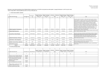 Załącznik Nr 7 do sprawozdania Prezydenta Miasta Pabianic z dnia 16 czerwca 2016 r. Informacja o stanie mienia komunalnego Gminy Miejskiej Pabianice obejmuje dane na 31.12.2015 rok i przygotowana została zgodnie z wymogami określonymi w art.267 ust.1 pkt 3 ustawy z dnia 27 sierpnia 2009 r o finansach publicznych ( Dz.U.Nr 157 poz. 1240 z późn. zm.) I. Wartość mienia zakładów i jednostek Lp Podmiot rodzaj użytkowania 1 2 Powierzchnia w ha 3 Wartość gruntu gr w 4 Wartość inwentarzowa majątku na 31.12.2014 brutto (w zł ) 5 Wartość inwentarzowa majątku na 31.12.2014 netto (w zł ) 6 Zwiększenia Zmniejszenia Brutto 7 8 Wartość inwentarzowa majątku na 31.12.2015 brutto ( w zł) Wartość inwentarzowa majątku na 31.12.2015 netto ( w zł) Uwagi 9 10 11 1 Zakład Gospodarki Mieszkaniowej 50,1084 16 315 586,25 73 229 880 22 480 525 968 403 1 380 334 72 817 949 22 045 760 Przekazanie gruntów przez Gminę w zwykły zarząd, przejęcie gruntów na których mieścił się Żłobek oraz nakładów inwestycyjnych na remont i adaptację pomieszczeń , sprzedaż udziałów we własności gruntów na rzecz prywatnych właścicieli,zniesieni współwłasności oraz przekazanie gruntów współwłaścicielom, przejęcie nieruchomości zabudowanej ul.Konopnoicka 39,przejęcie sieci elekt. i logistycznej w budynku ul.Kościuszki 22/26, przejęcie w zarząd spółdzielczego własnościowego lokalu ul.Moniuszki 118/120 lok.nr 32,Łaska94 lok.64,przejęcie w zwykły zarząd budynku ul.Cicha 43-umowa zamiany z PSM,przyjęcie dwóch nieruchomości lokalowych ul. Waryńskiego 9/3,św.Rocha 6/3,wykonanie przyłącza kanalizacji sanitarnej ul.Targowa 20, Konopna 20, wykup lokali mieszkalnych, rozbiórka bud.gosp. ul.Żwiki i Wigury 8 ,Kościuszki 8/10,Kościuszki 8, Żeromskiego 13, sprzedaż nieruchomości zabudowanych ul.Kochanowskiego33,33A,Partyzancka 45,Kamienna 28A,P.Skargi 37,Pułaskiego 12, przekazanie 2 lokali PSM na podstawie umowy zamiany, zakup komputerów,drukarek i urządzeń wielofunkcyjnych 2 Miejski Zakład Pogrzebowy 9,3119 2 382 359,90 2 574 292 1 172 690 143 517 14 008 2 703 801 1 161 247 zakup samochodu typu karawan,otrzymanie nieodpłatne samochodu osobowego, zakup sprzętu i urządzeń na doposażenie zakładu 3 Zarząd Dróg i Zieleni Miejskiej 155,4653 39 492 458,24 48 425 715 22 371 381 27 333 270 026 48 183 022 20 262 742 4 Miejski Ośrodek Sportu i Rekreacji 30,5342 7 627 443,16 23 040 018 13 286 430 157 522 529 442 22 668 098 12 604 044 sprzedaż przecinarki,zagęszczarki,koparko-spycharki,pługa samochodów, barokowozu, przekazanie garaży blaszanych przyjęcie odkurzacza do zbieranie drobnych odpadów, Likwidacja budynku magazynowego. kortów tenisowych,trybun-widowni,karuzeli basenu kąpielowego,brodzika, boiska do piłki ręcznej,tablic wyników, lin torów basenowych,odkurzacza basenowego,kosiarki, pilarki,komputerów,drukarek, zakup specjalistycznych urządzeń do prac bieżących na obiekcie,nieodpłatne otrzymanie przyłącza kanalizacyjno-sanitarnego 5 Środowiskowy Dom Samopomocy 0,3626 727 484,00 1 765 001 1 311 346 3 105 16 095 1 752 011 1 255 297 Zakup sprzętu AGD, likwidacji zużytego wyposażenia placówki 0,00 0,00 1 531 068 4 564 101 152 38 755 1 593 465 16 604 zakup serwera,laptopa sprzętu biurowego i wyposażenia, przekazanie kserokopiarek,likwidacja zużytego sprzętu biurowego 0,2002 50 009,96 681 657 217 955 18 550 1 100 699 106 219 726 Zakup maszyny rozdrabniacza kości, zakup zasilacza, monitora i licencji,likwidacja zużytego sprzętu 245,9826 66 595 341,51 151 247 630 60 844 891 1 419 582 2 249 759 150 417 453 57 565 420 Wartość inwentarzowa majątku na 31.12.2013 r netto (w zł ) Zmniejszenia Wartość gruntu w zł Wartość inwentarzowa majątku na 31.12.2013 r. brutto (w zł ) Zwiększenia Powierzchnia w ha 3 4 5 6 7 6 Miejskie Centrum Pomocy Społecznej 7 Schronisko dla zwierząt Razem I II .Wartość pozostałego mienia Lp Podmiot rodzaj użytkowania 1 2 I Własność Gminy Miejskiej Pabianice 236,7003 A Grunty rolne o przeznaczeniu rolnym 8,8500 w tym wydzierżawione na cele rolne Dzierżawa i najem gruntów B inwestycyjnych 4,5028 12,6795 w tym wydzierżawione na cele rolne 2,7660 Grunty oddane w użytkowanie (ogrody C działkowe,spółdzielnie pracy) 33,8184 D Grunty użytkowane przez MZP 5,4042 Brutto 8 Wartość inwentarzowa Wartość inwentarzowa majątku na 31.12.2014 majątku na 31.12.2014 r brutto ( w zł) r netto ( w zł) 9 10 Uwagi 11 Pozostałe grunty w zasobie (parki,wykupy wg mpzp,odłogi, planowana strefa, rezerwa pod mieszkalnictwo wielorodzinne-MW i E zieleń publiczna -ZP) 167,2046 F Pabianickie Centrum Medyczne sp z o.o. 8,7436 II Zasoby poza terenem Pabianic 9,6713 A Gmina Dobroń-Dobroń Poduchowny 6,1942 B Gmina Pabianice -Szynkielew 1,6594 C Gmina Pabianice -Piątkowisko Gmina Pabianice D Hermanów,Bychlew,Jadwinin 0,2967 E Gmina Łódź -Łaskowice 1,3638 0,1572 Grunty stanowiące własność Gminy Miejskiej Pabianice ,oddane w III użytkowanie wieczyste w tym: 174,7461 Mieszkalnictwo,handel,usługi A ,rzemiosło,garaże ,przemysł 149,4261 B Ogrody działkowe 25,3200 Łącznie grunty Wydziału Gospodarki Nieruchomościami 1 Infrastruktura społeczna 421,1177 105 572 586,33 18,7869 13 366 900,72 36 870 797 12 292 673 2 647 807 6 345 415 33 173 189 10 038 224 0 A Przedszkola 5,0596 5 385 480,92 7 991 066 2 699 744 188 074 37 691 8 141 449 2 617 362 Doposażenie placówek w pomoce dydaktyczne, uzupełnienie podstawowego wyposażenia placówek, zakup maszyn ogrodniczych, sprzętu AGD, zakup programu komputerowego oraz likwidacja zużytego sprzętu B Szkoły 12,6857 7 721 227,90 19 153 581 4 725 125 812 841 297 063 19 669 359 4 838 997 Modernizacja sali gimnastycznej, przekazanie placu zabaw „Podwórko Nivea” zakup doposażenia w pomoce dydaktyczne C Żłobek 0,7414 185 201,94 1 332 500 567 154 1 533 826 153 149 2 713 177 1 972 586 Przebudowa istniejącego II oddz..Żłobka-ul.Moniuszki 146,przekazanie nie