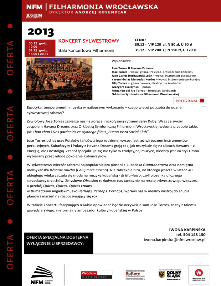 30.12 godz. 19.00 31.12 godz. 18.00 i 20.30 KONCERT SYLWESTROWY Sala koncertowa Filharmonii CENA : 30.12 - VIP 120 zł, N 80 zł, U 60 zł 31.12 - VIP 200 zł, N 150 zł, U 120 zł Wykonawcy: Jose Torres & Havana Dreams: Jose Torres – wokal, gitara, tres lead, prowadzenie koncertu Juan Carlos Hechavarria León – wokal, instrument perkusyjne Yaremi de las Mercedes Kordos – wokal, instrumenty perkusyjne Filip Torres – gitara basowa, elektryczny kontrabas Grzegorz Turczyński – puzon Fernando del Rio Torres – fortepian, keyboards Orkiestra Symfoniczna Filharmonii Wrocławskiej Egzotyka, temperament i muzyka w najlepszym wykonaniu – czego więcej potrzeba do udanej sylwestrowej zabawy? Żywiołowy Jose Torres zabierze nas na gorącą, rozkołysaną rytmem salsy Kubę. Wraz ze swoim zespołem Havana Dreams oraz Orkiestrą Symfoniczną Filharmonii Wrocławskiej wykona przeboje takie, jak Chan chan i Dos gardenias ze słynnego filmu „Buena Vista Social Club”. Jose Torres od lat uczy Polaków tańców z jego rodzinnej wyspy, jest też wirtuozem instrumentów perkusyjnych. Kubańczycy i Polacy z Havana Dreams grają tak, jak muzykuje się na ulicach Hawany – z energią, ale i nostalgią. Zespół specjalizuje się nie tylko w tradycyjnej muzyce, nieobcy jest im styl Timba wybierany przez młode pokolenie Kubańczyków. W sylwestrowy wieczór zabrzmi najpopularniejsza piosenka kubańska Guantanamera oraz namiętna meksykańska Bésame mucho (Całuj mnie mocno). Nie zabraknie hitu, od którego jeszcze w latach 40. ubiegłego wieku zaczęła się moda na muzykę kubańską - El Manisero, czyli piosenka ulicznego sprzedawcy orzechów. Zmysłowe Obsesion rozkołysze nas tanecznie na resztę sylwestrowego wieczoru, a przebój Quizás, Quizás, Quizás (znany w tłumaczeniu angielskim jako Perhaps, Perhaps, Perhaps) wprawi nas w idealny nastrój do snucia planów i marzeń na rozpoczynający się rok. W trakcie koncertu fascynująco o Kubie opowiadać będzie oczywiście sam Jose Torres, znany z talentu gawędziarskiego, nieformalny ambasador kultury kubańskiej w Polsce IWONA KARPIŃSKA tel. 504 148 150 [email protected]