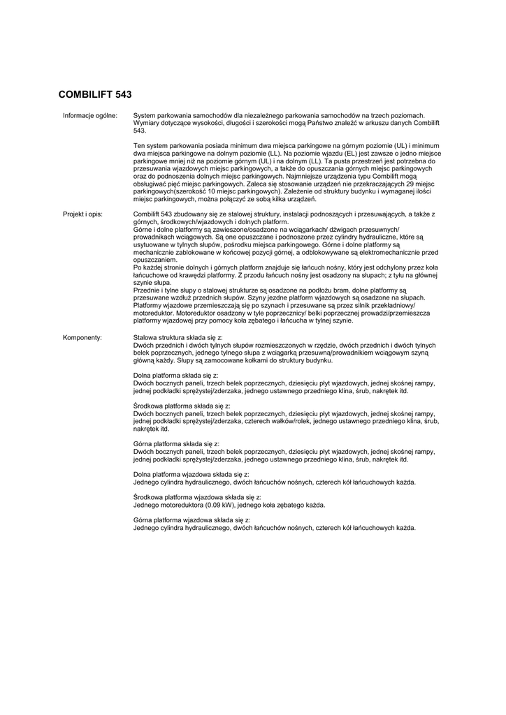 COMBILIFT 543 Informacje ogólne: System parkowania samochodów dla niezaleŜnego parkowania samochodów na trzech poziomach. Wymiary dotyczące wysokości, długości i szerokości mogą Państwo znaleźć w arkuszu danych Combilift 543. Ten system parkowania posiada minimum dwa miejsca parkingowe na górnym poziomie (UL) i minimum dwa miejsca parkingowe na dolnym poziomie (LL). Na poziomie wjazdu (EL) jest zawsze o jedno miejsce parkingowe mniej niŜ na poziomie górnym (UL) i na dolnym (LL). Ta pusta przestrzeń jest potrzebna do przesuwania wjazdowych miejsc parkingowych, a takŜe do opuszczania górnych miejsc parkingowych oraz do podnoszenia dolnych miejsc parkingowych. Najmniejsze urządzenia typu Combilift mogą obsługiwać pięć miejsc parkingowych. Zaleca się stosowanie urządzeń nie przekraczających 29 miejsc parkingowych(szerokość 10 miejsc parkingowych). ZaleŜenie od struktury budynku i wymaganej ilości miejsc parkingowych, moŜna połączyć ze sobą kilka urządzeń. Projekt i opis: Combilift 543 zbudowany się ze stalowej struktury, instalacji podnoszących i przesuwających, a takŜe z górnych, środkowych/wjazdowych i dolnych platform. Górne i dolne platformy są zawieszone/osadzone na wciągarkach/ dźwigach przesuwnych/ prowadnikach wciągowych. Są one opuszczane i podnoszone przez cylindry hydrauliczne, które są usytuowane w tylnych słupów, pośrodku miejsca parkingowego. Górne i dolne platformy są mechanicznie zablokowane w końcowej pozycji górnej, a odblokowywane są elektromechanicznie przed opuszczaniem. Po kaŜdej stronie dolnych i górnych platform znajduje się łańcuch nośny, który jest odchylony przez koła łańcuchowe od krawędzi platformy. Z przodu łańcuch nośny jest osadzony na słupach; z tyłu na głównej szynie słupa. Przednie i tylne słupy o stalowej strukturze są osadzone na podłoŜu bram, dolne platformy są przesuwane wzdłuŜ przednich słupów. Szyny jezdne platform wjazdowych są osadzone na słupach. Platformy wjazdowe przemieszczają się po szynach i przesuwane są przez silnik przekładniowy/ motoreduktor. Motoreduktor osadzony w tyle poprzecznicy/ belki poprzecznej prowadzi/przemieszcza platformy wjazdowej przy pomocy koła zębatego i łańcucha w tylnej szynie. Komponenty: Stalowa struktura składa się z: Dwóch przednich i dwóch tylnych słupów rozmieszczonych w rzędzie, dwóch przednich i dwóch tylnych belek poprzecznych, jednego tylnego słupa z wciągarką przesuwną/prowadnikiem wciągowym szyną główną kaŜdy. Słupy są zamocowane kołkami do struktury budynku. Dolna platforma składa się z: Dwóch bocznych paneli, trzech belek poprzecznych, dziesięciu płyt wjazdowych, jednej skośnej rampy, jednej podkładki spręŜystej/zderzaka, jednego ustawnego przedniego klina, śrub, nakrętek itd. Środkowa platforma składa się z: Dwóch bocznych paneli, trzech belek poprzecznych, dziesięciu płyt wjazdowych, jednej skośnej rampy, jednej podkładki spręŜystej/zderzaka, czterech wałków/rolek, jednego ustawnego przedniego klina, śrub, nakrętek itd. Górna platforma składa się z: Dwóch bocznych paneli, trzech belek poprzecznych, dziesięciu płyt wjazdowych, jednej skośnej rampy, jednej podkładki spręŜystej/zderzaka, jednego ustawnego przedniego klina, śrub, nakrętek itd. Dolna platforma wjazdowa składa się z: Jednego cylindra hydraulicznego, dwóch łańcuchów nośnych, czterech kół łańcuchowych kaŜda. Środkowa platforma wjazdowa składa się z: Jednego motoreduktora (0.09 kW), jednego koła zębatego kaŜda. Górna platforma wjazdowa składa się z: Jednego cylindra hydraulicznego, dwóch łańcuchów nośnych, czterech kół łańcuchowych kaŜda. Agregat hydrauliczny: Górne i dolne platformy są napędzane jednym agregatem hydraulicznym. Silnik elektryczny z pompą jest osadzony na podkładkach gumowych złączonych z metalem. Agregat hydrauliczny składa się ze zbiornika oleju z odpowiednim wypełnieniem dla całego systemu, pompy zębatej, silnika elektrycznego (1.5 kW [3:0 kW for Comfort Type], 230/400 V, 50 Hz), skrzynki sterowniczej ze stycznikiem silnikowym i przekaźnikiem cieplnym gotowym do połączenia, zaworu dekompresyjnego i jednego przewodu hydraulicznego redukującego zakłócenia w rurach hydraulicznych Szczegóły dotyczące bezpieczeństwa: Przekładnie luźnego łańcucha monitorują łańcuchy nośne pod względem luzu, czy zerwania. Mechanicznie zamocowane urządzenie w górnej pozycji końcowej. System moŜe być tylko obsługiwany z bramami. Bramy mogą być zamknięte elektromechanicznie, a otwarte mogą być tylko wtedy, gdy wybrane miejsce parkingowe osiągnie swoją pozycję parkowania i wszystkie otwarcia są bezpiecznie zamknięte. Bramy: Z powodu pustej przestrzeni obszar wjazdowy do Combilift musi być zabezpieczony zgodnie z miejscowymi regulacjami bezpieczeństwa. Standardowa wersja z ręcznie sterowanymi bramami przesuwnymi (cienka blacha ze szczelinami wentylacyjnymi) naprzeciwko kaŜdej siatki. Dla systemów w podziemiu drzwi bram z cienkiej blachy (cynkowane na gorąco/cynkowane ogniowo jak w normie EN DIN 10326 NA 275 g / sqm, ok. 20 µm warstwa cynku). W systemach naziemnych bramy z cienkiej blachy powlekanej proszkiem (grubość warstwy ok. 60 - 80 µ m, RAL 7030, koloru szarego kamienia). Opcjonalnie, elektrycznie sterowane bram (24 W) moŜe być dostarczone za dodatkową opłatą.