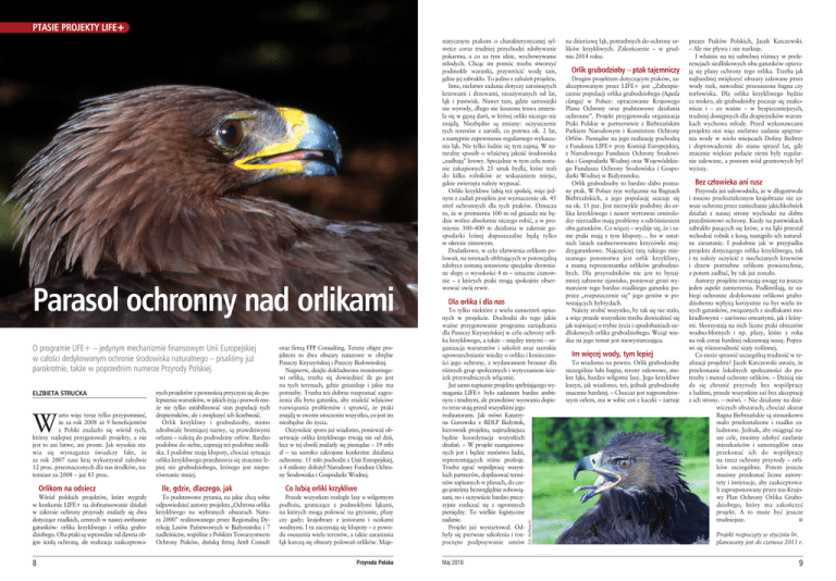 ptasie projekty life+ O programie LIFE+ – jedynym mechanizmie finansowym Unii Europejskiej w całości dedykowanym ochronie środowiska naturalnego – pisaliśmy już parokrotnie, także w poprzednim numerze Przyrody Polskiej. ElzbiEtaStrucka W arto więc teraz tylko przypomnieć, że za rok 2008 aż 9 beneficjentów z Polski znalazło się wśród tych, którzy najlepiej przygotowali projekty, a nie jest to ani łatwe, ani proste. Jak wysokie stawia się wymagania świadczy fakt, że za rok 2007 nasz kraj wykorzystał zaledwie 12 proc. przeznaczonych dla nas środków, natomiast za 2008 – już 83 proc. orlikom na odsiecz Wśród polskich projektów, które wygrały w konkursie LIFE+ na dofinansowanie działań w zakresie ochrony przyrody znalazły się dwa dotyczące rzadkich, cennych w naszej awifaunie gatunków: orlika krzykliwego i orlika grubodziobego. Oba ptaki są wprawdzie od dawna objęte ścisłą ochroną, ale realizacja zaakceptowa- 8 nych projektów z pewnością przyczyni się do polepszenia warunków, w jakich żyją i pozwoli może nie tylko ustabilizować stan populacji tych drapieżników, ale i zwiększyć ich liczebność. Orlik krzykliwy i grubodzioby, mimo zdrobniale brzmiącej nazwy, są prawdziwymi orłami – należą do podrodziny orłów. Bardzo podobne do siebie, zajmują też podobne siedliska. I podobne mają kłopoty, chociaż sytuacja orlika krzykliwego przedstawia się znacznie lepiej niż grubodziobego, którego jest nieporównanie mniej. ile, gdzie, dlaczego, jak To podstawowe pytania, na jakie chcą sobie odpowiedzieć autorzy projektu „Ochrona orlika krzykliwego na wybranych obszarach Natura 2000” realizowanego przez Regionalną Dyrekcję Lasów Państwowych w Białymstoku i 7 nadleśnictw, wspólnie z Polskim Towarzystwem Ochrony Ptaków, duńską firmą Amfi Consult oraz firmą FPP Consulting. Tereny objęte projektem to dwa obszary naturowe w obrębie Puszczy Knyszyńskiej i Puszczy Białowieskiej. Najpierw, dzięki dokładnemu monitoringowi orlika, trzeba się dowiedzieć ile go jest na tych terenach, gdzie gniazduje i jakie ma potrzeby. Trzeba też dobrze rozpoznać zagrożenia dla bytu gatunku, aby znaleźć właściwe rozwiązania problemów i sprawić, że ptaki znajdą w swoim otoczeniu wszystko, co jest im niezbędne do życia. Oczywiście sporo już wiadomo, ponieważ obserwacje orlika krzykliwego trwają nie od dziś, lecz w tej chwili znalazły się pieniądze – 19 mln zł – na szeroko zakrojone konkretne działania ochronne. 15 mln pochodzi z Unii Europejskiej, a 4 miliony dołożył Narodowy Fundusz Ochrony Środowiska i Gospodarki Wodnej. Co lubią orliki krzykliwe Przede wszystkim rozległe lasy o wilgotnym podłożu, graniczące z podmokłymi łąkami, na których mogą polować na gryzonie, płazy czy gady; krajobrazy z jeziorami i oczkami wodnymi. I tu zaczynają się kłopoty – z powodu osuszenia wielu terenów, a także zarastania łąk kurczą się obszary polowań orlików. MajePrzyroda Polska Dla orlika i dla nas To tylko niektóre z wielu zamierzeń opisanych w projekcie. Dochodzi do tego jakże ważne przygotowanie programu zarządzania dla Puszczy Knyszyńskiej w celu ochrony orlika krzykliwego, a także – między innymi – organizacja warsztatów i szkoleń oraz szerokie upowszechnianie wiedzy o orliku i konieczności jego ochrony, z wydawaniem broszur dla różnych grup społecznych i wytyczaniem ścieżek przyrodniczych włącznie. Już samo napisanie projektu spełniającego wymagania LIFE+ było zadaniem bardzo ambitnym i trudnym, ale prawdziwe wyzwania dopiero teraz stoją przed wszystkimi jego realizatorami. Jak mówi Katarzyna Gurowska z RDLP Białystok, kierownik projektu, najtrudniejsza będzie koordynacja wszystkich działań. – W projekt zaangażowanych jest i będzie mnóstwo ludzi, reprezentujących różne profesje. Trzeba zgrać współpracę wszystkich partnerów, dopilnować terminów zapisanych w planach, do czego jesteśmy bezwzględnie zobowiązani, no i oczywiście bardzo precyzyjnie rozliczać się z ogromnych pieniędzy. To wielkie logistyczne zadanie. Projekt już wystartował. Odbyły się pierwsze szkolenia i rozpoczęto podpisywanie umów Fot. Archiwum parasol ochronny nad orlikami statycznym ptakom o charakterystycznej sylwetce coraz trudniej przychodzi zdobywanie pokarmu, a co za tym idzie, wychowywanie młodych. Chcąc im pomóc trzeba stworzyć podmokłe warunki, przywrócić wodę tam, gdzie jej zabrakło. To jedno z założeń projektu. Inne, niełatwe zadanie dotyczy zarośniętych krzewami i drzewami, nieużywanych od lat, łąk i pastwisk. Nawet tam, gdzie samosiejki nie wyrosły, długo nie koszona trawa zmieniła się w gęstą darń, w której orliki niczego nie znajdą. Niezbędne są zmiany: oczyszczenie tych terenów z zarośli, co potrwa ok. 2 lat, a następnie zapewnienie regularnego wykaszania łąk. Nie tylko ludzie się tym zajmą. W naturalny sposób o właściwą jakość środowiska „zadbają” krowy. Specjalnie w tym celu zostanie zakupionych 25 sztuk bydła, które trafi do kilku rolników ze wskazaniem miejsc, gdzie zwierzęta należy wypasać. Orliki krzykliwe lubią też spokój, więc jednym z zadań projektu jest wyznaczenie ok. 45 stref ochronnych dla tych ptaków. Oznacza to, że w promieniu 100 m od gniazda nie będzie wolno absolutnie niczego robić, a w promieniu 300–400 m działania w zakresie gospodarki leśnej dopuszczalne będą tylko w okresie zimowym. Dodatkowo, w celu ułatwienia orlikom polowań, na terenach obfitujących w potencjalną zdobycz zostaną ustawione specjalne drewniane słupy o wysokości 4 m – sztuczne czatownie – z których ptaki mogą spokojnie obserwować swój rewir. Maj 2010 na dzierżawę łąk, potrzebnych do ochrony orlików krzykliwych. Zakończenie – w grudniu 2014 roku. orlik grubodzioby – ptak tajemniczy Drugim projektem dotyczącym ptaków, zaakceptowanym przez LIFE+ jest „Zabezpieczenie popu