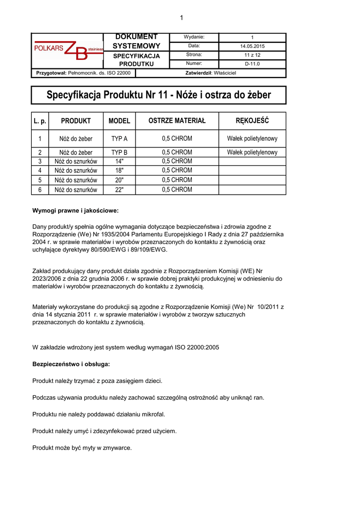 Specyfikacja Produktu Nr 11 - Nóże i ostrza do żeber