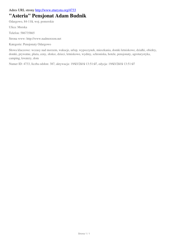 Adres URL strony http://www.eturysta.org/4733 "Asteria" Pensjonat Adam Budnik Odargowo, 84-110, woj. pomorskie Ulica: Morska Telefon: 586735865 Strona www: http://www.nadmorzem.net Kategorie: Pensjonaty Odargowo Słowa kluczowe: wczasy nad morzem, wakacje, urlop, wypoczynek, mieszkania, domki letniskowe, działki, obiekty, domki, prywatne, plaża, ceny, słońce, dzieci, letniskowe, wydmy, schroniska, hotele, pensjonaty, agroturystyka, camping, kwatery, dom Numer ID: 4733, liczba odsłon: 387, aktywacja: 19/03/2010 13:51:07, edycja: 19/03/2010 13:51:07 Strona 1 / 1