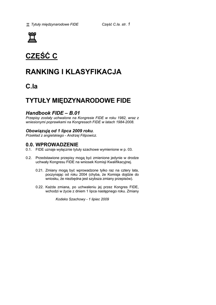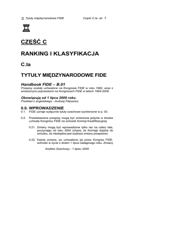 R Tytuły międzynarodowe FIDE Część C.Ia. str. 1 R CZĘŚĆ C RANKING I KLASYFIKACJA C.Ia TYTUŁY MIĘDZYNARODOWE FIDE Handbook FIDE – B.01 Przepisy zostały uchwalone na Kongresie FIDE w roku 1982, wraz z wniesionymi poprawkami na Kongresach FIDE w latach 1984-2008. Obowiązują od 1 lipca 2009 roku. Przekład z angielskiego - Andrzej Filipowicz. 0.0. WPROWADZENIE 0.1. FIDE uznaje wyłącznie tytuły szachowe wymienione w p. 03. 0.2. Przedstawione przepisy mogą być zmienione jedynie w drodze uchwały Kongresu FIDE na wniosek Komisji Kwalifikacyjnej. 0.21. Zmiany mogą być wprowadzone tylko raz na cztery lata, poczynając od roku 2004 (chyba, że Komisja dojdzie do wniosku, że niezbędna jest szybsza zmiany przepisów). 0.22. Każda zmiana, po uchwaleniu jej przez Kongres FIDE, wchodzi w życie z dniem 1 lipca następnego roku. Zmiany Kodeks Szachowy - 1 lipiec 2009 Część C.Ia. str. 2 R Tytuły międzynarodowe FIDE te będą obowiązywać w turniejach rozpoczętych w tym dniu lub później. 0.3. Międzynarodowe tytuły FIDE są w gestii Komisji Kwalifikacyjnej FIDE, która ma decydujący głos przy ich nadawaniu. Ustanowione zostały następujące międzynarodowe tytuły FIDE: 0.31. Tytuły w grze bezpośredniej w szachach standardowych (definicja w art. 1.14), wnioskowane przez Komisję Kwalifikacyjną: – arcymistrz GM – mistrz międzynarodowy IM – mistrz FIDE FM – kandydat na mistrza FIDE CM – arcymistrzyni WGM – mistrzyni międzynarodowa WIM – mistrzyni FIDE WFM – kandydatka na mistrzynię FIDE WCM 0.32. Tytuły w kompozycji szachowej są nadawane przez Stałą Komisję Kompozycji Szachowej FIDE (PCCC): - arcymistrz w rozwiązywaniu zadań szachowych (Grandmaster of Solving - GS), - mistrz międzynarodowy w rozwiązywaniu zadań szachowych (International Master of Solving IMS), - mistrz FIDE w rozwiązywaniu zadań szachowych (FIDE Master of Solving - FMS), - arcymistrz kompozycji szachowej (Grandmaster of Composing - GMC), - mistrz międzynarodowy kompozycji szachowej (International Master of Composing - IMC), - mistrz FIDE kompozycji szachowej (FIDE Master of Composing - FMC), - sędzia klasy międzynarodowej kompozycji szachowej (International Judge of Composing - IJCC). 0.33. Tytuły w grze korespondencyjnej są nadawane przez Międzynarodową Federację Szachową Gry Korespondencyjnej (International Correspondence Chess Federation - ICCF). Kodeks Szachowy - 1 lipiec 2009 R Tytuły międzynarodowe FIDE 0.34. 0.4. 0.5. Część C.Ia. str. 3 Tytuł Międzynarodowego Organizatora FIDE (International Organizer - IO). Tytuł jest nadawany przez Komisję Kwalifikacyjną. Nadane tytuły są ważne dożywotnio, licząc od daty nadania lub rejestracji. 0.41. Użycie nadanego przez FIDE tytułu szachowego lub rankingu w sposób sprzeczny z zasadami etyki sportowej w zakresie wymogów klasyfikacyjnych i rankingowych, może narazić osobę utytułowaną na cofnięcie tytułu na wniosek Komisji Kwalifikacyjnej, po podjęciu uchwały przez Kongres FIDE. 0.42. Tytuł jest oficjalnie ważny z dniem wypełnienia wszystkich warunków i wymogów. Ale zatwierdzenie tytułu na podstawie uzasadnionego wniosku wymaga prezentacji tego wniosku w witrynie Internetowej FIDE wraz z pełną dokumentacją przez okres przynajmniej 60 dni. Jeżeli chodzi o tytuły rejestrowane automatycznie - patrz art. 0.5. 0.43. Tytuł danego zawodnika jest ważny dla rezultatów jego przeciwników, w turnieju rozpoczynającym się po zatwierdzeniu tytułu. 0.44. W sytuacji, w której przykładowo chodzi o podkreślenie wieku zawodnika zdobywającego tytuł, decyduje późniejsza data - albo wypełnienie ostatniej normy alb osiągnięcie wymogu rankingowego. Definicje Sformułowania używane w niniejszych przepisach: Wynik rankingowy (Rating performance) jest oparty na rezultatach zawodnika i średnim rankingu przeciwników. Kodeks Szachowy - 1 lipiec 2009 Część C.Ia. str. 4 R Tytuły międzynarodowe FIDE Wynik rankingowy wymagany do tytułu (Title performance for example GM performance) - przykładowo wynik rankingowy wymagany dla tytułu GM, jest rezultatem zawodnika, odpowiadającym wynikowi rankingowemu zdefiniowanemu w art. 1.48 i 1.49, w zależności od średniego rankingu przeciwników i biorąc pod uwagę art. 1.46 dla danego tytułu. Przykładowo wynik rankingowy GM >=2600 można uzyskać tylko przy średnim rankingu przeciwników >= 2380. Taką normę uzyskuje się przykładowo za rezultat 7 punktów z 9 partii. Wynik rankingowy wymagany do tytułu, to uzyskanie przez zawodnika następujących lub wyższych rezultatów rankingowych w turniejach o średnim rankingu przeciwników zestawionych w tabelce: Wynik średni ranking Arcymistrz GM >=2600 >=2380 Mistrz międzynarodowy IM >=2450 >=2230 Arcymistrzyni WGM >=2400 >=2180 Mistrzyni międzynarodowa WIM >=2250 >=2030 Norma na tytuł (Title norm) obejmuje wynik rankingowy wymagany do tytułu oraz inne dodatkowe wymagania, jak odpowiednie liczby przeciwników z tytułami i z różnych federacji, zgodnie z art. 1.42 do 1.47. Kategoria turnieju. W poprzednich latach kategoria turnieju była podstawą do ustalania norm na tytuły. Obecnie ten termin jest używany tylko w celu opisania siły turniejów kołowych. Kategorie turniejów kołowych wynikają ze średniego rankingu wszystkich uczestników turnieju. W turniejach granych systemem szwajcarskim kategoria jest obliczana jako średni ranking zawodnika i jego przeciwników. Kategoria I oznacza średni ranking w granicach 2251-2275, kategoria druga 2276-2300 itd. Odpowiednio dla turniejów kobiecych kategoria I, to średni ranking w granicach 2051-2275, a druga to 2076-2100. Kodeks Szachowy - 1 lipiec 2009 R Tytuły międzynarodowe FIDE Część C.Ia. str. 5 Tytuły rejestrowane (nadawane automatycznie) są tytułami zdobytymi za osiągnięcia sportowe, zajęcie odpowiedniego miejsca lub osiągnięcie wymaganego wyniku sportowego, np. wygranie zawodów lub osiągnięcie rezultatu >=50% w tur